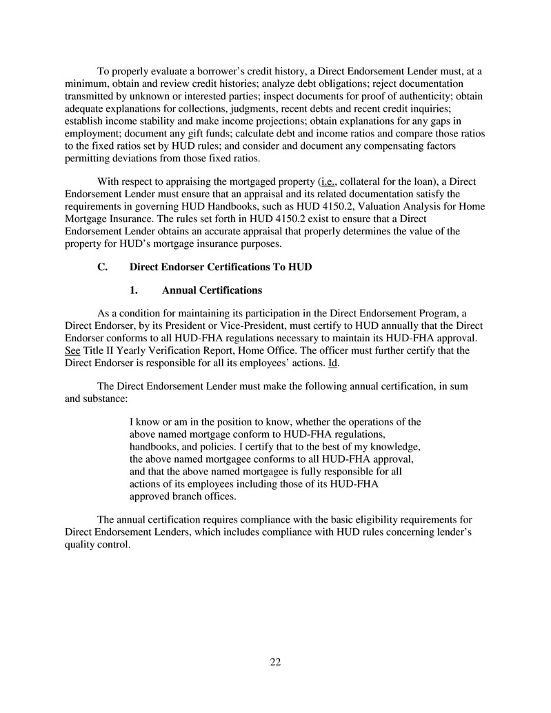 To properly evaluate a borrower’s credit history, a Direct Endorsement Lender must, at a minimum, obtain and review credit histories; analyze debt obligations; reject documentation transmitted by unknown or interested parties; inspect documents for proof of authenticity; obtain adequate explanations for collections, judgments, recent debts and recent credit inquiries; establish income stability and make income projections; obtain explanations for any gaps in employment; document any gift funds; calculate debt and income ratios and compare those ratios to the fixed ratios set by HUD rules; and consider and document any compensating factors permitting deviations from those fixed ratios. With respect to appraising the mortgaged property (i.e., collateral for the loan), a Direct Endorsement Lender must ensure that an appraisal and its related documentation satisfy the requirements in governing HUD Handbooks, such as HUD 4150.2, Valuation Analysis for Home Mortgage Insurance. The rules set forth in HUD 4150.2 exist to ensure that a Direct Endorsement Lender obtains an accurate appraisal that properly determines the value of the property for HUD’s mortgage insurance purposes. C. Direct Endorser Certifications To HUD 1. Annual Certifications As a condition for maintaining its participation in the Direct Endorsement Program, a Direct Endorser, by its President or Vice-President, must certify to HUD annually that the Direct Endorser conforms to all HUD-FHA regulations necessary to maintain its HUD-FHA approval. See Title II Yearly Verification Report, Home Office. The officer must further certify that the Direct Endorser is responsible for all its employees’ actions. Id. The Direct Endorsement Lender must make the following annual certification, in sum and substance: I know or am in the position to know, whether the operations of the above named mortgage conform to HUD-FHA regulations, handbooks, and policies. I certify that to the best of my knowledge, the above named mortgagee conforms to all HUD-FHA approval, and that the above named mortgagee is fully responsible for all actions of its employees including those of its HUD-FHA approved branch offices. The annual certification requires compliance with the basic eligibility requirements for Direct Endorsement Lenders, which includes compliance with HUD rules concerning lender’s quality control. 22