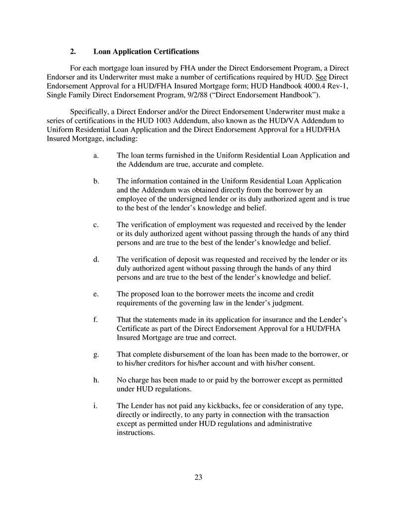 2. Loan Application Certifications For each mortgage loan insured by FHA under the Direct Endorsement Program, a Direct Endorser and its Underwriter must make a number of certifications required by HUD. See Direct Endorsement Approval for a HUD/FHA Insured Mortgage form; HUD Handbook 4000.4 Rev-1, Single Family Direct Endorsement Program, 9/2/88 (“Direct Endorsement Handbook”). Specifically, a Direct Endorser and/or the Direct Endorsement Underwriter must make a series of certifications in the HUD 1003 Addendum, also known as the HUD/VA Addendum to Uniform Residential Loan Application and the Direct Endorsement Approval for a HUD/FHA Insured Mortgage, including: a. The loan terms furnished in the Uniform Residential Loan Application and the Addendum are true, accurate and complete. b. The information contained in the Uniform Residential Loan Application and the Addendum was obtained directly from the borrower by an employee of the undersigned lender or its duly authorized agent and is true to the best of the lender’s knowledge and belief. c. The verification of employment was requested and received by the lender or its duly authorized agent without passing through the hands of any third persons and are true to the best of the lender’s knowledge and belief. d. The verification of deposit was requested and received by the lender or its duly authorized agent without passing through the hands of any third persons and are true to the best of the lender’s knowledge and belief. e. The proposed loan to the borrower meets the income and credit requirements of the governing law in the lender’s judgment. f. That the statements made in its application for insurance and the Lender’s Certificate as part of the Direct Endorsement Approval for a HUD/FHA Insured Mortgage are true and correct. g. That complete disbursement of the loan has been made to the borrower, or to his/her creditors for his/her account and with his/her consent. h. No charge has been made to or paid by the borrower except as permitted under HUD regulations. i. The Lender has not paid any kickbacks, fee or consideration of any type, directly or indirectly, to any party in connection with the transaction except as permitted under HUD regulations and administrative instructions. 23