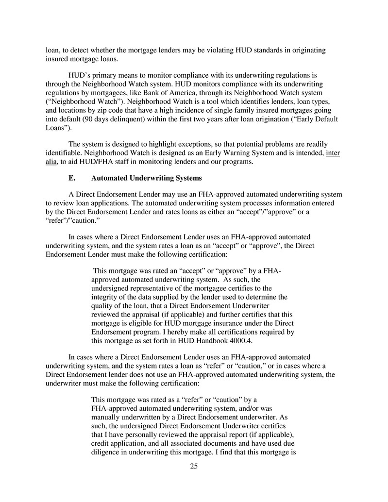loan, to detect whether the mortgage lenders may be violating HUD standards in originating insured mortgage loans. HUD’s primary means to monitor compliance with its underwriting regulations is through the Neighborhood Watch system. HUD monitors compliance with its underwriting regulations by mortgagees, like Bank of America, through its Neighborhood Watch system (“Neighborhood Watch”). Neighborhood Watch is a tool which identifies lenders, loan types, and locations by zip code that have a high incidence of single family insured mortgages going into default (90 days delinquent) within the first two years after loan origination (“Early Default Loans”). The system is designed to highlight exceptions, so that potential problems are readily identifiable. Neighborhood Watch is designed as an Early Warning System and is intended, inter alia, to aid HUD/FHA staff in monitoring lenders and our programs. E. Automated Underwriting Systems A Direct Endorsement Lender may use an FHA-approved automated underwriting system to review loan applications. The automated underwriting system processes information entered by the Direct Endorsement Lender and rates loans as either an “accept”/”approve” or a “refer”/”caution.” In cases where a Direct Endorsement Lender uses an FHA-approved automated underwriting system, and the system rates a loan as an “accept” or “approve”, the Direct Endorsement Lender must make the following certification: This mortgage was rated an “accept” or “approve” by a FHA- approved automated underwriting system. As such, the undersigned representative of the mortgagee certifies to the integrity of the data supplied by the lender used to determine the quality of the loan, that a Direct Endorsement Underwriter reviewed the appraisal (if applicable) and further certifies that this mortgage is eligible for HUD mortgage insurance under the Direct Endorsement program. I hereby make all certifications required by this mortgage as set forth in HUD Handbook 4000.4. In cases where a Direct Endorsement Lender uses an FHA-approved automated underwriting system, and the system rates a loan as “refer” or “caution,” or in cases where a Direct Endorsement lender does not use an FHA-approved automated underwriting system, the underwriter must make the following certification: This mortgage was rated as a “refer” or “caution” by a FHA-approved automated underwriting system, and/or was manually underwritten by a Direct Endorsement underwriter. As such, the undersigned Direct Endorsement Underwriter certifies that I have personally reviewed the appraisal report (if applicable), credit application, and all associated documents and have used due diligence in underwriting this mortgage. I find that this mortgage is 25
