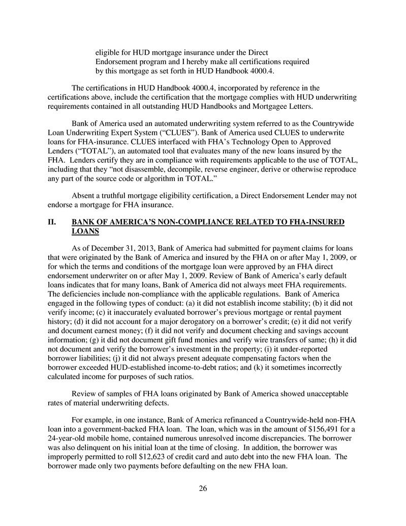 eligible for HUD mortgage insurance under the Direct Endorsement program and I hereby make all certifications required by this mortgage as set forth in HUD Handbook 4000.4. The certifications in HUD Handbook 4000.4, incorporated by reference in the certifications above, include the certification that the mortgage complies with HUD underwriting requirements contained in all outstanding HUD Handbooks and Mortgagee Letters. Bank of America used an automated underwriting system referred to as the Countrywide Loan Underwriting Expert System (“CLUES”). Bank of America used CLUES to underwrite loans for FHA-insurance. CLUES interfaced with FHA’s Technology Open to Approved Lenders (“TOTAL”), an automated tool that evaluates many of the new loans insured by the FHA. Lenders certify they are in compliance with requirements applicable to the use of TOTAL, including that they “not disassemble, decompile, reverse engineer, derive or otherwise reproduce any part of the source code or algorithm in TOTAL.” Absent a truthful mortgage eligibility certification, a Direct Endorsement Lender may not endorse a mortgage for FHA insurance. II. BANK OF AMERICA’S NON-COMPLIANCE RELATED TO FHA-INSURED LOANS As of December 31, 2013, Bank of America had submitted for payment claims for loans that were originated by the Bank of America and insured by the FHA on or after May 1, 2009, or for which the terms and conditions of the mortgage loan were approved by an FHA direct endorsement underwriter on or after May 1, 2009. Review of Bank of America’s early default loans indicates that for many loans, Bank of America did not always meet FHA requirements. The deficiencies include non-compliance with the applicable regulations. Bank of America engaged in the following types of conduct: (a) it did not establish income stability; (b) it did not verify income; (c) it inaccurately evaluated borrower’s previous mortgage or rental payment history; (d) it did not account for a major derogatory on a borrower’s credit; (e) it did not verify and document earnest money; (f) it did not verify and document checking and savings account information; (g) it did not document gift fund monies and verify wire transfers of same; (h) it did not document and verify the borrower’s investment in the property; (i) it under-reported borrower liabilities; (j) it did not always present adequate compensating factors when the borrower exceeded HUD-established income-to-debt ratios; and (k) it sometimes incorrectly calculated income for purposes of such ratios. Review of samples of FHA loans originated by Bank of America showed unacceptable rates of material underwriting defects. For example, in one instance, Bank of America refinanced a Countrywide-held non-FHA loan into a government-backed FHA loan. The loan, which was in the amount of $156,491 for a 24-year-old mobile home, contained numerous unresolved income discrepancies. The borrower was also delinquent on his initial loan at the time of closing. In addition, the borrower was improperly permitted to roll $12,623 of credit card and auto debt into the new FHA loan. The borrower made only two payments before defaulting on the new FHA loan. 26