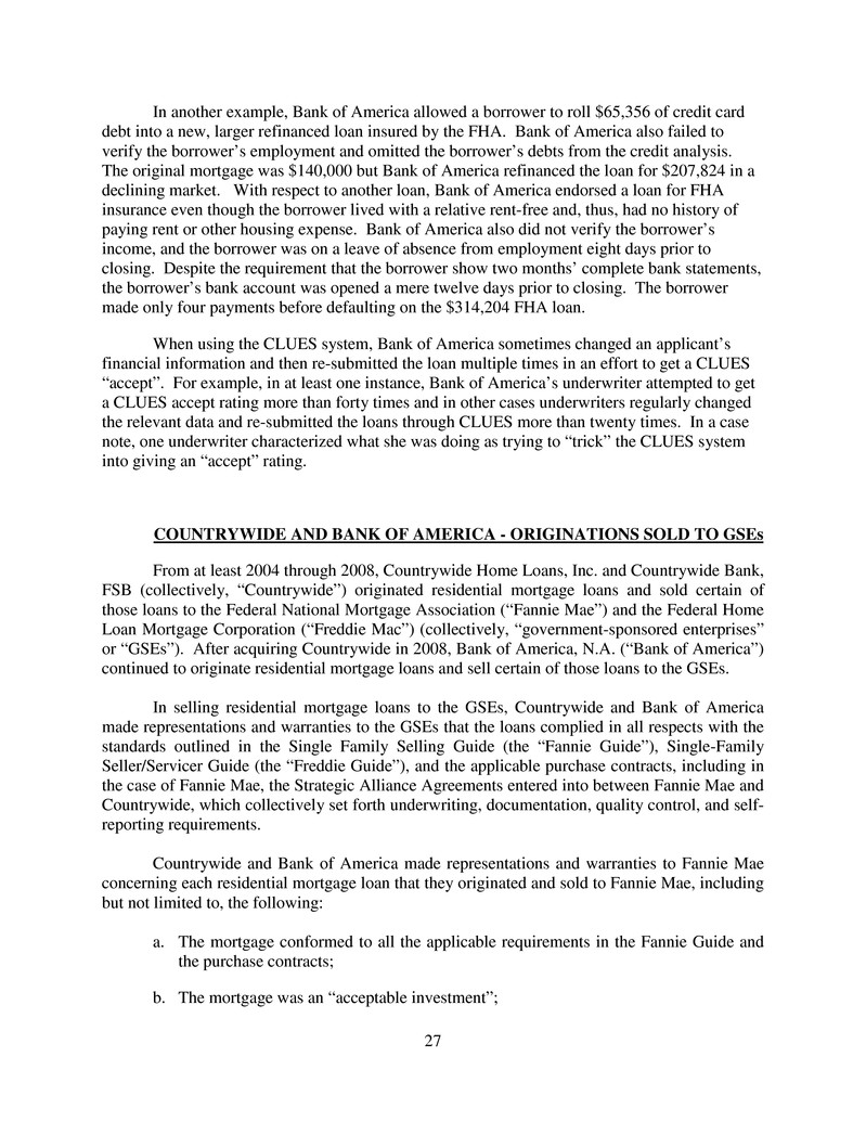 In another example, Bank of America allowed a borrower to roll $65,356 of credit card debt into a new, larger refinanced loan insured by the FHA. Bank of America also failed to verify the borrower’s employment and omitted the borrower’s debts from the credit analysis. The original mortgage was $140,000 but Bank of America refinanced the loan for $207,824 in a declining market. With respect to another loan, Bank of America endorsed a loan for FHA insurance even though the borrower lived with a relative rent-free and, thus, had no history of paying rent or other housing expense. Bank of America also did not verify the borrower’s income, and the borrower was on a leave of absence from employment eight days prior to closing. Despite the requirement that the borrower show two months’ complete bank statements, the borrower’s bank account was opened a mere twelve days prior to closing. The borrower made only four payments before defaulting on the $314,204 FHA loan. When using the CLUES system, Bank of America sometimes changed an applicant’s financial information and then re-submitted the loan multiple times in an effort to get a CLUES “accept”. For example, in at least one instance, Bank of America’s underwriter attempted to get a CLUES accept rating more than forty times and in other cases underwriters regularly changed the relevant data and re-submitted the loans through CLUES more than twenty times. In a case note, one underwriter characterized what she was doing as trying to “trick” the CLUES system into giving an “accept” rating. COUNTRYWIDE AND BANK OF AMERICA - ORIGINATIONS SOLD TO GSEs From at least 2004 through 2008, Countrywide Home Loans, Inc. and Countrywide Bank, FSB (collectively, “Countrywide”) originated residential mortgage loans and sold certain of those loans to the Federal National Mortgage Association (“Fannie Mae”) and the Federal Home Loan Mortgage Corporation (“Freddie Mac”) (collectively, “government-sponsored enterprises” or “GSEs”). After acquiring Countrywide in 2008, Bank of America, N.A. (“Bank of America”) continued to originate residential mortgage loans and sell certain of those loans to the GSEs. In selling residential mortgage loans to the GSEs, Countrywide and Bank of America made representations and warranties to the GSEs that the loans complied in all respects with the standards outlined in the Single Family Selling Guide (the “Fannie Guide”), Single-Family Seller/Servicer Guide (the “Freddie Guide”), and the applicable purchase contracts, including in the case of Fannie Mae, the Strategic Alliance Agreements entered into between Fannie Mae and Countrywide, which collectively set forth underwriting, documentation, quality control, and self- reporting requirements. Countrywide and Bank of America made representations and warranties to Fannie Mae concerning each residential mortgage loan that they originated and sold to Fannie Mae, including but not limited to, the following: a. The mortgage conformed to all the applicable requirements in the Fannie Guide and the purchase contracts; b. The mortgage was an “acceptable investment”; 27