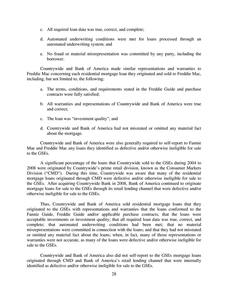 c. All required loan data was true, correct, and complete; d. Automated underwriting conditions were met for loans processed through an automated underwriting system; and e. No fraud or material misrepresentation was committed by any party, including the borrower. Countrywide and Bank of America made similar representations and warranties to Freddie Mac concerning each residential mortgage loan they originated and sold to Freddie Mac, including, but not limited to, the following: a. The terms, conditions, and requirements stated in the Freddie Guide and purchase contracts were fully satisfied; b. All warranties and representations of Countrywide and Bank of America were true and correct; c. The loan was “investment quality”; and d. Countrywide and Bank of America had not misstated or omitted any material fact about the mortgage. Countrywide and Bank of America were also generally required to self-report to Fannie Mae and Freddie Mac any loans they identified as defective and/or otherwise ineligible for sale to the GSEs. A significant percentage of the loans that Countrywide sold to the GSEs during 2004 to 2008 were originated by Countrywide’s prime retail division, known as the Consumer Markets Division (“CMD”). During this time, Countrywide was aware that many of the residential mortgage loans originated through CMD were defective and/or otherwise ineligible for sale to the GSEs. After acquiring Countrywide Bank in 2008, Bank of America continued to originate mortgage loans for sale to the GSEs through its retail lending channel that were defective and/or otherwise ineligible for sale to the GSEs. Thus, Countrywide and Bank of America sold residential mortgage loans that they originated to the GSEs with representations and warranties that the loans conformed to the Fannie Guide, Freddie Guide and/or applicable purchase contracts; that the loans were acceptable investments or investment quality; that all required loan data was true, correct, and complete; that automated underwriting conditions had been met; that no material misrepresentations were committed in connection with the loans; and that they had not misstated or omitted any material fact about the loans; when, in fact, many of those representations or warranties were not accurate, as many of the loans were defective and/or otherwise ineligible for sale to the GSEs. Countrywide and Bank of America also did not self-report to the GSEs mortgage loans originated through CMD and Bank of America’s retail lending channel that were internally identified as defective and/or otherwise ineligible for sale to the GSEs. 28