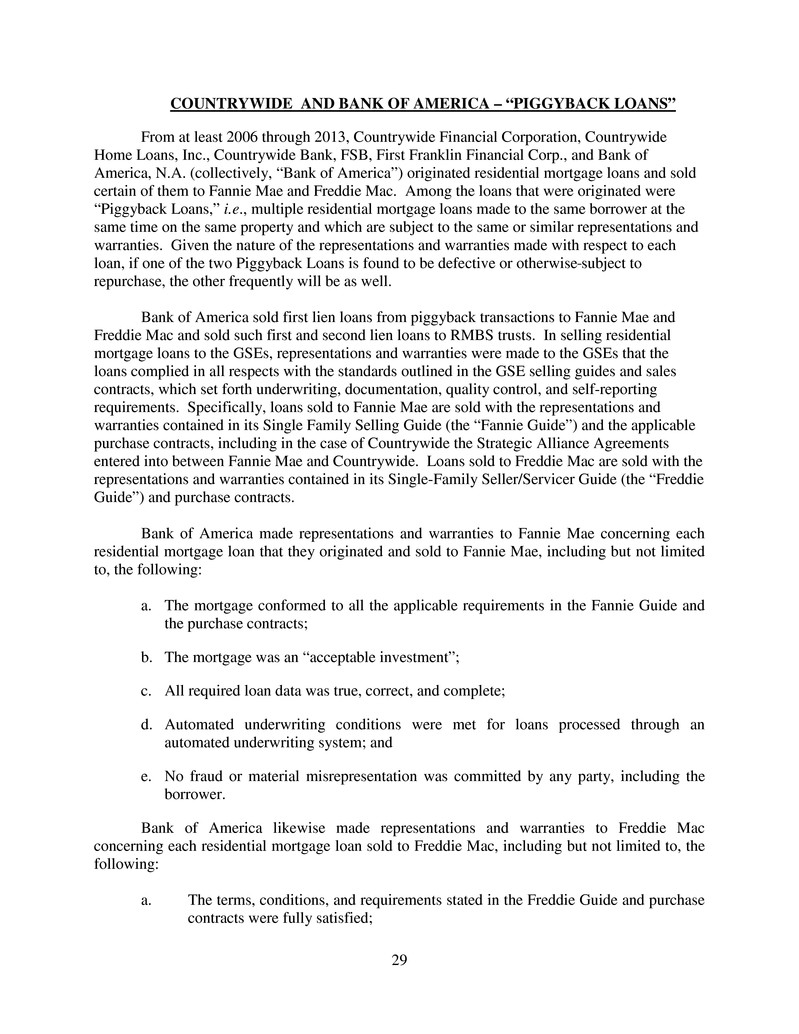 COUNTRYWIDE AND BANK OF AMERICA – “PIGGYBACK LOANS” From at least 2006 through 2013, Countrywide Financial Corporation, Countrywide Home Loans, Inc., Countrywide Bank, FSB, First Franklin Financial Corp., and Bank of America, N.A. (collectively, “Bank of America”) originated residential mortgage loans and sold certain of them to Fannie Mae and Freddie Mac. Among the loans that were originated were “Piggyback Loans,” i.e., multiple residential mortgage loans made to the same borrower at the same time on the same property and which are subject to the same or similar representations and warranties. Given the nature of the representations and warranties made with respect to each loan, if one of the two Piggyback Loans is found to be defective or otherwise subject to repurchase, the other frequently will be as well. Bank of America sold first lien loans from piggyback transactions to Fannie Mae and Freddie Mac and sold such first and second lien loans to RMBS trusts. In selling residential mortgage loans to the GSEs, representations and warranties were made to the GSEs that the loans complied in all respects with the standards outlined in the GSE selling guides and sales contracts, which set forth underwriting, documentation, quality control, and self-reporting requirements. Specifically, loans sold to Fannie Mae are sold with the representations and warranties contained in its Single Family Selling Guide (the “Fannie Guide”) and the applicable purchase contracts, including in the case of Countrywide the Strategic Alliance Agreements entered into between Fannie Mae and Countrywide. Loans sold to Freddie Mac are sold with the representations and warranties contained in its Single-Family Seller/Servicer Guide (the “Freddie Guide”) and purchase contracts. Bank of America made representations and warranties to Fannie Mae concerning each residential mortgage loan that they originated and sold to Fannie Mae, including but not limited to, the following: a. The mortgage conformed to all the applicable requirements in the Fannie Guide and the purchase contracts; b. The mortgage was an “acceptable investment”; c. All required loan data was true, correct, and complete; d. Automated underwriting conditions were met for loans processed through an automated underwriting system; and e. No fraud or material misrepresentation was committed by any party, including the borrower. Bank of America likewise made representations and warranties to Freddie Mac concerning each residential mortgage loan sold to Freddie Mac, including but not limited to, the following: a. The terms, conditions, and requirements stated in the Freddie Guide and purchase contracts were fully satisfied; 29