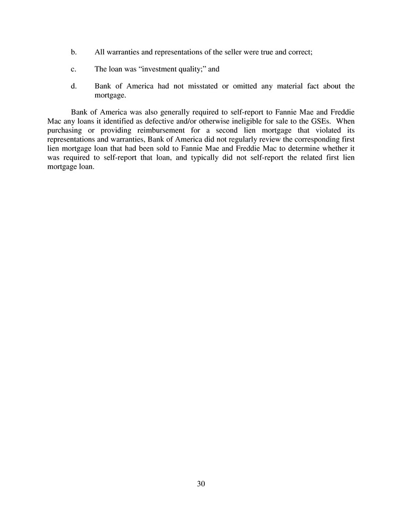b. All warranties and representations of the seller were true and correct; c. The loan was “investment quality;” and d. Bank of America had not misstated or omitted any material fact about the mortgage. Bank of America was also generally required to self-report to Fannie Mae and Freddie Mac any loans it identified as defective and/or otherwise ineligible for sale to the GSEs. When purchasing or providing reimbursement for a second lien mortgage that violated its representations and warranties, Bank of America did not regularly review the corresponding first lien mortgage loan that had been sold to Fannie Mae and Freddie Mac to determine whether it was required to self-report that loan, and typically did not self-report the related first lien mortgage loan. 30