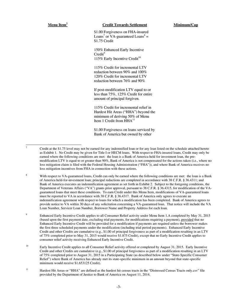 -3- Menu Item2 Credit Towards Settlement Minimum/Cap $1.00 Forgiveness on FHA-insured Loans7 or VA-guaranteed Loans8 = $1.75 Credit 150% Enhanced Early Incentive Credit9 115% Early Incentive Credit10 115% Credit for incremental LTV reduction between 90% and 100% 120% Credit for incremental LTV reduction between 76% and 90% If post-modification LTV equal to or less than 75%, 125% Credit for entire amount of principal forgiven. 115% Credit for incremental relief in Hardest Hit Areas (“HHA”) beyond the minimum of deriving 50% of Menu Item 1 Credit from HHA11 $1.00 Forgiveness on loans serviced by Bank of America but owned by other 7 Credit at the $1.75 level may not be earned for any indemnified loan or for any loan listed on the schedule attached hereto as Exhibit 1. No Credit may be given for Title I or HECM loans. With respect to FHA-insured loans, Credit may only be earned where the following conditions are met: the loan is a Bank of America held for investment loan, the pre- modification LTV is equal to or greater than 90%, Bank of America is not compensated for the actions taken (i.e., where no loss mitigation claim is filed with the Federal Housing Administration (“FHA”)), and where Bank of America receives no loss mitigation incentives from FHA in connection with these actions. 8 With respect to VA-guaranteed loans, Credit can only be earned where the following conditions are met: the loan is a Bank of America held-for-investment loan; principal reductions are completed in accordance with 38 C.F.R. § 36.4311; and Bank of America executes an indemnification agreement as set forth in Exhibit 2. Subject to the foregoing conditions, the Department of Veterans Affairs (“VA”) grants prior approval, pursuant to 38 C.F.R. § 36.4315, for modification of the VA- guaranteed loans that meet these conditions. To earn Credit under this Menu Item, modifications of VA-guaranteed loans must be reported to VA in accordance with 38 C.F.R. § 36.4317. Bank of America only agrees to execute an indemnification agreement with respect to loans for which a modification has been completed. Bank of America agrees to provide notice to VA within 30 days of any solicitation concerning a VA-guaranteed loan. That notice will include the VA Loan Number, Servicer Loan Number, Borrower Name and Property Address for each loan. 9 Enhanced Early Incentive Credit applies to all Consumer Relief activity under Menu Item 1.A completed by May 31, 2015 (based upon the first payment date, excluding trial payments, for modifications requiring a payment), provided that no Enhanced Early Incentive Credit will be provided for a modification if payments are required unless the borrower makes the first three scheduled payments under the modification (including trial period payments). Enhanced Early Incentive Credit and other Credits are cumulative (e.g., $1.00 of principal forgiveness as part of a modification resulting in an LTV of 75% completed prior to May 31, 2015 would receive $1.875 Credit), except that no Early Incentive Credit applies to consumer relief activity receiving Enhanced Early Incentive Credit. 10 Early Incentive Credit applies to all Consumer Relief activity offered or completed by August 31, 2015. Early Incentive Credit and other Credits are cumulative (e.g., $1.00 of principal forgiveness as part of a modification resulting in an LTV of 75% completed prior to August 31, 2015 in a Participating State (as described below under “State-Specific Consumer Relief”) where Bank of America has already met its state-specific minimum in an amount beyond that state-specific minimum would receive $1.653125 Credit). 11 Hardest Hit Areas or “HHA” are defined as the hardest hit census tracts in the “Distressed Census Tracts only.csv” file provided by the Department of Justice to Bank of America on August 11, 2014.