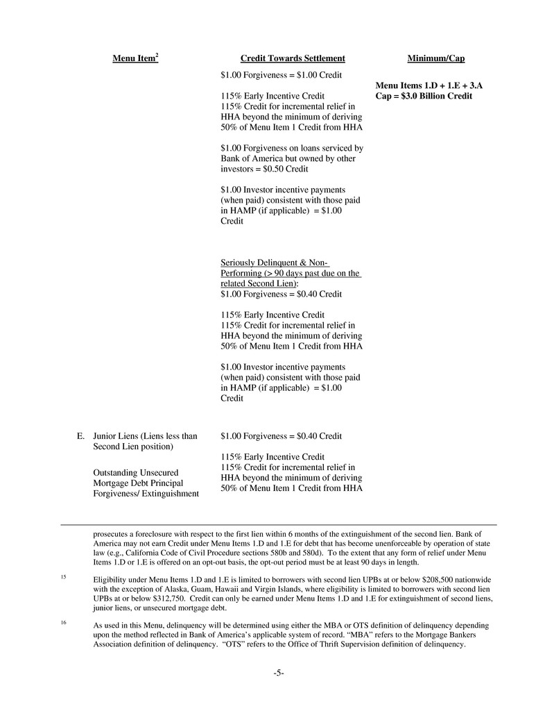 -4- Menu Item2 Credit Towards Settlement Minimum/Cap investors = $0.50 Credit $1.00 Investor incentive payments (when paid) consistent with those paid in HAMP (if applicable) = $1.00 Credit12 B. Principal Forgiveness of Forbearance $1.00 Forgiveness = $1.00 Credit 115% Early Incentive Credit 115% Credit for incremental LTV reduction below 100% 115% Credit for incremental relief in HHA beyond the minimum of deriving 50% of Menu Item 1 Credit from HHA $1.00 Forgiveness on loans serviced by Bank of America but owned by other investors = $0.50 Credit $1.00 Investor incentive payments (when paid) consistent with those paid in HAMP for principal reduction of first liens (if applicable) = $1.00 Credit Credit limited to principal reduction that reduces LTV to equal to or less than 100% LTV C. First Lien – Forbearance (Payment Forgiveness) $Forgiveness = Pre Mod Rate x Forborne UPB x Avg Life13 115% Early Incentive Credit 115% Credit for incremental relief in HHA beyond the minimum of deriving 50% of Menu Item 1 Credit from HHA $1.00 Forgiveness on loans serviced by Bank of America but owned by other investors = $0.50 Credit $1.00 Investor incentive payments (when paid) consistent with those paid in HAMP (if applicable) = $1.00 Credit D. Second Lien Extinguishments14,15 Performing (90 days or less past due on the related Second Lien)16: Menu Items 1.D + 1.E Cap = $2.5 Billion Credit 12 With respect to investor incentive payments under Menu Item 1, Bank of America can apply for servicer and investor incentive payments under HAMP, but Credit cannot be earned for these incentives. 13 Based on an average life of 8 years. 14 Bank of America may not earn Credit under Menu Items 1.D and 1.E for extinguishment of a second lien, junior lien, or unsecured mortgage debt where Bank of America owns or services the first lien and Bank of America initiates or