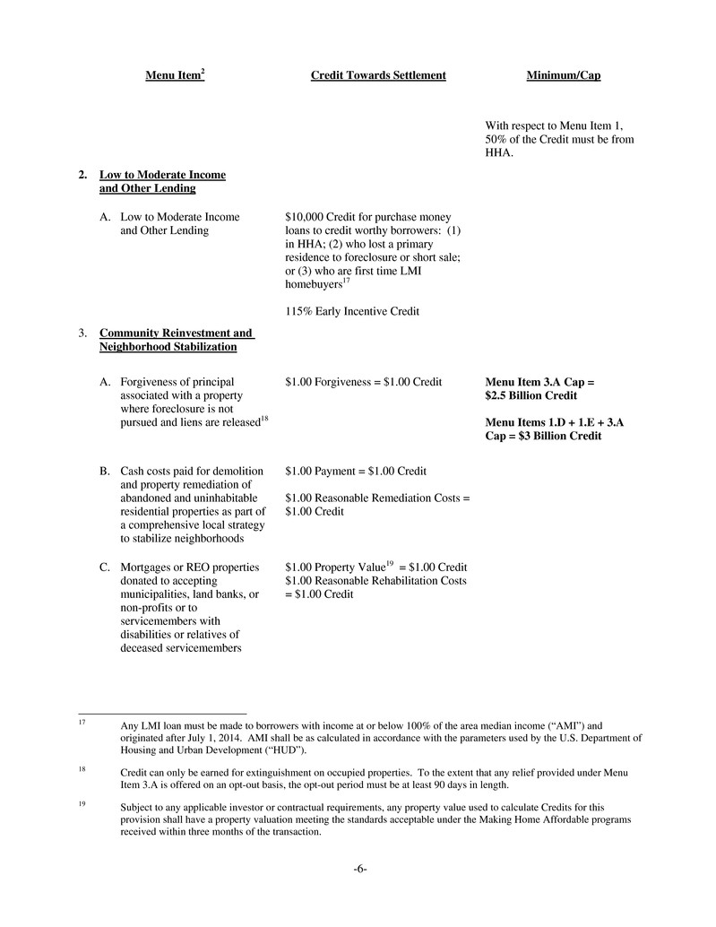 -6- Menu Item2 Credit Towards Settlement Minimum/Cap With respect to Menu Item 1, 50% of the Credit must be from HHA. 2. Low to Moderate Income and Other Lending A. Low to Moderate Income and Other Lending $10,000 Credit for purchase money loans to credit worthy borrowers: (1) in HHA; (2) who lost a primary residence to foreclosure or short sale; or (3) who are first time LMI homebuyers17 115% Early Incentive Credit 3. Community Reinvestment and Neighborhood Stabilization A. Forgiveness of principal associated with a property where foreclosure is not pursued and liens are released18 $1.00 Forgiveness = $1.00 Credit Menu Item 3.A Cap = $2.5 Billion Credit Menu Items 1.D + 1.E + 3.A Cap = $3 Billion Credit B. Cash costs paid for demolition and property remediation of abandoned and uninhabitable residential properties as part of a comprehensive local strategy to stabilize neighborhoods $1.00 Payment = $1.00 Credit $1.00 Reasonable Remediation Costs = $1.00 Credit C. Mortgages or REO properties donated to accepting municipalities, land banks, or non-profits or to servicemembers with disabilities or relatives of deceased servicemembers $1.00 Property Value19 = $1.00 Credit $1.00 Reasonable Rehabilitation Costs = $1.00 Credit 17 Any LMI loan must be made to borrowers with income at or below 100% of the area median income (“AMI”) and originated after July 1, 2014. AMI shall be as calculated in accordance with the parameters used by the U.S. Department of Housing and Urban Development (“HUD”). 18 Credit can only be earned for extinguishment on occupied properties. To the extent that any relief provided under Menu Item 3.A is offered on an opt-out basis, the opt-out period must be at least 90 days in length. 19 Subject to any applicable investor or contractual requirements, any property value used to calculate Credits for this provision shall have a property valuation meeting the standards acceptable under the Making Home Affordable programs received within three months of the transaction.