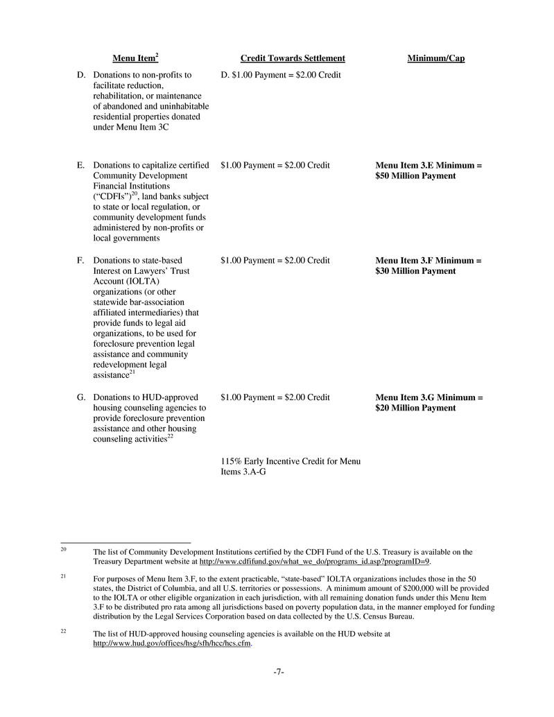 -7- Menu Item2 Credit Towards Settlement Minimum/Cap D. Donations to non-profits to facilitate reduction, rehabilitation, or maintenance of abandoned and uninhabitable residential properties donated under Menu Item 3C D. $1.00 Payment = $2.00 Credit E. Donations to capitalize certified Community Development Financial Institutions (“CDFIs”)20, land banks subject to state or local regulation, or community development funds administered by non-profits or local governments $1.00 Payment = $2.00 Credit Menu Item 3.E Minimum = $50 Million Payment F. Donations to state-based Interest on Lawyers’ Trust Account (IOLTA) organizations (or other statewide bar-association affiliated intermediaries) that provide funds to legal aid organizations, to be used for foreclosure prevention legal assistance and community redevelopment legal assistance21 $1.00 Payment = $2.00 Credit Menu Item 3.F Minimum = $30 Million Payment G. Donations to HUD-approved housing counseling agencies to provide foreclosure prevention assistance and other housing counseling activities22 $1.00 Payment = $2.00 Credit Menu Item 3.G Minimum = $20 Million Payment 115% Early Incentive Credit for Menu Items 3.A-G 20 The list of Community Development Institutions certified by the CDFI Fund of the U.S. Treasury is available on the Treasury Department website at http://www.cdfifund.gov/what_we_do/programs_id.asp?programID=9. 21 For purposes of Menu Item 3.F, to the extent practicable, “state-based” IOLTA organizations includes those in the 50 states, the District of Columbia, and all U.S. territories or possessions. A minimum amount of $200,000 will be provided to the IOLTA or other eligible organization in each jurisdiction, with all remaining donation funds under this Menu Item 3.F to be distributed pro rata among all jurisdictions based on poverty population data, in the manner employed for funding distribution by the Legal Services Corporation based on data collected by the U.S. Census Bureau. 22 The list of HUD-approved housing counseling agencies is available on the HUD website at http://www.hud.gov/offices/hsg/sfh/hcc/hcs.cfm.