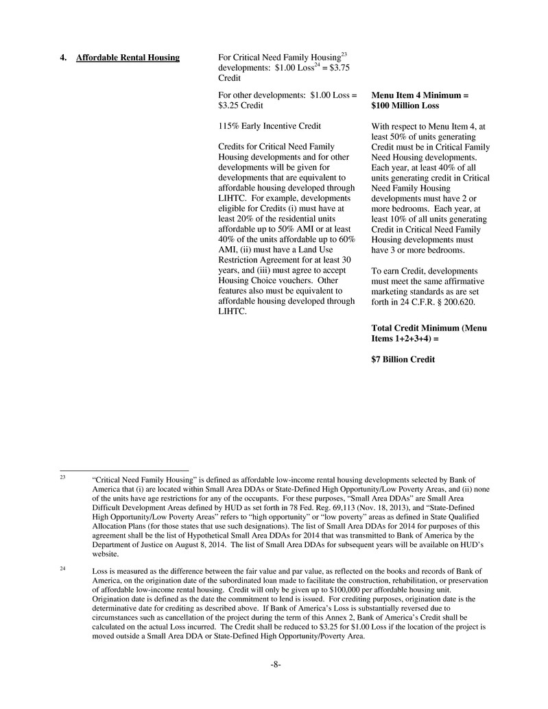-8- 4. Affordable Rental Housing For Critical Need Family Housing23 developments: $1.00 Loss24 = $3.75 Credit For other developments: $1.00 Loss = $3.25 Credit 115% Early Incentive Credit Credits for Critical Need Family Housing developments and for other developments will be given for developments that are equivalent to affordable housing developed through LIHTC. For example, developments eligible for Credits (i) must have at least 20% of the residential units affordable up to 50% AMI or at least 40% of the units affordable up to 60% AMI, (ii) must have a Land Use Restriction Agreement for at least 30 years, and (iii) must agree to accept Housing Choice vouchers. Other features also must be equivalent to affordable housing developed through LIHTC. Menu Item 4 Minimum = $100 Million Loss With respect to Menu Item 4, at least 50% of units generating Credit must be in Critical Family Need Housing developments. Each year, at least 40% of all units generating credit in Critical Need Family Housing developments must have 2 or more bedrooms. Each year, at least 10% of all units generating Credit in Critical Need Family Housing developments must have 3 or more bedrooms. To earn Credit, developments must meet the same affirmative marketing standards as are set forth in 24 C.F.R. § 200.620. Total Credit Minimum (Menu Items 1+2+3+4) = $7 Billion Credit 23 “Critical Need Family Housing” is defined as affordable low-income rental housing developments selected by Bank of America that (i) are located within Small Area DDAs or State-Defined High Opportunity/Low Poverty Areas, and (ii) none of the units have age restrictions for any of the occupants. For these purposes, “Small Area DDAs” are Small Area Difficult Development Areas defined by HUD as set forth in 78 Fed. Reg. 69,113 (Nov. 18, 2013), and “State-Defined High Opportunity/Low Poverty Areas” refers to “high opportunity” or “low poverty” areas as defined in State Qualified Allocation Plans (for those states that use such designations). The list of Small Area DDAs for 2014 for purposes of this agreement shall be the list of Hypothetical Small Area DDAs for 2014 that was transmitted to Bank of America by the Department of Justice on August 8, 2014. The list of Small Area DDAs for subsequent years will be available on HUD’s website. 24 Loss is measured as the difference between the fair value and par value, as reflected on the books and records of Bank of America, on the origination date of the subordinated loan made to facilitate the construction, rehabilitation, or preservation of affordable low-income rental housing. Credit will only be given up to $100,000 per affordable housing unit. Origination date is defined as the date the commitment to lend is issued. For crediting purposes, origination date is the determinative date for crediting as described above. If Bank of America’s Loss is substantially reversed due to circumstances such as cancellation of the project during the term of this Annex 2, Bank of America’s Credit shall be calculated on the actual Loss incurred. The Credit shall be reduced to $3.25 for $1.00 Loss if the location of the project is moved outside a Small Area DDA or State-Defined High Opportunity/Poverty Area.
