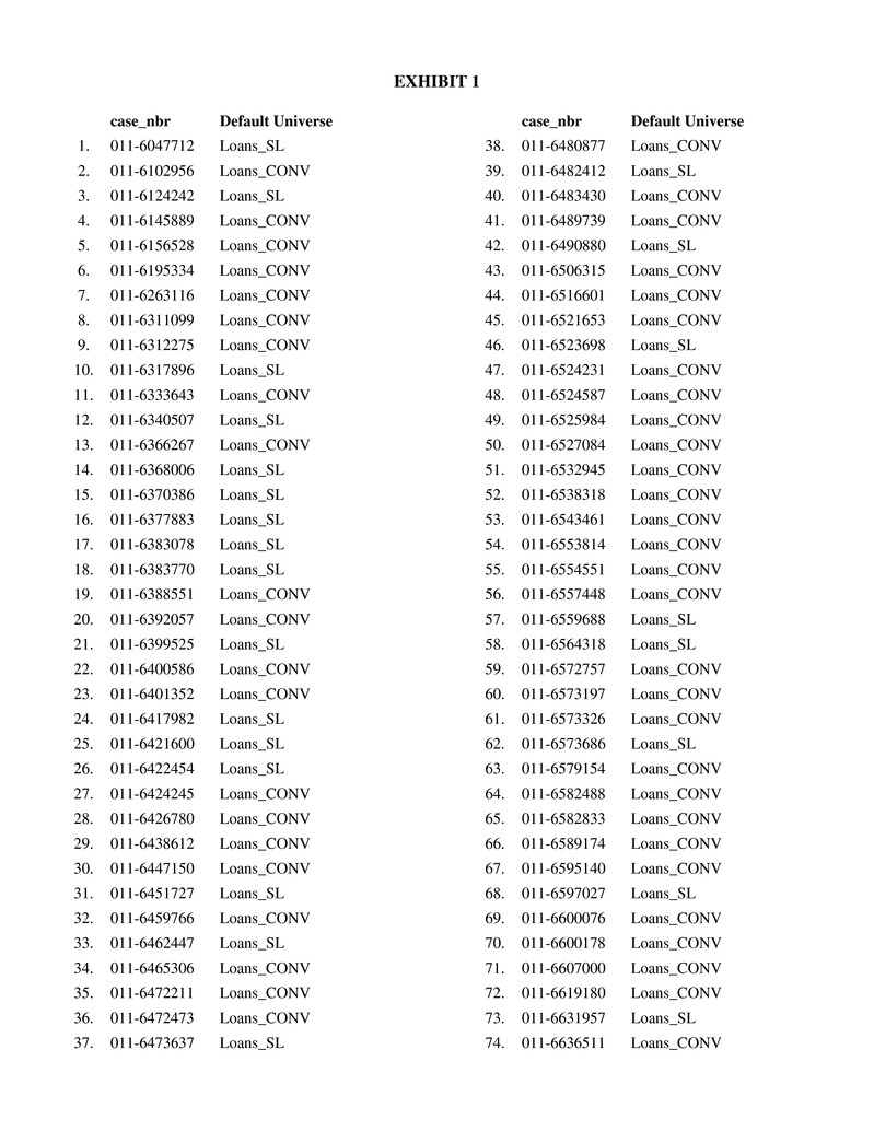 EXHIBIT 1 case_nbr Default Universe 1. 011-6047712 Loans_SL 2. 011-6102956 Loans_CONV 3. 011-6124242 Loans_SL 4. 011-6145889 Loans_CONV 5. 011-6156528 Loans_CONV 6. 011-6195334 Loans_CONV 7. 011-6263116 Loans_CONV 8. 011-6311099 Loans_CONV 9. 011-6312275 Loans_CONV 10. 011-6317896 Loans_SL 11. 011-6333643 Loans_CONV 12. 011-6340507 Loans_SL 13. 011-6366267 Loans_CONV 14. 011-6368006 Loans_SL 15. 011-6370386 Loans_SL 16. 011-6377883 Loans_SL 17. 011-6383078 Loans_SL 18. 011-6383770 Loans_SL 19. 011-6388551 Loans_CONV 20. 011-6392057 Loans_CONV 21. 011-6399525 Loans_SL 22. 011-6400586 Loans_CONV 23. 011-6401352 Loans_CONV 24. 011-6417982 Loans_SL 25. 011-6421600 Loans_SL 26. 011-6422454 Loans_SL 27. 011-6424245 Loans_CONV 28. 011-6426780 Loans_CONV 29. 011-6438612 Loans_CONV 30. 011-6447150 Loans_CONV 31. 011-6451727 Loans_SL 32. 011-6459766 Loans_CONV 33. 011-6462447 Loans_SL 34. 011-6465306 Loans_CONV 35. 011-6472211 Loans_CONV 36. 011-6472473 Loans_CONV 37. 011-6473637 Loans_SL case_nbr Default Universe 38. 011-6480877 Loans_CONV 39. 011-6482412 Loans_SL 40. 011-6483430 Loans_CONV 41. 011-6489739 Loans_CONV 42. 011-6490880 Loans_SL 43. 011-6506315 Loans_CONV 44. 011-6516601 Loans_CONV 45. 011-6521653 Loans_CONV 46. 011-6523698 Loans_SL 47. 011-6524231 Loans_CONV 48. 011-6524587 Loans_CONV 49. 011-6525984 Loans_CONV 50. 011-6527084 Loans_CONV 51. 011-6532945 Loans_CONV 52. 011-6538318 Loans_CONV 53. 011-6543461 Loans_CONV 54. 011-6553814 Loans_CONV 55. 011-6554551 Loans_CONV 56. 011-6557448 Loans_CONV 57. 011-6559688 Loans_SL 58. 011-6564318 Loans_SL 59. 011-6572757 Loans_CONV 60. 011-6573197 Loans_CONV 61. 011-6573326 Loans_CONV 62. 011-6573686 Loans_SL 63. 011-6579154 Loans_CONV 64. 011-6582488 Loans_CONV 65. 011-6582833 Loans_CONV 66. 011-6589174 Loans_CONV 67. 011-6595140 Loans_CONV 68. 011-6597027 Loans_SL 69. 011-6600076 Loans_CONV 70. 011-6600178 Loans_CONV 71. 011-6607000 Loans_CONV 72. 011-6619180 Loans_CONV 73. 011-6631957 Loans_SL 74. 011-6636511 Loans_CONV