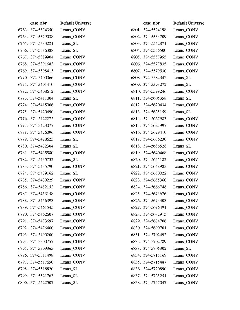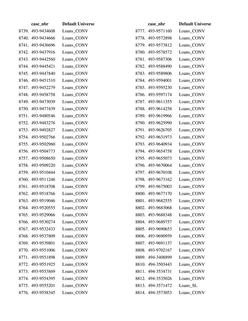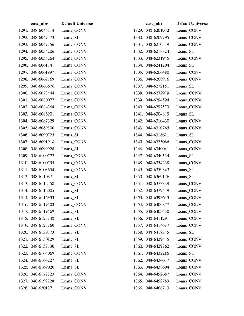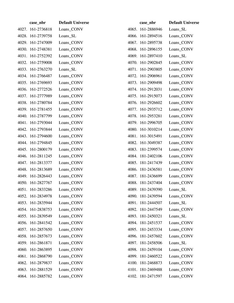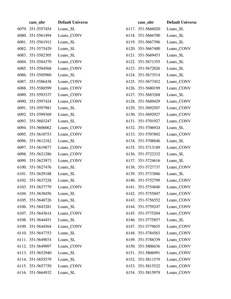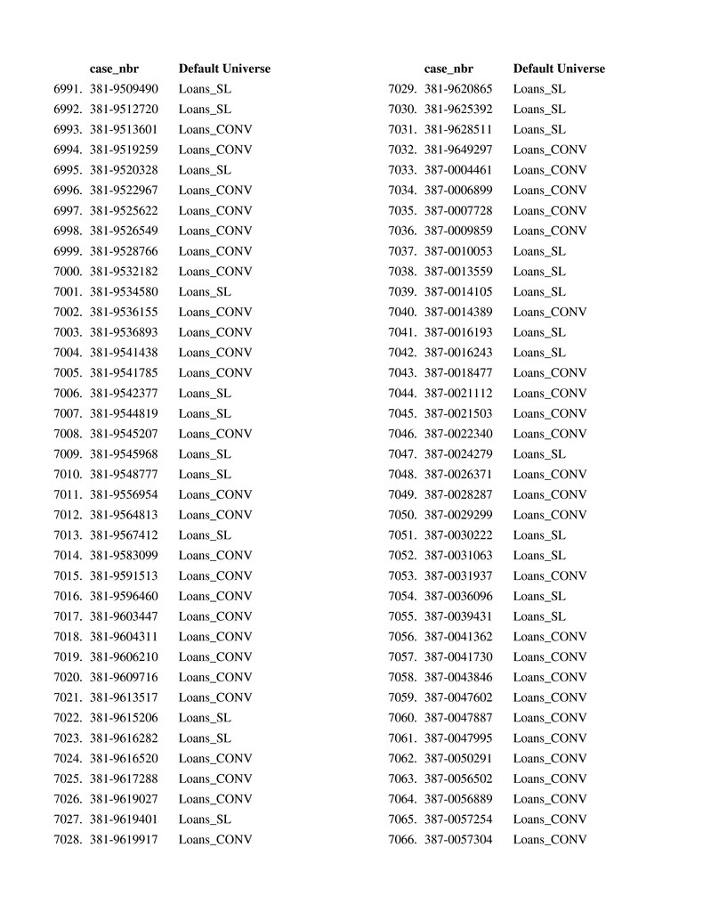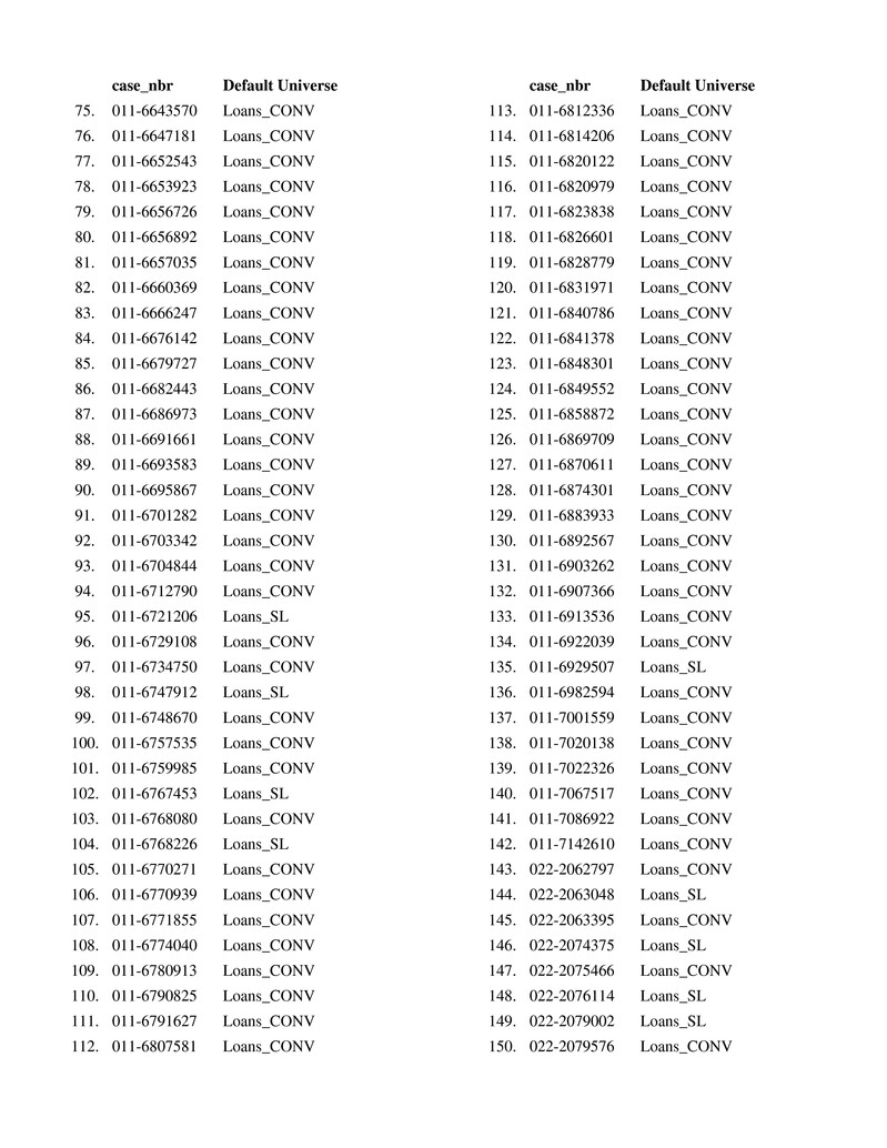 case_nbr Default Universe 75. 011-6643570 Loans_CONV 76. 011-6647181 Loans_CONV 77. 011-6652543 Loans_CONV 78. 011-6653923 Loans_CONV 79. 011-6656726 Loans_CONV 80. 011-6656892 Loans_CONV 81. 011-6657035 Loans_CONV 82. 011-6660369 Loans_CONV 83. 011-6666247 Loans_CONV 84. 011-6676142 Loans_CONV 85. 011-6679727 Loans_CONV 86. 011-6682443 Loans_CONV 87. 011-6686973 Loans_CONV 88. 011-6691661 Loans_CONV 89. 011-6693583 Loans_CONV 90. 011-6695867 Loans_CONV 91. 011-6701282 Loans_CONV 92. 011-6703342 Loans_CONV 93. 011-6704844 Loans_CONV 94. 011-6712790 Loans_CONV 95. 011-6721206 Loans_SL 96. 011-6729108 Loans_CONV 97. 011-6734750 Loans_CONV 98. 011-6747912 Loans_SL 99. 011-6748670 Loans_CONV 100. 011-6757535 Loans_CONV 101. 011-6759985 Loans_CONV 102. 011-6767453 Loans_SL 103. 011-6768080 Loans_CONV 104. 011-6768226 Loans_SL 105. 011-6770271 Loans_CONV 106. 011-6770939 Loans_CONV 107. 011-6771855 Loans_CONV 108. 011-6774040 Loans_CONV 109. 011-6780913 Loans_CONV 110. 011-6790825 Loans_CONV 111. 011-6791627 Loans_CONV 112. 011-6807581 Loans_CONV case_nbr Default Universe 113. 011-6812336 Loans_CONV 114. 011-6814206 Loans_CONV 115. 011-6820122 Loans_CONV 116. 011-6820979 Loans_CONV 117. 011-6823838 Loans_CONV 118. 011-6826601 Loans_CONV 119. 011-6828779 Loans_CONV 120. 011-6831971 Loans_CONV 121. 011-6840786 Loans_CONV 122. 011-6841378 Loans_CONV 123. 011-6848301 Loans_CONV 124. 011-6849552 Loans_CONV 125. 011-6858872 Loans_CONV 126. 011-6869709 Loans_CONV 127. 011-6870611 Loans_CONV 128. 011-6874301 Loans_CONV 129. 011-6883933 Loans_CONV 130. 011-6892567 Loans_CONV 131. 011-6903262 Loans_CONV 132. 011-6907366 Loans_CONV 133. 011-6913536 Loans_CONV 134. 011-6922039 Loans_CONV 135. 011-6929507 Loans_SL 136. 011-6982594 Loans_CONV 137. 011-7001559 Loans_CONV 138. 011-7020138 Loans_CONV 139. 011-7022326 Loans_CONV 140. 011-7067517 Loans_CONV 141. 011-7086922 Loans_CONV 142. 011-7142610 Loans_CONV 143. 022-2062797 Loans_CONV 144. 022-2063048 Loans_SL 145. 022-2063395 Loans_CONV 146. 022-2074375 Loans_SL 147. 022-2075466 Loans_CONV 148. 022-2076114 Loans_SL 149. 022-2079002 Loans_SL 150. 022-2079576 Loans_CONV