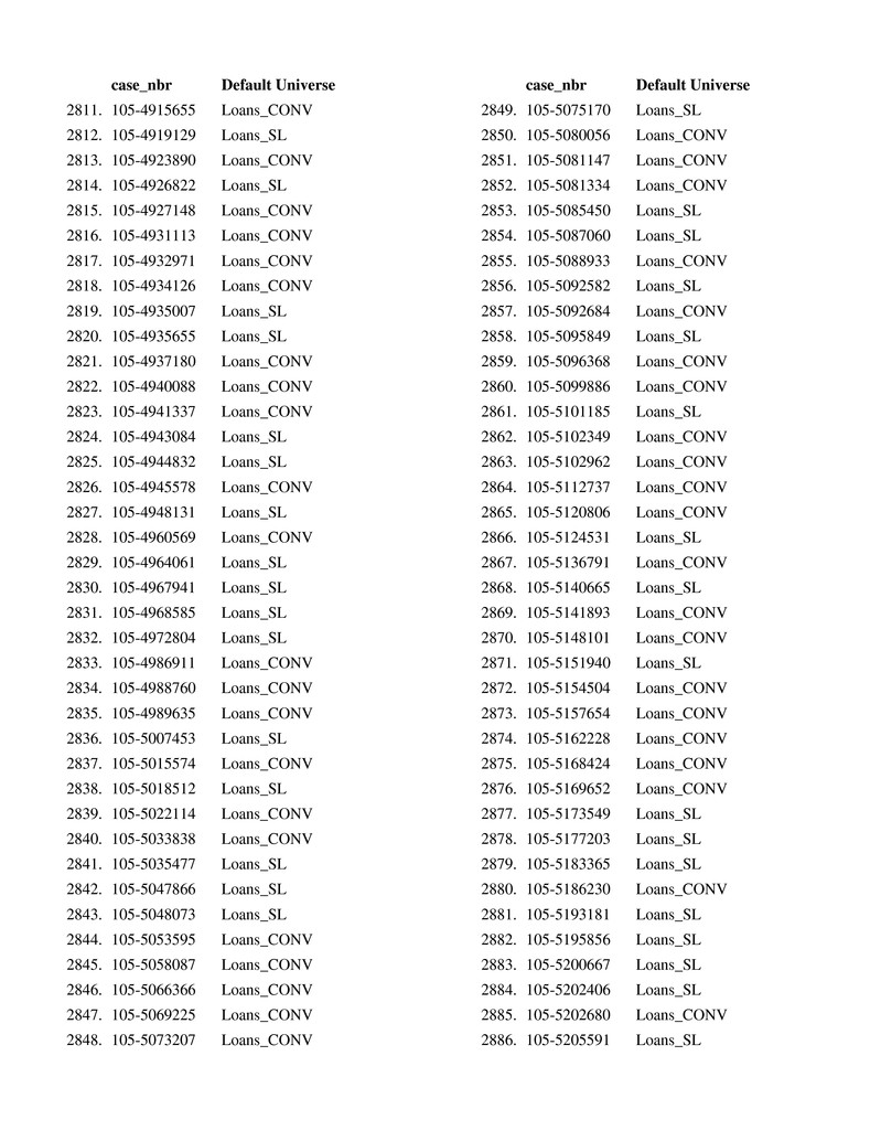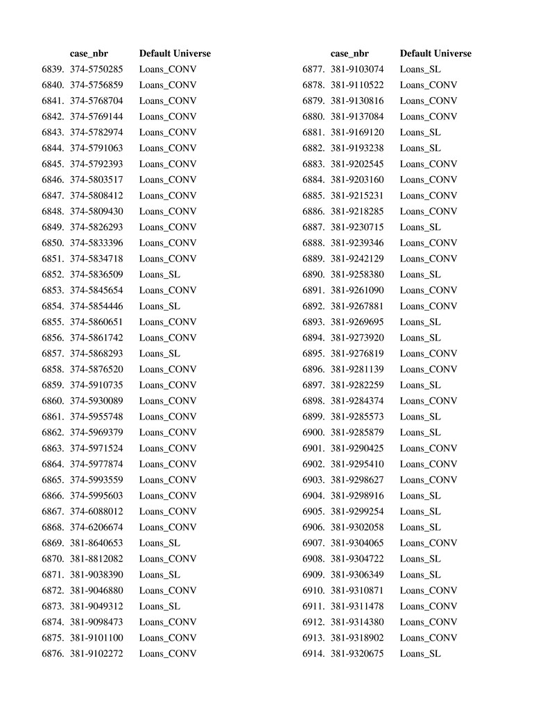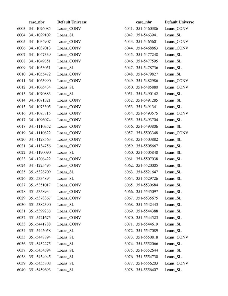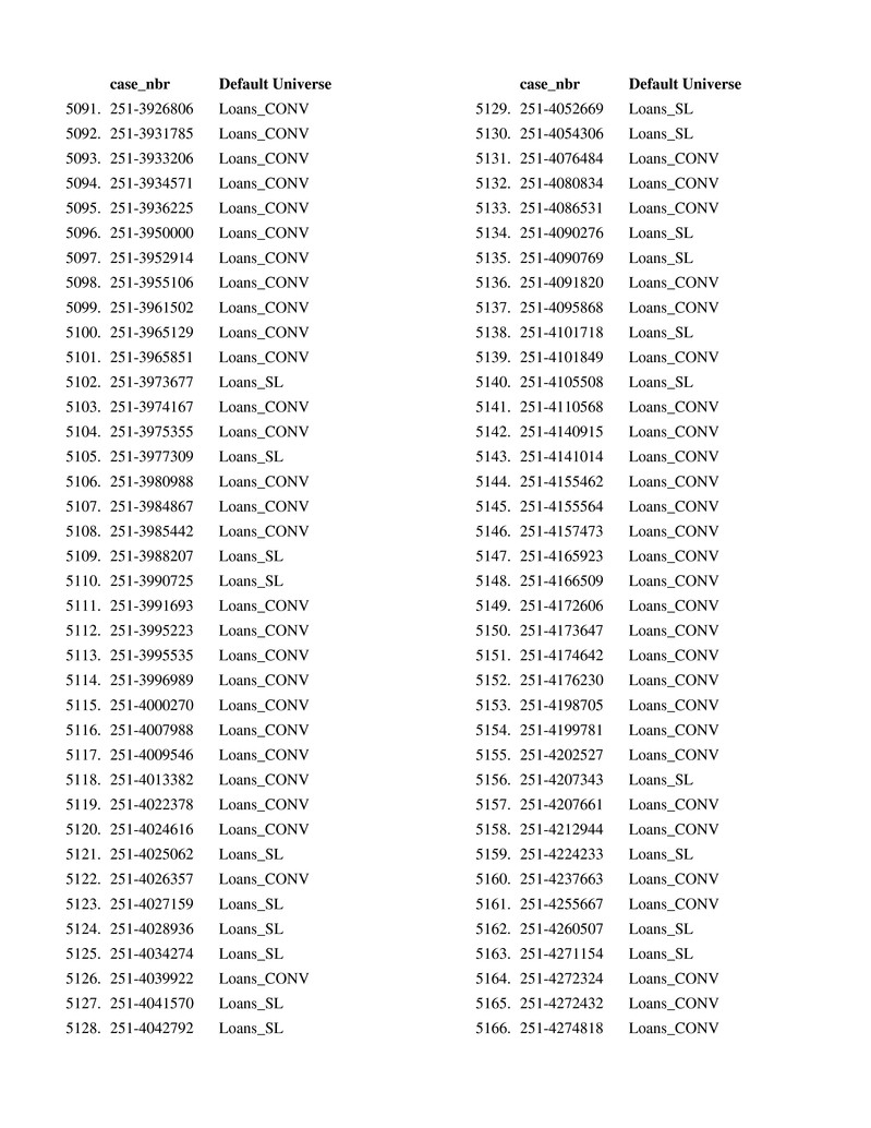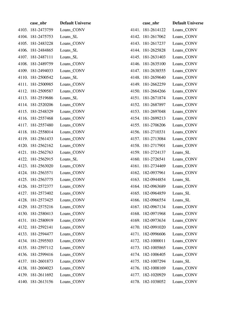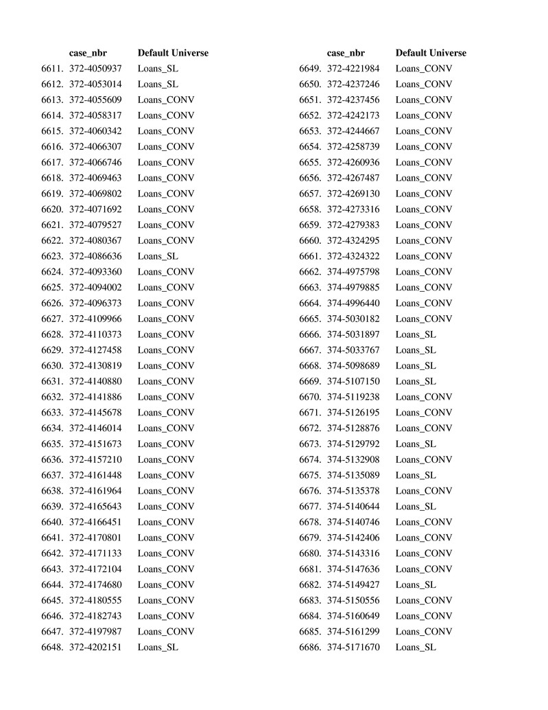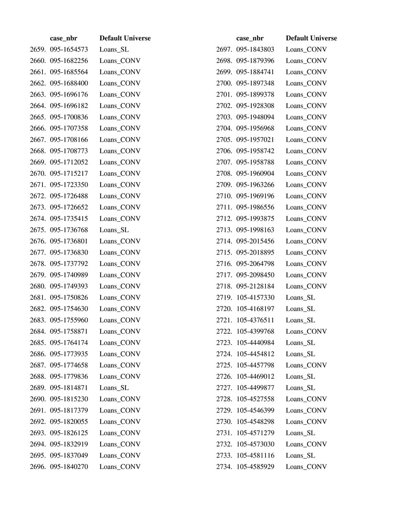 case_nbr Default Universe 75. 011-6643570 Loans_CONV 76. 011-6647181 Loans_CONV 77. 011-6652543 Loans_CONV 78. 011-6653923 Loans_CONV 79. 011-6656726 Loans_CONV 80. 011-6656892 Loans_CONV 81. 011-6657035 Loans_CONV 82. 011-6660369 Loans_CONV 83. 011-6666247 Loans_CONV 84. 011-6676142 Loans_CONV 85. 011-6679727 Loans_CONV 86. 011-6682443 Loans_CONV 87. 011-6686973 Loans_CONV 88. 011-6691661 Loans_CONV 89. 011-6693583 Loans_CONV 90. 011-6695867 Loans_CONV 91. 011-6701282 Loans_CONV 92. 011-6703342 Loans_CONV 93. 011-6704844 Loans_CONV 94. 011-6712790 Loans_CONV 95. 011-6721206 Loans_SL 96. 011-6729108 Loans_CONV 97. 011-6734750 Loans_CONV 98. 011-6747912 Loans_SL 99. 011-6748670 Loans_CONV 100. 011-6757535 Loans_CONV 101. 011-6759985 Loans_CONV 102. 011-6767453 Loans_SL 103. 011-6768080 Loans_CONV 104. 011-6768226 Loans_SL 105. 011-6770271 Loans_CONV 106. 011-6770939 Loans_CONV 107. 011-6771855 Loans_CONV 108. 011-6774040 Loans_CONV 109. 011-6780913 Loans_CONV 110. 011-6790825 Loans_CONV 111. 011-6791627 Loans_CONV 112. 011-6807581 Loans_CONV case_nbr Default Universe 113. 011-6812336 Loans_CONV 114. 011-6814206 Loans_CONV 115. 011-6820122 Loans_CONV 116. 011-6820979 Loans_CONV 117. 011-6823838 Loans_CONV 118. 011-6826601 Loans_CONV 119. 011-6828779 Loans_CONV 120. 011-6831971 Loans_CONV 121. 011-6840786 Loans_CONV 122. 011-6841378 Loans_CONV 123. 011-6848301 Loans_CONV 124. 011-6849552 Loans_CONV 125. 011-6858872 Loans_CONV 126. 011-6869709 Loans_CONV 127. 011-6870611 Loans_CONV 128. 011-6874301 Loans_CONV 129. 011-6883933 Loans_CONV 130. 011-6892567 Loans_CONV 131. 011-6903262 Loans_CONV 132. 011-6907366 Loans_CONV 133. 011-6913536 Loans_CONV 134. 011-6922039 Loans_CONV 135. 011-6929507 Loans_SL 136. 011-6982594 Loans_CONV 137. 011-7001559 Loans_CONV 138. 011-7020138 Loans_CONV 139. 011-7022326 Loans_CONV 140. 011-7067517 Loans_CONV 141. 011-7086922 Loans_CONV 142. 011-7142610 Loans_CONV 143. 022-2062797 Loans_CONV 144. 022-2063048 Loans_SL 145. 022-2063395 Loans_CONV 146. 022-2074375 Loans_SL 147. 022-2075466 Loans_CONV 148. 022-2076114 Loans_SL 149. 022-2079002 Loans_SL 150. 022-2079576 Loans_CONV