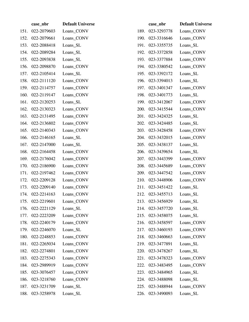 case_nbr Default Universe 151. 022-2079603 Loans_CONV 152. 022-2079661 Loans_CONV 153. 022-2088418 Loans_SL 154. 022-2089284 Loans_SL 155. 022-2093838 Loans_SL 156. 022-2098870 Loans_CONV 157. 022-2105414 Loans_SL 158. 022-2111120 Loans_CONV 159. 022-2114757 Loans_CONV 160. 022-2119147 Loans_CONV 161. 022-2120253 Loans_SL 162. 022-2130323 Loans_CONV 163. 022-2131495 Loans_CONV 164. 022-2136802 Loans_CONV 165. 022-2140343 Loans_CONV 166. 022-2146165 Loans_SL 167. 022-2147000 Loans_SL 168. 022-2164458 Loans_CONV 169. 022-2176042 Loans_CONV 170. 022-2186900 Loans_CONV 171. 022-2197462 Loans_CONV 172. 022-2209128 Loans_CONV 173. 022-2209140 Loans_CONV 174. 022-2214163 Loans_CONV 175. 022-2219601 Loans_CONV 176. 022-2221129 Loans_SL 177. 022-2223209 Loans_CONV 178. 022-2240179 Loans_CONV 179. 022-2246070 Loans_SL 180. 022-2248853 Loans_CONV 181. 022-2265034 Loans_CONV 182. 022-2274801 Loans_CONV 183. 022-2275343 Loans_CONV 184. 023-2989919 Loans_CONV 185. 023-3076457 Loans_CONV 186. 023-3218760 Loans_CONV 187. 023-3231709 Loans_SL 188. 023-3258978 Loans_SL case_nbr Default Universe 189. 023-3293778 Loans_CONV 190. 023-3316646 Loans_CONV 191. 023-3355735 Loans_SL 192. 023-3372858 Loans_CONV 193. 023-3377884 Loans_CONV 194. 023-3380542 Loans_CONV 195. 023-3392172 Loans_SL 196. 023-3394013 Loans_SL 197. 023-3401347 Loans_CONV 198. 023-3401773 Loans_SL 199. 023-3412067 Loans_CONV 200. 023-3415544 Loans_CONV 201. 023-3424325 Loans_SL 202. 023-3424485 Loans_SL 203. 023-3428458 Loans_CONV 204. 023-3432015 Loans_CONV 205. 023-3438137 Loans_SL 206. 023-3439654 Loans_SL 207. 023-3443399 Loans_CONV 208. 023-3445689 Loans_CONV 209. 023-3447542 Loans_CONV 210. 023-3448906 Loans_CONV 211. 023-3451422 Loans_SL 212. 023-3455713 Loans_SL 213. 023-3456929 Loans_SL 214. 023-3457720 Loans_SL 215. 023-3458075 Loans_SL 216. 023-3458597 Loans_CONV 217. 023-3460193 Loans_CONV 218. 023-3460663 Loans_CONV 219. 023-3477891 Loans_SL 220. 023-3478267 Loans_SL 221. 023-3478323 Loans_CONV 222. 023-3483495 Loans_CONV 223. 023-3484965 Loans_SL 224. 023-3488098 Loans_SL 225. 023-3488944 Loans_CONV 226. 023-3490093 Loans_SL