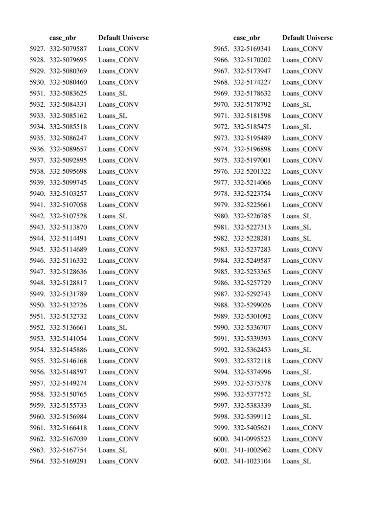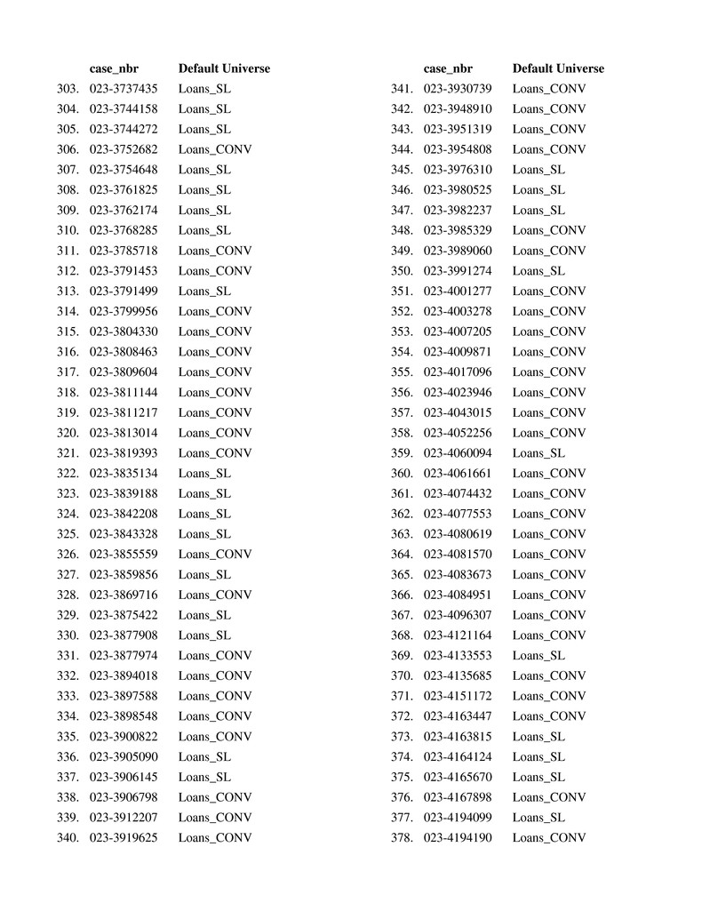 case_nbr Default Universe 303. 023-3737435 Loans_SL 304. 023-3744158 Loans_SL 305. 023-3744272 Loans_SL 306. 023-3752682 Loans_CONV 307. 023-3754648 Loans_SL 308. 023-3761825 Loans_SL 309. 023-3762174 Loans_SL 310. 023-3768285 Loans_SL 311. 023-3785718 Loans_CONV 312. 023-3791453 Loans_CONV 313. 023-3791499 Loans_SL 314. 023-3799956 Loans_CONV 315. 023-3804330 Loans_CONV 316. 023-3808463 Loans_CONV 317. 023-3809604 Loans_CONV 318. 023-3811144 Loans_CONV 319. 023-3811217 Loans_CONV 320. 023-3813014 Loans_CONV 321. 023-3819393 Loans_CONV 322. 023-3835134 Loans_SL 323. 023-3839188 Loans_SL 324. 023-3842208 Loans_SL 325. 023-3843328 Loans_SL 326. 023-3855559 Loans_CONV 327. 023-3859856 Loans_SL 328. 023-3869716 Loans_CONV 329. 023-3875422 Loans_SL 330. 023-3877908 Loans_SL 331. 023-3877974 Loans_CONV 332. 023-3894018 Loans_CONV 333. 023-3897588 Loans_CONV 334. 023-3898548 Loans_CONV 335. 023-3900822 Loans_CONV 336. 023-3905090 Loans_SL 337. 023-3906145 Loans_SL 338. 023-3906798 Loans_CONV 339. 023-3912207 Loans_CONV 340. 023-3919625 Loans_CONV case_nbr Default Universe 341. 023-3930739 Loans_CONV 342. 023-3948910 Loans_CONV 343. 023-3951319 Loans_CONV 344. 023-3954808 Loans_CONV 345. 023-3976310 Loans_SL 346. 023-3980525 Loans_SL 347. 023-3982237 Loans_SL 348. 023-3985329 Loans_CONV 349. 023-3989060 Loans_CONV 350. 023-3991274 Loans_SL 351. 023-4001277 Loans_CONV 352. 023-4003278 Loans_CONV 353. 023-4007205 Loans_CONV 354. 023-4009871 Loans_CONV 355. 023-4017096 Loans_CONV 356. 023-4023946 Loans_CONV 357. 023-4043015 Loans_CONV 358. 023-4052256 Loans_CONV 359. 023-4060094 Loans_SL 360. 023-4061661 Loans_CONV 361. 023-4074432 Loans_CONV 362. 023-4077553 Loans_CONV 363. 023-4080619 Loans_CONV 364. 023-4081570 Loans_CONV 365. 023-4083673 Loans_CONV 366. 023-4084951 Loans_CONV 367. 023-4096307 Loans_CONV 368. 023-4121164 Loans_CONV 369. 023-4133553 Loans_SL 370. 023-4135685 Loans_CONV 371. 023-4151172 Loans_CONV 372. 023-4163447 Loans_CONV 373. 023-4163815 Loans_SL 374. 023-4164124 Loans_SL 375. 023-4165670 Loans_SL 376. 023-4167898 Loans_CONV 377. 023-4194099 Loans_SL 378. 023-4194190 Loans_CONV