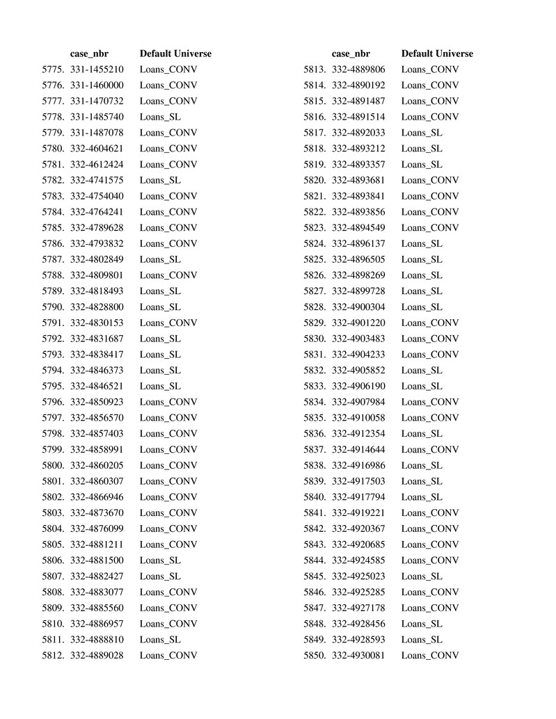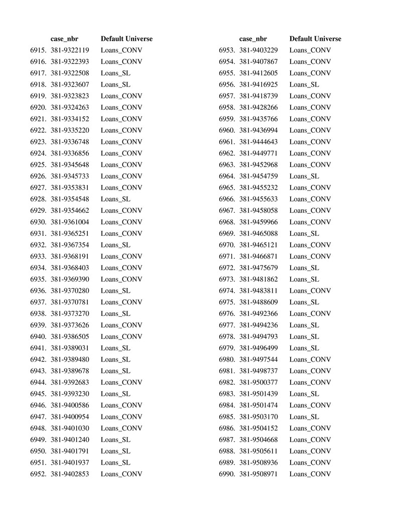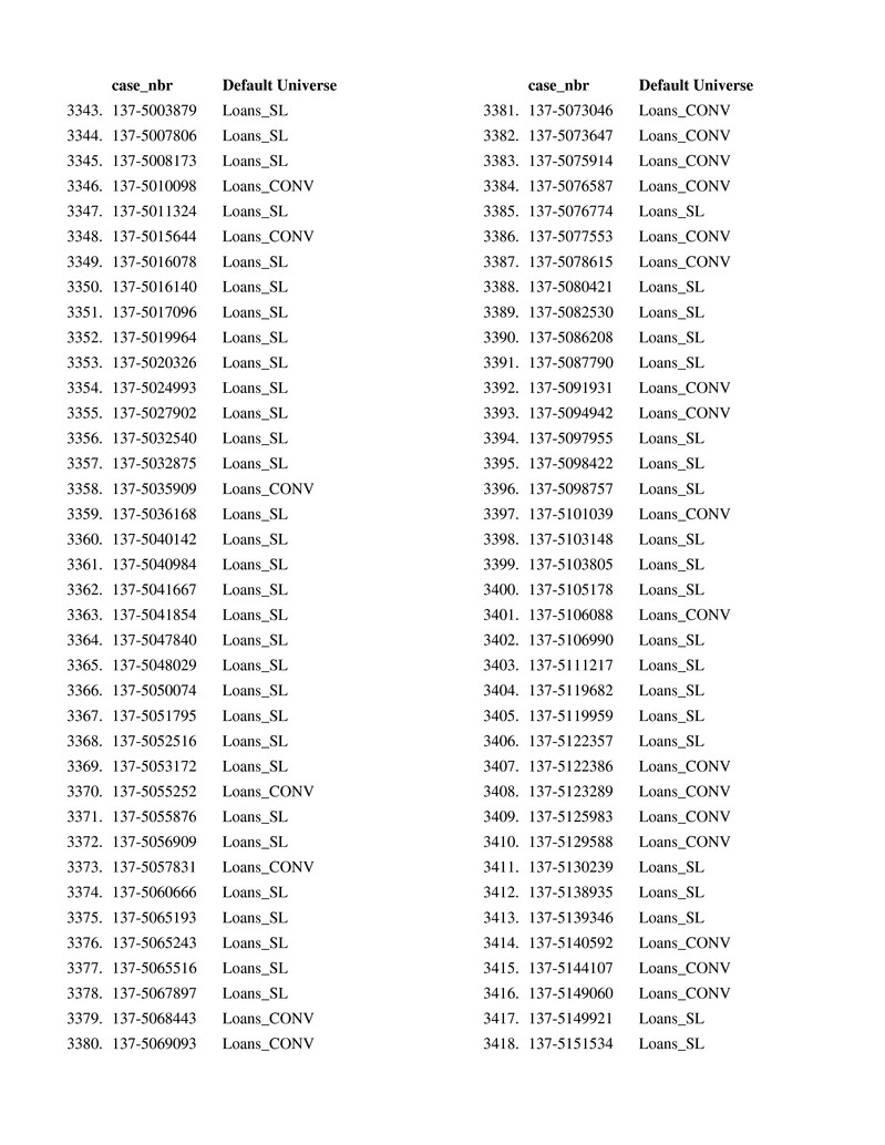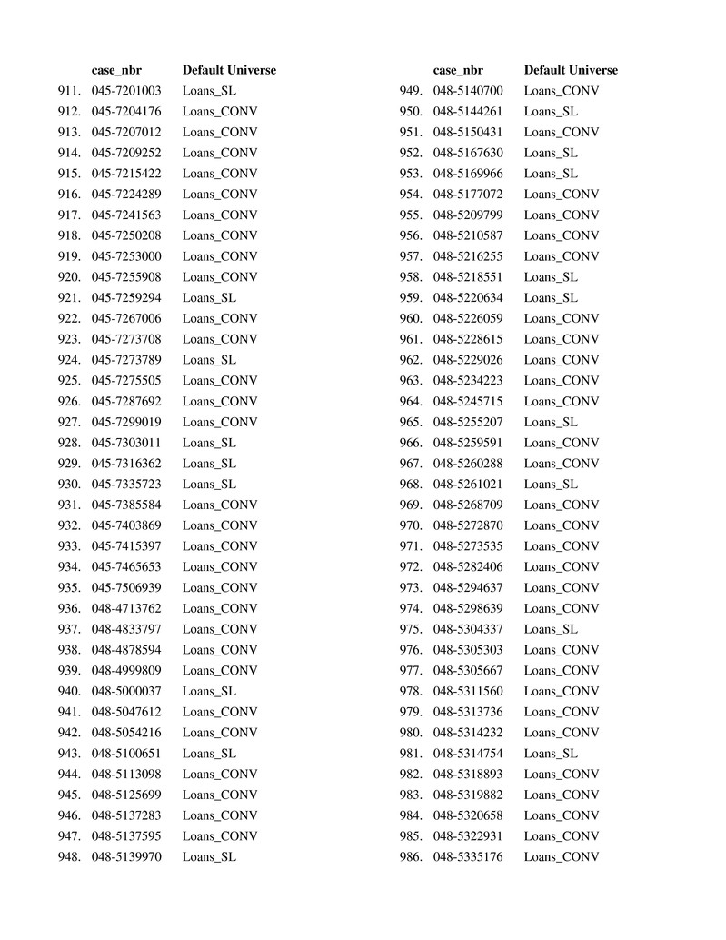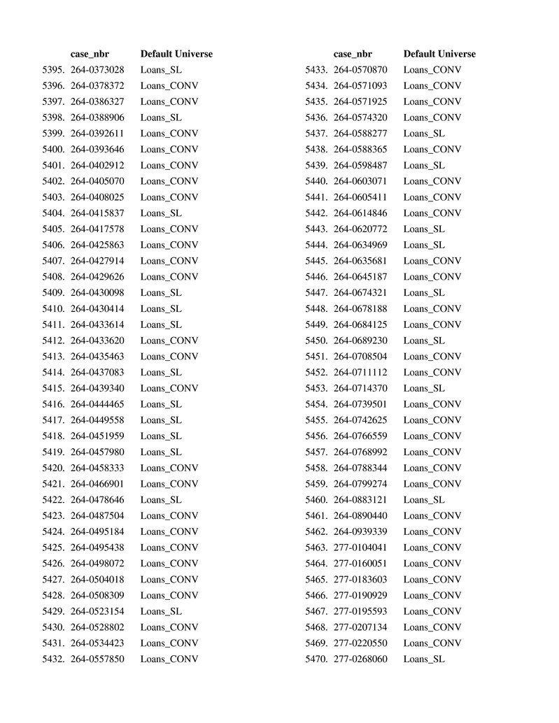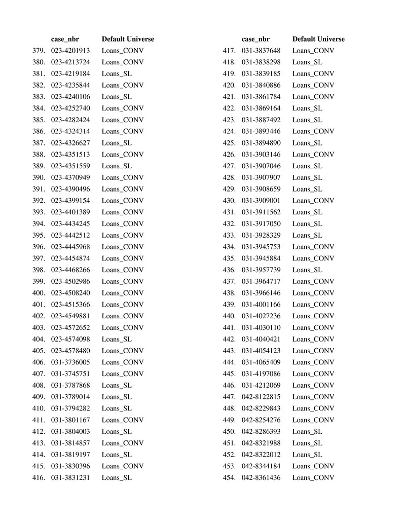 case_nbr Default Universe 379. 023-4201913 Loans_CONV 380. 023-4213724 Loans_CONV 381. 023-4219184 Loans_SL 382. 023-4235844 Loans_CONV 383. 023-4240106 Loans_SL 384. 023-4252740 Loans_CONV 385. 023-4282424 Loans_CONV 386. 023-4324314 Loans_CONV 387. 023-4326627 Loans_SL 388. 023-4351513 Loans_CONV 389. 023-4351559 Loans_SL 390. 023-4370949 Loans_CONV 391. 023-4390496 Loans_CONV 392. 023-4399154 Loans_CONV 393. 023-4401389 Loans_CONV 394. 023-4434245 Loans_CONV 395. 023-4442512 Loans_CONV 396. 023-4445968 Loans_CONV 397. 023-4454874 Loans_CONV 398. 023-4468266 Loans_CONV 399. 023-4502986 Loans_CONV 400. 023-4508240 Loans_CONV 401. 023-4515366 Loans_CONV 402. 023-4549881 Loans_CONV 403. 023-4572652 Loans_CONV 404. 023-4574098 Loans_SL 405. 023-4578480 Loans_CONV 406. 031-3736005 Loans_CONV 407. 031-3745751 Loans_CONV 408. 031-3787868 Loans_SL 409. 031-3789014 Loans_SL 410. 031-3794282 Loans_SL 411. 031-3801167 Loans_CONV 412. 031-3804003 Loans_SL 413. 031-3814857 Loans_CONV 414. 031-3819197 Loans_SL 415. 031-3830396 Loans_CONV 416. 031-3831231 Loans_SL case_nbr Default Universe 417. 031-3837648 Loans_CONV 418. 031-3838298 Loans_SL 419. 031-3839185 Loans_CONV 420. 031-3840886 Loans_CONV 421. 031-3861784 Loans_CONV 422. 031-3869164 Loans_SL 423. 031-3887492 Loans_SL 424. 031-3893446 Loans_CONV 425. 031-3894890 Loans_SL 426. 031-3903146 Loans_CONV 427. 031-3907046 Loans_SL 428. 031-3907907 Loans_SL 429. 031-3908659 Loans_SL 430. 031-3909001 Loans_CONV 431. 031-3911562 Loans_SL 432. 031-3917050 Loans_SL 433. 031-3928329 Loans_SL 434. 031-3945753 Loans_CONV 435. 031-3945884 Loans_CONV 436. 031-3957739 Loans_SL 437. 031-3964717 Loans_CONV 438. 031-3966146 Loans_CONV 439. 031-4001166 Loans_CONV 440. 031-4027236 Loans_CONV 441. 031-4030110 Loans_CONV 442. 031-4040421 Loans_CONV 443. 031-4054123 Loans_CONV 444. 031-4065409 Loans_CONV 445. 031-4197086 Loans_CONV 446. 031-4212069 Loans_CONV 447. 042-8122815 Loans_CONV 448. 042-8229843 Loans_CONV 449. 042-8254276 Loans_CONV 450. 042-8286393 Loans_SL 451. 042-8321988 Loans_SL 452. 042-8322012 Loans_SL 453. 042-8344184 Loans_CONV 454. 042-8361436 Loans_CONV
