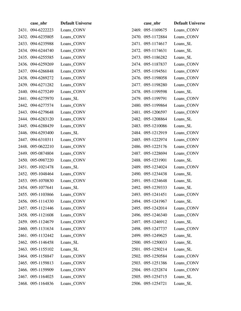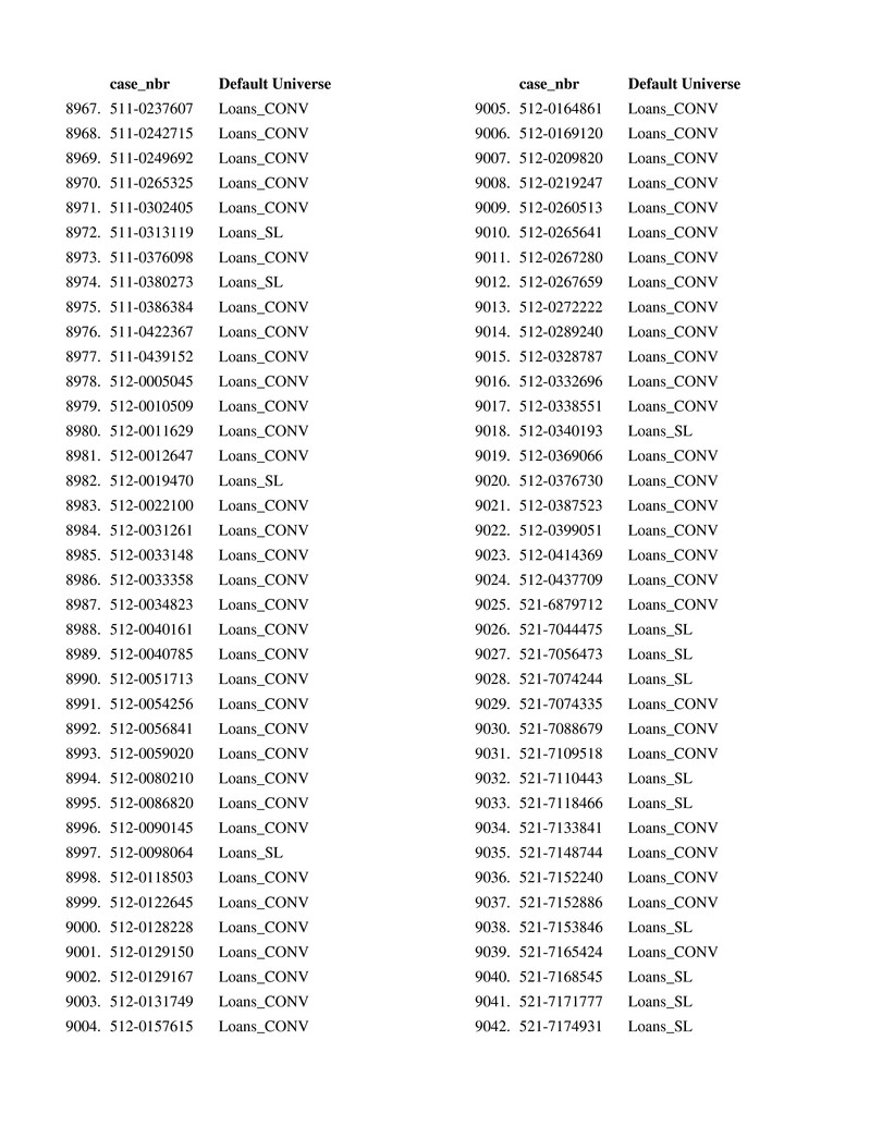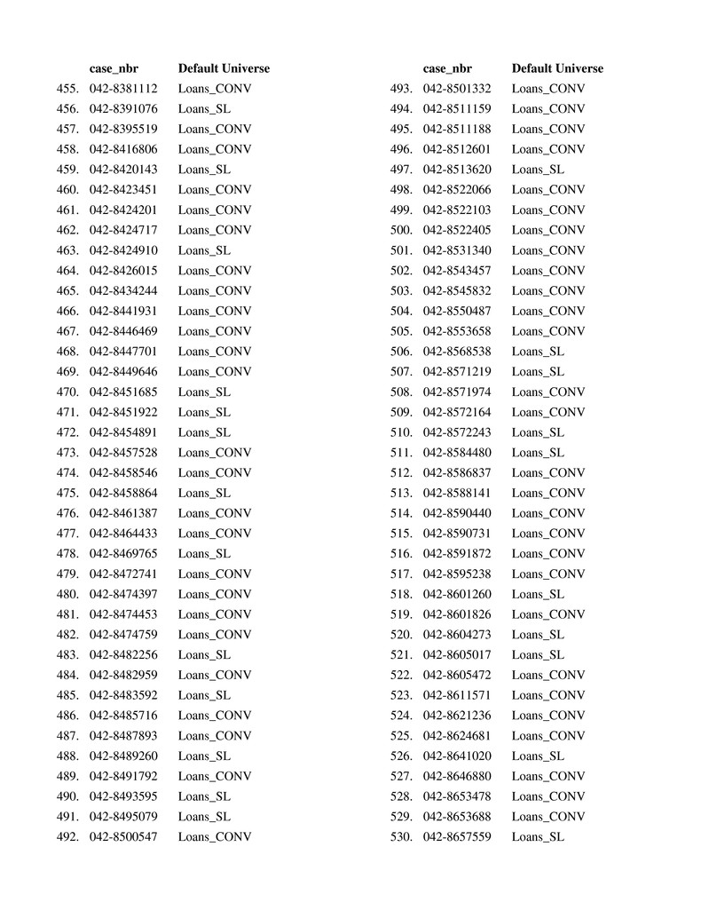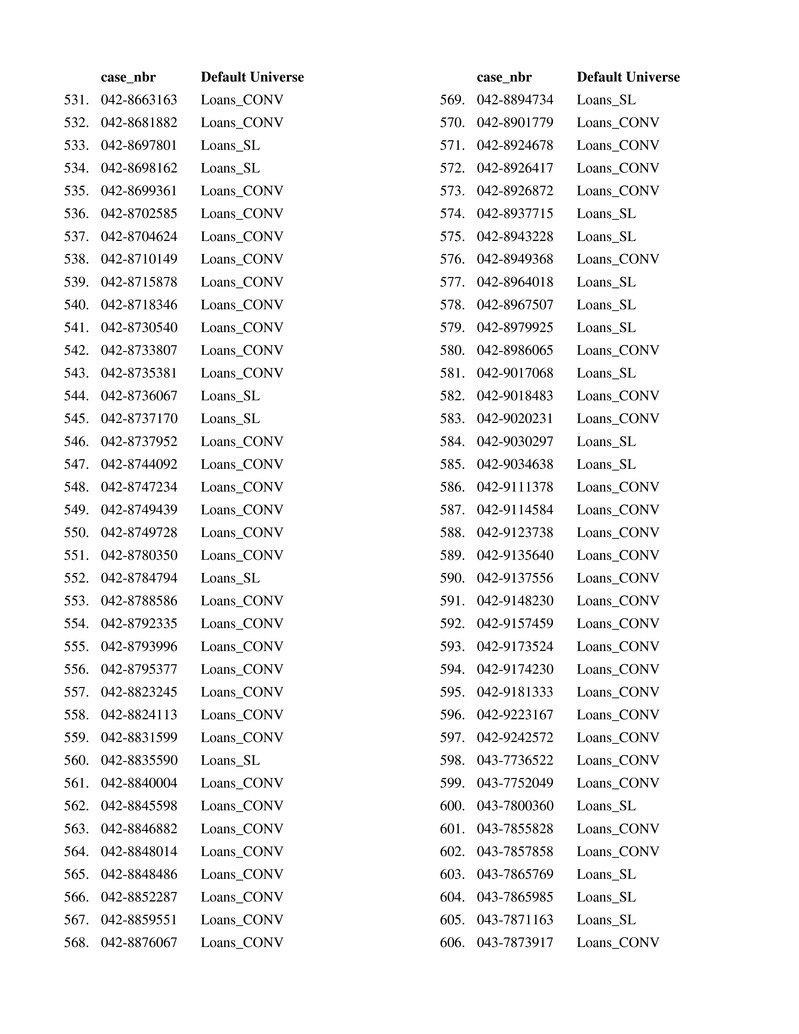 case_nbr Default Universe 455. 042-8381112 Loans_CONV 456. 042-8391076 Loans_SL 457. 042-8395519 Loans_CONV 458. 042-8416806 Loans_CONV 459. 042-8420143 Loans_SL 460. 042-8423451 Loans_CONV 461. 042-8424201 Loans_CONV 462. 042-8424717 Loans_CONV 463. 042-8424910 Loans_SL 464. 042-8426015 Loans_CONV 465. 042-8434244 Loans_CONV 466. 042-8441931 Loans_CONV 467. 042-8446469 Loans_CONV 468. 042-8447701 Loans_CONV 469. 042-8449646 Loans_CONV 470. 042-8451685 Loans_SL 471. 042-8451922 Loans_SL 472. 042-8454891 Loans_SL 473. 042-8457528 Loans_CONV 474. 042-8458546 Loans_CONV 475. 042-8458864 Loans_SL 476. 042-8461387 Loans_CONV 477. 042-8464433 Loans_CONV 478. 042-8469765 Loans_SL 479. 042-8472741 Loans_CONV 480. 042-8474397 Loans_CONV 481. 042-8474453 Loans_CONV 482. 042-8474759 Loans_CONV 483. 042-8482256 Loans_SL 484. 042-8482959 Loans_CONV 485. 042-8483592 Loans_SL 486. 042-8485716 Loans_CONV 487. 042-8487893 Loans_CONV 488. 042-8489260 Loans_SL 489. 042-8491792 Loans_CONV 490. 042-8493595 Loans_SL 491. 042-8495079 Loans_SL 492. 042-8500547 Loans_CONV case_nbr Default Universe 493. 042-8501332 Loans_CONV 494. 042-8511159 Loans_CONV 495. 042-8511188 Loans_CONV 496. 042-8512601 Loans_CONV 497. 042-8513620 Loans_SL 498. 042-8522066 Loans_CONV 499. 042-8522103 Loans_CONV 500. 042-8522405 Loans_CONV 501. 042-8531340 Loans_CONV 502. 042-8543457 Loans_CONV 503. 042-8545832 Loans_CONV 504. 042-8550487 Loans_CONV 505. 042-8553658 Loans_CONV 506. 042-8568538 Loans_SL 507. 042-8571219 Loans_SL 508. 042-8571974 Loans_CONV 509. 042-8572164 Loans_CONV 510. 042-8572243 Loans_SL 511. 042-8584480 Loans_SL 512. 042-8586837 Loans_CONV 513. 042-8588141 Loans_CONV 514. 042-8590440 Loans_CONV 515. 042-8590731 Loans_CONV 516. 042-8591872 Loans_CONV 517. 042-8595238 Loans_CONV 518. 042-8601260 Loans_SL 519. 042-8601826 Loans_CONV 520. 042-8604273 Loans_SL 521. 042-8605017 Loans_SL 522. 042-8605472 Loans_CONV 523. 042-8611571 Loans_CONV 524. 042-8621236 Loans_CONV 525. 042-8624681 Loans_CONV 526. 042-8641020 Loans_SL 527. 042-8646880 Loans_CONV 528. 042-8653478 Loans_CONV 529. 042-8653688 Loans_CONV 530. 042-8657559 Loans_SL