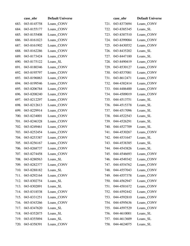 case_nbr Default Universe 683. 043-8145758 Loans_CONV 684. 043-8155177 Loans_CONV 685. 043-8155408 Loans_CONV 686. 043-8161823 Loans_CONV 687. 043-8161902 Loans_CONV 688. 043-8162286 Loans_CONV 689. 043-8173424 Loans_CONV 690. 043-8175122 Loans_SL 691. 043-8180346 Loans_CONV 692. 043-8195797 Loans_CONV 693. 043-8196063 Loans_CONV 694. 043-8199546 Loans_CONV 695. 043-8206784 Loans_CONV 696. 043-8208240 Loans_CONV 697. 043-8212297 Loans_CONV 698. 043-8212613 Loans_CONV 699. 043-8229914 Loans_CONV 700. 043-8234001 Loans_CONV 701. 043-8246328 Loans_CONV 702. 043-8249461 Loans_CONV 703. 043-8252454 Loans_CONV 704. 043-8253387 Loans_CONV 705. 043-8256167 Loans_CONV 706. 043-8268737 Loans_CONV 707. 043-8274458 Loans_CONV 708. 043-8280563 Loans_SL 709. 043-8282377 Loans_CONV 710. 043-8288182 Loans_SL 711. 043-8292164 Loans_CONV 712. 043-8302754 Loans_SL 713. 043-8302891 Loans_SL 714. 043-8318538 Loans_CONV 715. 043-8331251 Loans_CONV 716. 043-8343266 Loans_CONV 717. 043-8347620 Loans_SL 718. 043-8352875 Loans_SL 719. 043-8355894 Loans_SL 720. 043-8358391 Loans_CONV case_nbr Default Universe 721. 043-8373694 Loans_CONV 722. 043-8385345 Loans_SL 723. 043-8387510 Loans_CONV 724. 043-8399084 Loans_CONV 725. 043-8430552 Loans_CONV 726. 043-8435202 Loans_SL 727. 043-8447180 Loans_SL 728. 043-8490419 Loans_CONV 729. 043-8530127 Loans_CONV 730. 043-8537081 Loans_CONV 731. 043-8612471 Loans_CONV 732. 044-4382414 Loans_CONV 733. 044-4486400 Loans_CONV 734. 044-4509019 Loans_CONV 735. 044-4513751 Loans_SL 736. 044-4515378 Loans_SL 737. 044-4517096 Loans_SL 738. 044-4522543 Loans_SL 739. 044-4526291 Loans_SL 740. 044-4527709 Loans_SL 741. 044-4530267 Loans_CONV 742. 044-4531647 Loans_SL 743. 044-4538385 Loans_SL 744. 044-4543826 Loans_SL 745. 044-4546693 Loans_CONV 746. 044-4549342 Loans_CONV 747. 044-4554762 Loans_CONV 748. 044-4557043 Loans_CONV 749. 044-4557378 Loans_CONV 750. 044-4562947 Loans_CONV 751. 044-4581672 Loans_CONV 752. 044-4592442 Loans_CONV 753. 044-4592810 Loans_CONV 754. 044-4595636 Loans_CONV 755. 044-4597529 Loans_CONV 756. 044-4610001 Loans_SL 757. 044-4613609 Loans_SL 758. 044-4624075 Loans_SL
