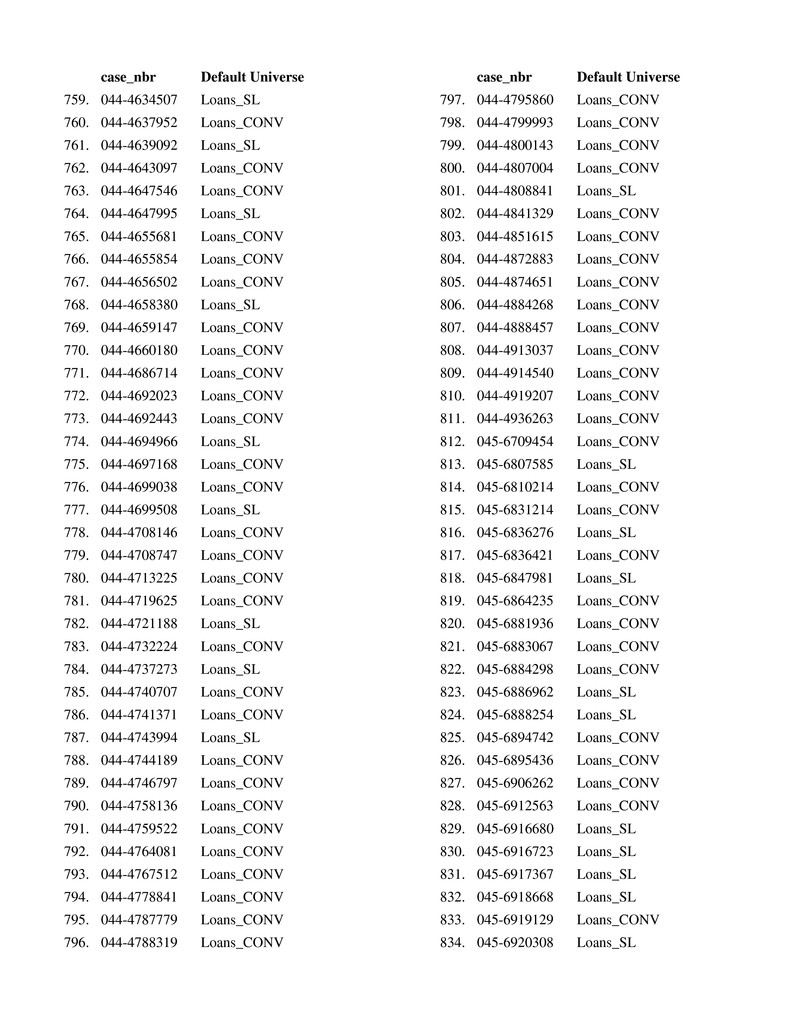 case_nbr Default Universe 835. 045-6921819 Loans_CONV 836. 045-6922685 Loans_SL 837. 045-6922922 Loans_CONV 838. 045-6923826 Loans_CONV 839. 045-6925124 Loans_CONV 840. 045-6929791 Loans_CONV 841. 045-6929995 Loans_SL 842. 045-6937615 Loans_SL 843. 045-6940506 Loans_SL 844. 045-6943321 Loans_SL 845. 045-6945707 Loans_CONV 846. 045-6950316 Loans_SL 847. 045-6950794 Loans_CONV 848. 045-6959128 Loans_CONV 849. 045-6960371 Loans_CONV 850. 045-6966465 Loans_CONV 851. 045-6967935 Loans_CONV 852. 045-6968171 Loans_CONV 853. 045-6974098 Loans_CONV 854. 045-6976323 Loans_CONV 855. 045-6976704 Loans_CONV 856. 045-6982059 Loans_CONV 857. 045-6982702 Loans_CONV 858. 045-6983179 Loans_CONV 859. 045-6989369 Loans_CONV 860. 045-6992657 Loans_CONV 861. 045-6996852 Loans_SL 862. 045-7001677 Loans_CONV 863. 045-7002383 Loans_CONV 864. 045-7003025 Loans_CONV 865. 045-7004361 Loans_CONV 866. 045-7009107 Loans_CONV 867. 045-7016954 Loans_SL 868. 045-7018252 Loans_SL 869. 045-7019763 Loans_CONV 870. 045-7020580 Loans_SL 871. 045-7024894 Loans_CONV 872. 045-7030139 Loans_CONV case_nbr Default Universe 873. 045-7033256 Loans_CONV 874. 045-7034929 Loans_SL 875. 045-7036453 Loans_CONV 876. 045-7038205 Loans_CONV 877. 045-7041568 Loans_CONV 878. 045-7041988 Loans_CONV 879. 045-7042280 Loans_CONV 880. 045-7046151 Loans_CONV 881. 045-7048639 Loans_SL 882. 045-7052003 Loans_CONV 883. 045-7052157 Loans_SL 884. 045-7065672 Loans_SL 885. 045-7076783 Loans_CONV 886. 045-7081255 Loans_CONV 887. 045-7081725 Loans_CONV 888. 045-7083965 Loans_SL 889. 045-7084665 Loans_SL 890. 045-7085161 Loans_CONV 891. 045-7094945 Loans_SL 892. 045-7097935 Loans_SL 893. 045-7102332 Loans_SL 894. 045-7106130 Loans_SL 895. 045-7116949 Loans_CONV 896. 045-7118696 Loans_CONV 897. 045-7119396 Loans_CONV 898. 045-7132413 Loans_CONV 899. 045-7146537 Loans_CONV 900. 045-7162359 Loans_CONV 901. 045-7166207 Loans_CONV 902. 045-7168135 Loans_CONV 903. 045-7172799 Loans_CONV 904. 045-7173220 Loans_CONV 905. 045-7179932 Loans_CONV 906. 045-7180238 Loans_SL 907. 045-7180244 Loans_CONV 908. 045-7186072 Loans_CONV 909. 045-7191230 Loans_CONV 910. 045-7192446 Loans_CONV