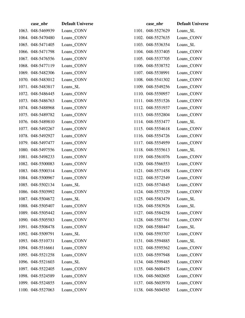 case_nbr Default Universe 1063. 048-5469939 Loans_CONV 1064. 048-5470480 Loans_CONV 1065. 048-5471405 Loans_CONV 1066. 048-5471798 Loans_CONV 1067. 048-5476556 Loans_CONV 1068. 048-5477119 Loans_CONV 1069. 048-5482306 Loans_CONV 1070. 048-5483012 Loans_CONV 1071. 048-5483817 Loans_SL 1072. 048-5486445 Loans_CONV 1073. 048-5486763 Loans_CONV 1074. 048-5488968 Loans_CONV 1075. 048-5489782 Loans_CONV 1076. 048-5489810 Loans_CONV 1077. 048-5492267 Loans_CONV 1078. 048-5492927 Loans_CONV 1079. 048-5497477 Loans_CONV 1080. 048-5497556 Loans_CONV 1081. 048-5498233 Loans_CONV 1082. 048-5500083 Loans_CONV 1083. 048-5500314 Loans_CONV 1084. 048-5500967 Loans_CONV 1085. 048-5502134 Loans_SL 1086. 048-5503992 Loans_CONV 1087. 048-5504672 Loans_SL 1088. 048-5505407 Loans_CONV 1089. 048-5505442 Loans_CONV 1090. 048-5505583 Loans_CONV 1091. 048-5508478 Loans_CONV 1092. 048-5509791 Loans_SL 1093. 048-5510731 Loans_CONV 1094. 048-5516661 Loans_CONV 1095. 048-5521258 Loans_CONV 1096. 048-5521603 Loans_SL 1097. 048-5522405 Loans_CONV 1098. 048-5524589 Loans_CONV 1099. 048-5524855 Loans_CONV 1100. 048-5527063 Loans_CONV case_nbr Default Universe 1101. 048-5527629 Loans_SL 1102. 048-5527635 Loans_CONV 1103. 048-5536354 Loans_SL 1104. 048-5537405 Loans_CONV 1105. 048-5537705 Loans_CONV 1106. 048-5538752 Loans_CONV 1107. 048-5538991 Loans_CONV 1108. 048-5541302 Loans_CONV 1109. 048-5549256 Loans_CONV 1110. 048-5550957 Loans_CONV 1111. 048-5551526 Loans_CONV 1112. 048-5551937 Loans_CONV 1113. 048-5552804 Loans_CONV 1114. 048-5553477 Loans_SL 1115. 048-5554618 Loans_CONV 1116. 048-5554726 Loans_CONV 1117. 048-5554959 Loans_CONV 1118. 048-5555613 Loans_SL 1119. 048-5561076 Loans_CONV 1120. 048-5566553 Loans_CONV 1121. 048-5571458 Loans_CONV 1122. 048-5572549 Loans_CONV 1123. 048-5574845 Loans_CONV 1124. 048-5575329 Loans_CONV 1125. 048-5583479 Loans_SL 1126. 048-5583926 Loans_SL 1127. 048-5584258 Loans_CONV 1128. 048-5587761 Loans_CONV 1129. 048-5588447 Loans_SL 1130. 048-5593707 Loans_CONV 1131. 048-5594885 Loans_SL 1132. 048-5595562 Loans_CONV 1133. 048-5597948 Loans_CONV 1134. 048-5599485 Loans_CONV 1135. 048-5600475 Loans_CONV 1136. 048-5602605 Loans_CONV 1137. 048-5603970 Loans_CONV 1138. 048-5604585 Loans_CONV