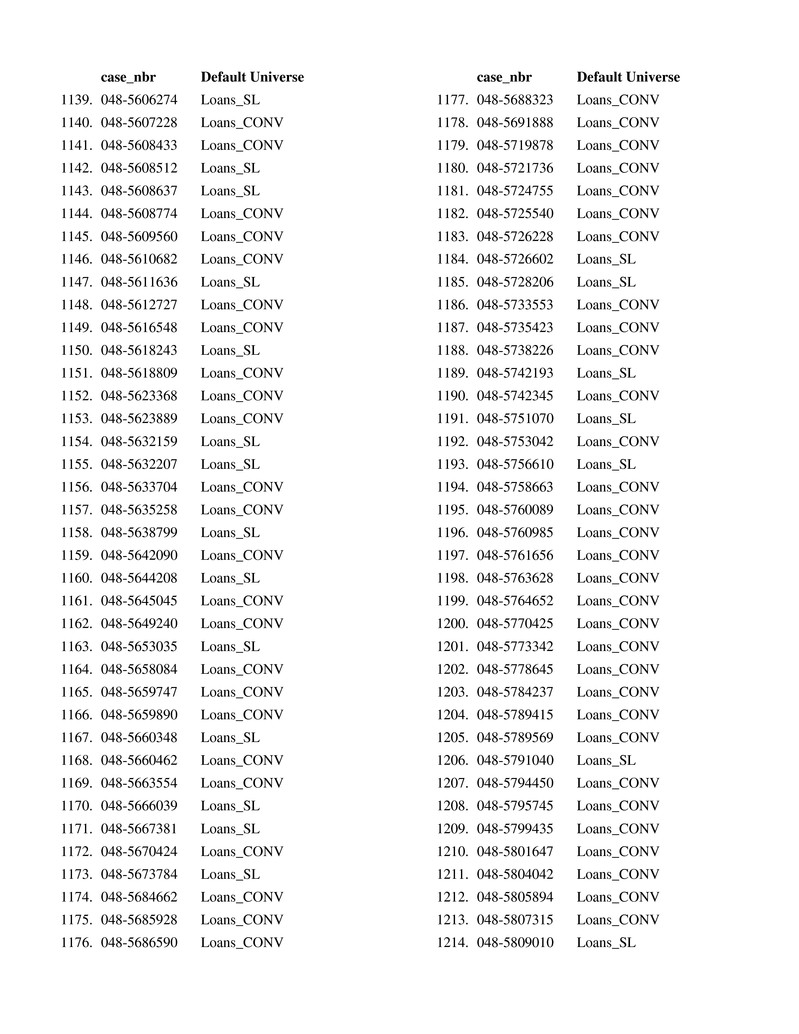 case_nbr Default Universe 1139. 048-5606274 Loans_SL 1140. 048-5607228 Loans_CONV 1141. 048-5608433 Loans_CONV 1142. 048-5608512 Loans_SL 1143. 048-5608637 Loans_SL 1144. 048-5608774 Loans_CONV 1145. 048-5609560 Loans_CONV 1146. 048-5610682 Loans_CONV 1147. 048-5611636 Loans_SL 1148. 048-5612727 Loans_CONV 1149. 048-5616548 Loans_CONV 1150. 048-5618243 Loans_SL 1151. 048-5618809 Loans_CONV 1152. 048-5623368 Loans_CONV 1153. 048-5623889 Loans_CONV 1154. 048-5632159 Loans_SL 1155. 048-5632207 Loans_SL 1156. 048-5633704 Loans_CONV 1157. 048-5635258 Loans_CONV 1158. 048-5638799 Loans_SL 1159. 048-5642090 Loans_CONV 1160. 048-5644208 Loans_SL 1161. 048-5645045 Loans_CONV 1162. 048-5649240 Loans_CONV 1163. 048-5653035 Loans_SL 1164. 048-5658084 Loans_CONV 1165. 048-5659747 Loans_CONV 1166. 048-5659890 Loans_CONV 1167. 048-5660348 Loans_SL 1168. 048-5660462 Loans_CONV 1169. 048-5663554 Loans_CONV 1170. 048-5666039 Loans_SL 1171. 048-5667381 Loans_SL 1172. 048-5670424 Loans_CONV 1173. 048-5673784 Loans_SL 1174. 048-5684662 Loans_CONV 1175. 048-5685928 Loans_CONV 1176. 048-5686590 Loans_CONV case_nbr Default Universe 1177. 048-5688323 Loans_CONV 1178. 048-5691888 Loans_CONV 1179. 048-5719878 Loans_CONV 1180. 048-5721736 Loans_CONV 1181. 048-5724755 Loans_CONV 1182. 048-5725540 Loans_CONV 1183. 048-5726228 Loans_CONV 1184. 048-5726602 Loans_SL 1185. 048-5728206 Loans_SL 1186. 048-5733553 Loans_CONV 1187. 048-5735423 Loans_CONV 1188. 048-5738226 Loans_CONV 1189. 048-5742193 Loans_SL 1190. 048-5742345 Loans_CONV 1191. 048-5751070 Loans_SL 1192. 048-5753042 Loans_CONV 1193. 048-5756610 Loans_SL 1194. 048-5758663 Loans_CONV 1195. 048-5760089 Loans_CONV 1196. 048-5760985 Loans_CONV 1197. 048-5761656 Loans_CONV 1198. 048-5763628 Loans_CONV 1199. 048-5764652 Loans_CONV 1200. 048-5770425 Loans_CONV 1201. 048-5773342 Loans_CONV 1202. 048-5778645 Loans_CONV 1203. 048-5784237 Loans_CONV 1204. 048-5789415 Loans_CONV 1205. 048-5789569 Loans_CONV 1206. 048-5791040 Loans_SL 1207. 048-5794450 Loans_CONV 1208. 048-5795745 Loans_CONV 1209. 048-5799435 Loans_CONV 1210. 048-5801647 Loans_CONV 1211. 048-5804042 Loans_CONV 1212. 048-5805894 Loans_CONV 1213. 048-5807315 Loans_CONV 1214. 048-5809010 Loans_SL