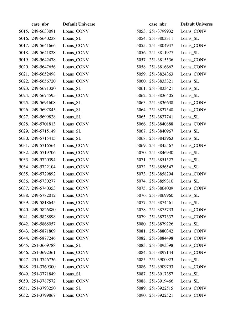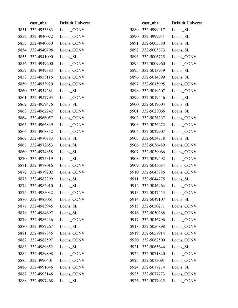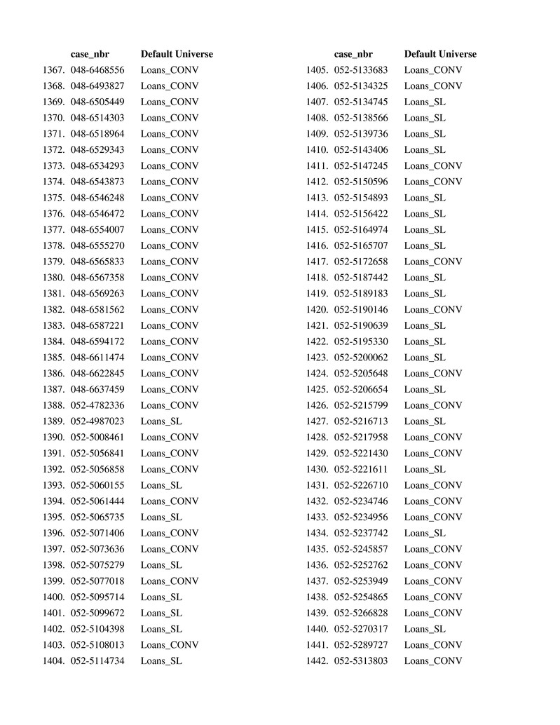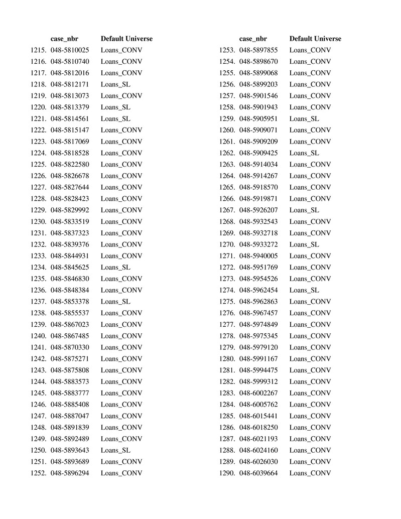 case_nbr Default Universe 987. 048-5336300 Loans_CONV 988. 048-5338977 Loans_SL 989. 048-5339240 Loans_SL 990. 048-5344727 Loans_CONV 991. 048-5346445 Loans_SL 992. 048-5346690 Loans_CONV 993. 048-5347264 Loans_SL 994. 048-5348236 Loans_CONV 995. 048-5349100 Loans_SL 996. 048-5352732 Loans_SL 997. 048-5356163 Loans_CONV 998. 048-5357490 Loans_CONV 999. 048-5359120 Loans_SL 1000. 048-5359274 Loans_SL 1001. 048-5359738 Loans_CONV 1002. 048-5360345 Loans_CONV 1003. 048-5361754 Loans_SL 1004. 048-5362591 Loans_CONV 1005. 048-5366042 Loans_SL 1006. 048-5368247 Loans_SL 1007. 048-5370359 Loans_CONV 1008. 048-5372613 Loans_SL 1009. 048-5372938 Loans_SL 1010. 048-5373355 Loans_SL 1011. 048-5373723 Loans_CONV 1012. 048-5377617 Loans_CONV 1013. 048-5378063 Loans_CONV 1014. 048-5378092 Loans_SL 1015. 048-5380543 Loans_CONV 1016. 048-5382334 Loans_SL 1017. 048-5382392 Loans_SL 1018. 048-5390715 Loans_CONV 1019. 048-5390925 Loans_CONV 1020. 048-5391500 Loans_CONV 1021. 048-5392088 Loans_SL 1022. 048-5395344 Loans_CONV 1023. 048-5396782 Loans_CONV 1024. 048-5397611 Loans_CONV case_nbr Default Universe 1025. 048-5397678 Loans_CONV 1026. 048-5398290 Loans_CONV 1027. 048-5398681 Loans_SL 1028. 048-5398748 Loans_SL 1029. 048-5403819 Loans_CONV 1030. 048-5404134 Loans_SL 1031. 048-5406368 Loans_CONV 1032. 048-5406374 Loans_CONV 1033. 048-5407584 Loans_SL 1034. 048-5409329 Loans_CONV 1035. 048-5413273 Loans_CONV 1036. 048-5416444 Loans_CONV 1037. 048-5417926 Loans_SL 1038. 048-5418002 Loans_CONV 1039. 048-5423821 Loans_CONV 1040. 048-5424355 Loans_SL 1041. 048-5424492 Loans_SL 1042. 048-5427549 Loans_CONV 1043. 048-5427939 Loans_CONV 1044. 048-5428748 Loans_CONV 1045. 048-5430259 Loans_SL 1046. 048-5431911 Loans_SL 1047. 048-5432736 Loans_SL 1048. 048-5434483 Loans_SL 1049. 048-5435240 Loans_CONV 1050. 048-5437184 Loans_CONV 1051. 048-5438830 Loans_CONV 1052. 048-5440495 Loans_SL 1053. 048-5444524 Loans_CONV 1054. 048-5448476 Loans_SL 1055. 048-5449436 Loans_CONV 1056. 048-5454097 Loans_SL 1057. 048-5454725 Loans_SL 1058. 048-5455641 Loans_CONV 1059. 048-5455918 Loans_CONV 1060. 048-5456907 Loans_CONV 1061. 048-5466253 Loans_CONV 1062. 048-5467787 Loans_CONV