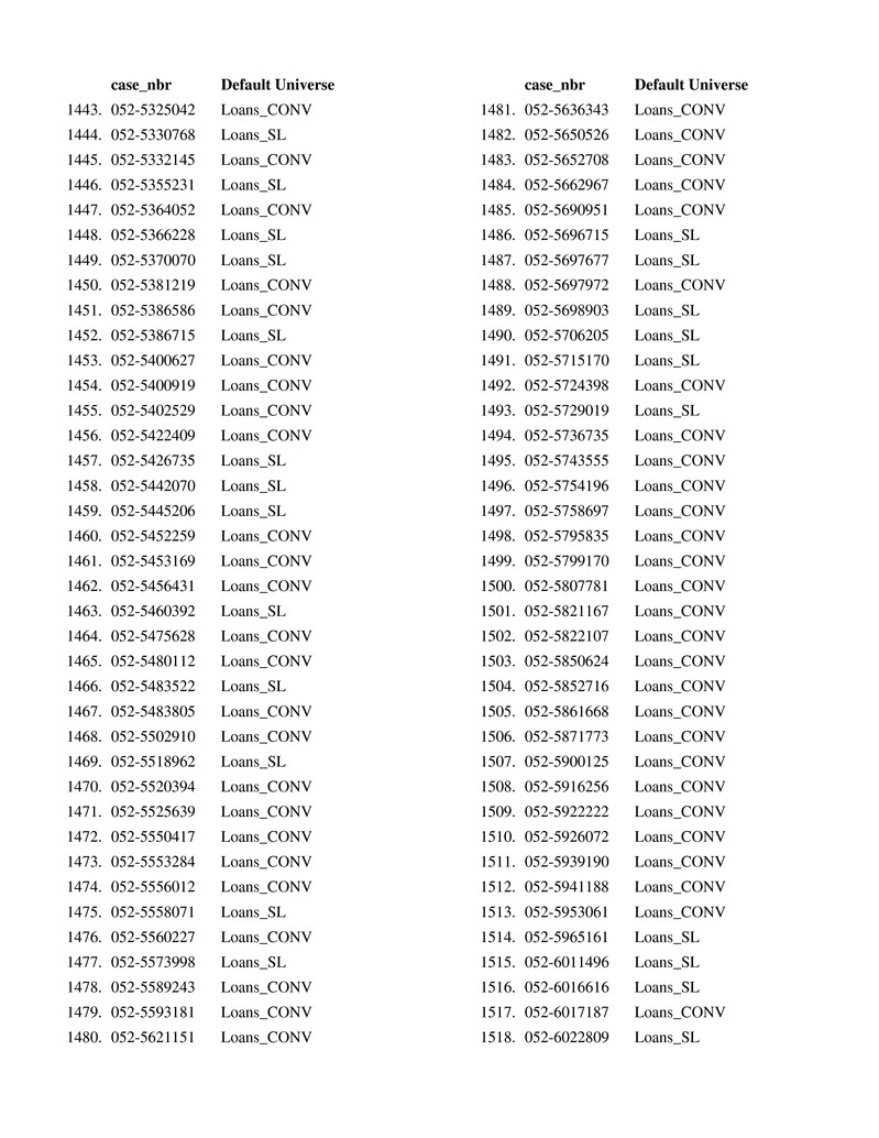 case_nbr Default Universe 1443. 052-5325042 Loans_CONV 1444. 052-5330768 Loans_SL 1445. 052-5332145 Loans_CONV 1446. 052-5355231 Loans_SL 1447. 052-5364052 Loans_CONV 1448. 052-5366228 Loans_SL 1449. 052-5370070 Loans_SL 1450. 052-5381219 Loans_CONV 1451. 052-5386586 Loans_CONV 1452. 052-5386715 Loans_SL 1453. 052-5400627 Loans_CONV 1454. 052-5400919 Loans_CONV 1455. 052-5402529 Loans_CONV 1456. 052-5422409 Loans_CONV 1457. 052-5426735 Loans_SL 1458. 052-5442070 Loans_SL 1459. 052-5445206 Loans_SL 1460. 052-5452259 Loans_CONV 1461. 052-5453169 Loans_CONV 1462. 052-5456431 Loans_CONV 1463. 052-5460392 Loans_SL 1464. 052-5475628 Loans_CONV 1465. 052-5480112 Loans_CONV 1466. 052-5483522 Loans_SL 1467. 052-5483805 Loans_CONV 1468. 052-5502910 Loans_CONV 1469. 052-5518962 Loans_SL 1470. 052-5520394 Loans_CONV 1471. 052-5525639 Loans_CONV 1472. 052-5550417 Loans_CONV 1473. 052-5553284 Loans_CONV 1474. 052-5556012 Loans_CONV 1475. 052-5558071 Loans_SL 1476. 052-5560227 Loans_CONV 1477. 052-5573998 Loans_SL 1478. 052-5589243 Loans_CONV 1479. 052-5593181 Loans_CONV 1480. 052-5621151 Loans_CONV case_nbr Default Universe 1481. 052-5636343 Loans_CONV 1482. 052-5650526 Loans_CONV 1483. 052-5652708 Loans_CONV 1484. 052-5662967 Loans_CONV 1485. 052-5690951 Loans_CONV 1486. 052-5696715 Loans_SL 1487. 052-5697677 Loans_SL 1488. 052-5697972 Loans_CONV 1489. 052-5698903 Loans_SL 1490. 052-5706205 Loans_SL 1491. 052-5715170 Loans_SL 1492. 052-5724398 Loans_CONV 1493. 052-5729019 Loans_SL 1494. 052-5736735 Loans_CONV 1495. 052-5743555 Loans_CONV 1496. 052-5754196 Loans_CONV 1497. 052-5758697 Loans_CONV 1498. 052-5795835 Loans_CONV 1499. 052-5799170 Loans_CONV 1500. 052-5807781 Loans_CONV 1501. 052-5821167 Loans_CONV 1502. 052-5822107 Loans_CONV 1503. 052-5850624 Loans_CONV 1504. 052-5852716 Loans_CONV 1505. 052-5861668 Loans_CONV 1506. 052-5871773 Loans_CONV 1507. 052-5900125 Loans_CONV 1508. 052-5916256 Loans_CONV 1509. 052-5922222 Loans_CONV 1510. 052-5926072 Loans_CONV 1511. 052-5939190 Loans_CONV 1512. 052-5941188 Loans_CONV 1513. 052-5953061 Loans_CONV 1514. 052-5965161 Loans_SL 1515. 052-6011496 Loans_SL 1516. 052-6016616 Loans_SL 1517. 052-6017187 Loans_CONV 1518. 052-6022809 Loans_SL