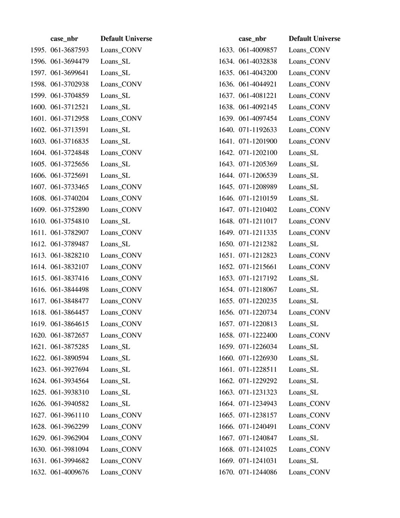 case_nbr Default Universe 1595. 061-3687593 Loans_CONV 1596. 061-3694479 Loans_SL 1597. 061-3699641 Loans_SL 1598. 061-3702938 Loans_CONV 1599. 061-3704859 Loans_SL 1600. 061-3712521 Loans_SL 1601. 061-3712958 Loans_CONV 1602. 061-3713591 Loans_SL 1603. 061-3716835 Loans_SL 1604. 061-3724848 Loans_CONV 1605. 061-3725656 Loans_SL 1606. 061-3725691 Loans_SL 1607. 061-3733465 Loans_CONV 1608. 061-3740204 Loans_CONV 1609. 061-3752890 Loans_CONV 1610. 061-3754810 Loans_SL 1611. 061-3782907 Loans_CONV 1612. 061-3789487 Loans_SL 1613. 061-3828210 Loans_CONV 1614. 061-3832107 Loans_CONV 1615. 061-3837416 Loans_CONV 1616. 061-3844498 Loans_CONV 1617. 061-3848477 Loans_CONV 1618. 061-3864457 Loans_CONV 1619. 061-3864615 Loans_CONV 1620. 061-3872657 Loans_CONV 1621. 061-3875285 Loans_SL 1622. 061-3890594 Loans_SL 1623. 061-3927694 Loans_SL 1624. 061-3934564 Loans_SL 1625. 061-3938310 Loans_SL 1626. 061-3940582 Loans_SL 1627. 061-3961110 Loans_CONV 1628. 061-3962299 Loans_CONV 1629. 061-3962904 Loans_CONV 1630. 061-3981094 Loans_CONV 1631. 061-3994682 Loans_CONV 1632. 061-4009676 Loans_CONV case_nbr Default Universe 1633. 061-4009857 Loans_CONV 1634. 061-4032838 Loans_CONV 1635. 061-4043200 Loans_CONV 1636. 061-4044921 Loans_CONV 1637. 061-4081221 Loans_CONV 1638. 061-4092145 Loans_CONV 1639. 061-4097454 Loans_CONV 1640. 071-1192633 Loans_CONV 1641. 071-1201900 Loans_CONV 1642. 071-1202100 Loans_SL 1643. 071-1205369 Loans_SL 1644. 071-1206539 Loans_SL 1645. 071-1208989 Loans_SL 1646. 071-1210159 Loans_SL 1647. 071-1210402 Loans_CONV 1648. 071-1211017 Loans_CONV 1649. 071-1211335 Loans_CONV 1650. 071-1212382 Loans_SL 1651. 071-1212823 Loans_CONV 1652. 071-1215661 Loans_CONV 1653. 071-1217192 Loans_SL 1654. 071-1218067 Loans_SL 1655. 071-1220235 Loans_SL 1656. 071-1220734 Loans_CONV 1657. 071-1220813 Loans_SL 1658. 071-1222400 Loans_CONV 1659. 071-1226034 Loans_SL 1660. 071-1226930 Loans_SL 1661. 071-1228511 Loans_SL 1662. 071-1229292 Loans_SL 1663. 071-1231323 Loans_SL 1664. 071-1234943 Loans_CONV 1665. 071-1238157 Loans_CONV 1666. 071-1240491 Loans_CONV 1667. 071-1240847 Loans_SL 1668. 071-1241025 Loans_CONV 1669. 071-1241031 Loans_SL 1670. 071-1244086 Loans_CONV
