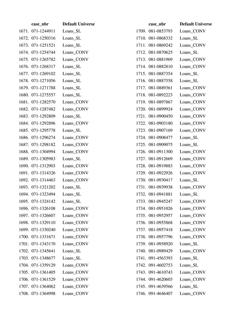 case_nbr Default Universe 1671. 071-1244911 Loans_SL 1672. 071-1250316 Loans_SL 1673. 071-1251521 Loans_SL 1674. 071-1254744 Loans_CONV 1675. 071-1265782 Loans_CONV 1676. 071-1268317 Loans_SL 1677. 071-1269102 Loans_SL 1678. 071-1271056 Loans_SL 1679. 071-1271788 Loans_SL 1680. 071-1275557 Loans_SL 1681. 071-1282570 Loans_CONV 1682. 071-1287482 Loans_CONV 1683. 071-1292809 Loans_SL 1684. 071-1292896 Loans_CONV 1685. 071-1295778 Loans_SL 1686. 071-1296274 Loans_CONV 1687. 071-1298182 Loans_CONV 1688. 071-1304994 Loans_CONV 1689. 071-1305983 Loans_SL 1690. 071-1312903 Loans_CONV 1691. 071-1314326 Loans_CONV 1692. 071-1314463 Loans_CONV 1693. 071-1321202 Loans_SL 1694. 071-1323494 Loans_SL 1695. 071-1324142 Loans_SL 1696. 071-1326108 Loans_CONV 1697. 071-1326607 Loans_CONV 1698. 071-1329110 Loans_CONV 1699. 071-1330240 Loans_CONV 1700. 071-1331671 Loans_CONV 1701. 071-1343170 Loans_CONV 1702. 071-1345641 Loans_SL 1703. 071-1348677 Loans_SL 1704. 071-1359129 Loans_CONV 1705. 071-1361405 Loans_CONV 1706. 071-1361529 Loans_CONV 1707. 071-1364062 Loans_CONV 1708. 071-1364998 Loans_CONV case_nbr Default Universe 1709. 081-0853793 Loans_CONV 1710. 081-0868332 Loans_SL 1711. 081-0869242 Loans_CONV 1712. 081-0870625 Loans_SL 1713. 081-0881969 Loans_CONV 1714. 081-0882810 Loans_CONV 1715. 081-0887354 Loans_SL 1716. 081-0887558 Loans_SL 1717. 081-0889361 Loans_CONV 1718. 081-0892223 Loans_CONV 1719. 081-0897867 Loans_CONV 1720. 081-0899924 Loans_CONV 1721. 081-0900450 Loans_CONV 1722. 081-0903180 Loans_CONV 1723. 081-0907169 Loans_CONV 1724. 081-0908477 Loans_SL 1725. 081-0909075 Loans_SL 1726. 081-0911300 Loans_CONV 1727. 081-0912669 Loans_CONV 1728. 081-0919883 Loans_CONV 1729. 081-0922926 Loans_CONV 1730. 081-0930417 Loans_SL 1731. 081-0939938 Loans_CONV 1732. 081-0941881 Loans_SL 1733. 081-0945247 Loans_CONV 1734. 081-0951026 Loans_CONV 1735. 081-0952957 Loans_CONV 1736. 081-0955868 Loans_CONV 1737. 081-0957418 Loans_CONV 1738. 081-0957796 Loans_CONV 1739. 081-0958920 Loans_SL 1740. 081-0989429 Loans_CONV 1741. 091-4563393 Loans_SL 1742. 091-4602753 Loans_SL 1743. 091-4610743 Loans_CONV 1744. 091-4620603 Loans_CONV 1745. 091-4639566 Loans_SL 1746. 091-4646407 Loans_CONV