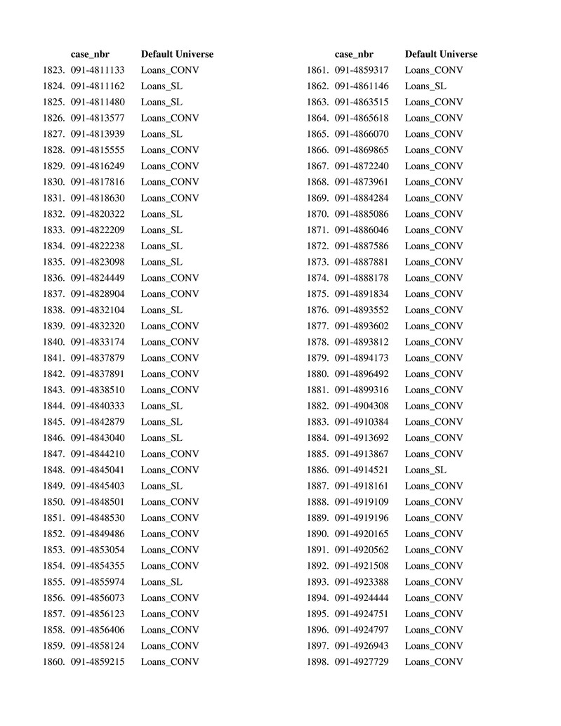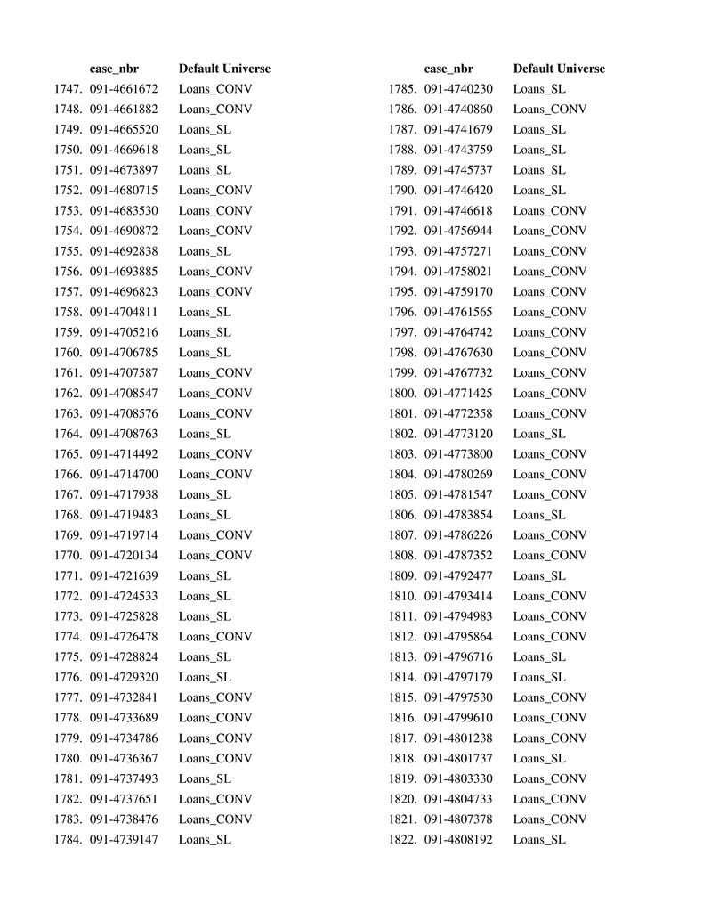case_nbr Default Universe 1747. 091-4661672 Loans_CONV 1748. 091-4661882 Loans_CONV 1749. 091-4665520 Loans_SL 1750. 091-4669618 Loans_SL 1751. 091-4673897 Loans_SL 1752. 091-4680715 Loans_CONV 1753. 091-4683530 Loans_CONV 1754. 091-4690872 Loans_CONV 1755. 091-4692838 Loans_SL 1756. 091-4693885 Loans_CONV 1757. 091-4696823 Loans_CONV 1758. 091-4704811 Loans_SL 1759. 091-4705216 Loans_SL 1760. 091-4706785 Loans_SL 1761. 091-4707587 Loans_CONV 1762. 091-4708547 Loans_CONV 1763. 091-4708576 Loans_CONV 1764. 091-4708763 Loans_SL 1765. 091-4714492 Loans_CONV 1766. 091-4714700 Loans_CONV 1767. 091-4717938 Loans_SL 1768. 091-4719483 Loans_SL 1769. 091-4719714 Loans_CONV 1770. 091-4720134 Loans_CONV 1771. 091-4721639 Loans_SL 1772. 091-4724533 Loans_SL 1773. 091-4725828 Loans_SL 1774. 091-4726478 Loans_CONV 1775. 091-4728824 Loans_SL 1776. 091-4729320 Loans_SL 1777. 091-4732841 Loans_CONV 1778. 091-4733689 Loans_CONV 1779. 091-4734786 Loans_CONV 1780. 091-4736367 Loans_CONV 1781. 091-4737493 Loans_SL 1782. 091-4737651 Loans_CONV 1783. 091-4738476 Loans_CONV 1784. 091-4739147 Loans_SL case_nbr Default Universe 1785. 091-4740230 Loans_SL 1786. 091-4740860 Loans_CONV 1787. 091-4741679 Loans_SL 1788. 091-4743759 Loans_SL 1789. 091-4745737 Loans_SL 1790. 091-4746420 Loans_SL 1791. 091-4746618 Loans_CONV 1792. 091-4756944 Loans_CONV 1793. 091-4757271 Loans_CONV 1794. 091-4758021 Loans_CONV 1795. 091-4759170 Loans_CONV 1796. 091-4761565 Loans_CONV 1797. 091-4764742 Loans_CONV 1798. 091-4767630 Loans_CONV 1799. 091-4767732 Loans_CONV 1800. 091-4771425 Loans_CONV 1801. 091-4772358 Loans_CONV 1802. 091-4773120 Loans_SL 1803. 091-4773800 Loans_CONV 1804. 091-4780269 Loans_CONV 1805. 091-4781547 Loans_CONV 1806. 091-4783854 Loans_SL 1807. 091-4786226 Loans_CONV 1808. 091-4787352 Loans_CONV 1809. 091-4792477 Loans_SL 1810. 091-4793414 Loans_CONV 1811. 091-4794983 Loans_CONV 1812. 091-4795864 Loans_CONV 1813. 091-4796716 Loans_SL 1814. 091-4797179 Loans_SL 1815. 091-4797530 Loans_CONV 1816. 091-4799610 Loans_CONV 1817. 091-4801238 Loans_CONV 1818. 091-4801737 Loans_SL 1819. 091-4803330 Loans_CONV 1820. 091-4804733 Loans_CONV 1821. 091-4807378 Loans_CONV 1822. 091-4808192 Loans_SL
