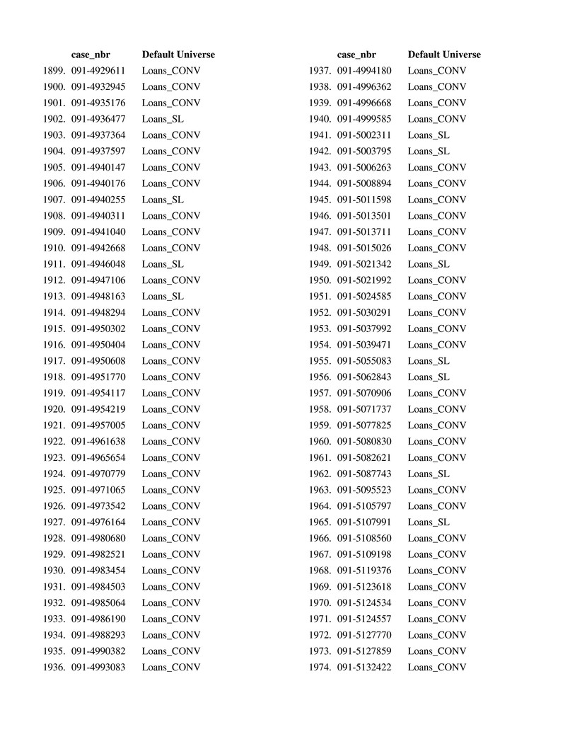 case_nbr Default Universe 1899. 091-4929611 Loans_CONV 1900. 091-4932945 Loans_CONV 1901. 091-4935176 Loans_CONV 1902. 091-4936477 Loans_SL 1903. 091-4937364 Loans_CONV 1904. 091-4937597 Loans_CONV 1905. 091-4940147 Loans_CONV 1906. 091-4940176 Loans_CONV 1907. 091-4940255 Loans_SL 1908. 091-4940311 Loans_CONV 1909. 091-4941040 Loans_CONV 1910. 091-4942668 Loans_CONV 1911. 091-4946048 Loans_SL 1912. 091-4947106 Loans_CONV 1913. 091-4948163 Loans_SL 1914. 091-4948294 Loans_CONV 1915. 091-4950302 Loans_CONV 1916. 091-4950404 Loans_CONV 1917. 091-4950608 Loans_CONV 1918. 091-4951770 Loans_CONV 1919. 091-4954117 Loans_CONV 1920. 091-4954219 Loans_CONV 1921. 091-4957005 Loans_CONV 1922. 091-4961638 Loans_CONV 1923. 091-4965654 Loans_CONV 1924. 091-4970779 Loans_CONV 1925. 091-4971065 Loans_CONV 1926. 091-4973542 Loans_CONV 1927. 091-4976164 Loans_CONV 1928. 091-4980680 Loans_CONV 1929. 091-4982521 Loans_CONV 1930. 091-4983454 Loans_CONV 1931. 091-4984503 Loans_CONV 1932. 091-4985064 Loans_CONV 1933. 091-4986190 Loans_CONV 1934. 091-4988293 Loans_CONV 1935. 091-4990382 Loans_CONV 1936. 091-4993083 Loans_CONV case_nbr Default Universe 1937. 091-4994180 Loans_CONV 1938. 091-4996362 Loans_CONV 1939. 091-4996668 Loans_CONV 1940. 091-4999585 Loans_CONV 1941. 091-5002311 Loans_SL 1942. 091-5003795 Loans_SL 1943. 091-5006263 Loans_CONV 1944. 091-5008894 Loans_CONV 1945. 091-5011598 Loans_CONV 1946. 091-5013501 Loans_CONV 1947. 091-5013711 Loans_CONV 1948. 091-5015026 Loans_CONV 1949. 091-5021342 Loans_SL 1950. 091-5021992 Loans_CONV 1951. 091-5024585 Loans_CONV 1952. 091-5030291 Loans_CONV 1953. 091-5037992 Loans_CONV 1954. 091-5039471 Loans_CONV 1955. 091-5055083 Loans_SL 1956. 091-5062843 Loans_SL 1957. 091-5070906 Loans_CONV 1958. 091-5071737 Loans_CONV 1959. 091-5077825 Loans_CONV 1960. 091-5080830 Loans_CONV 1961. 091-5082621 Loans_CONV 1962. 091-5087743 Loans_SL 1963. 091-5095523 Loans_CONV 1964. 091-5105797 Loans_CONV 1965. 091-5107991 Loans_SL 1966. 091-5108560 Loans_CONV 1967. 091-5109198 Loans_CONV 1968. 091-5119376 Loans_CONV 1969. 091-5123618 Loans_CONV 1970. 091-5124534 Loans_CONV 1971. 091-5124557 Loans_CONV 1972. 091-5127770 Loans_CONV 1973. 091-5127859 Loans_CONV 1974. 091-5132422 Loans_CONV