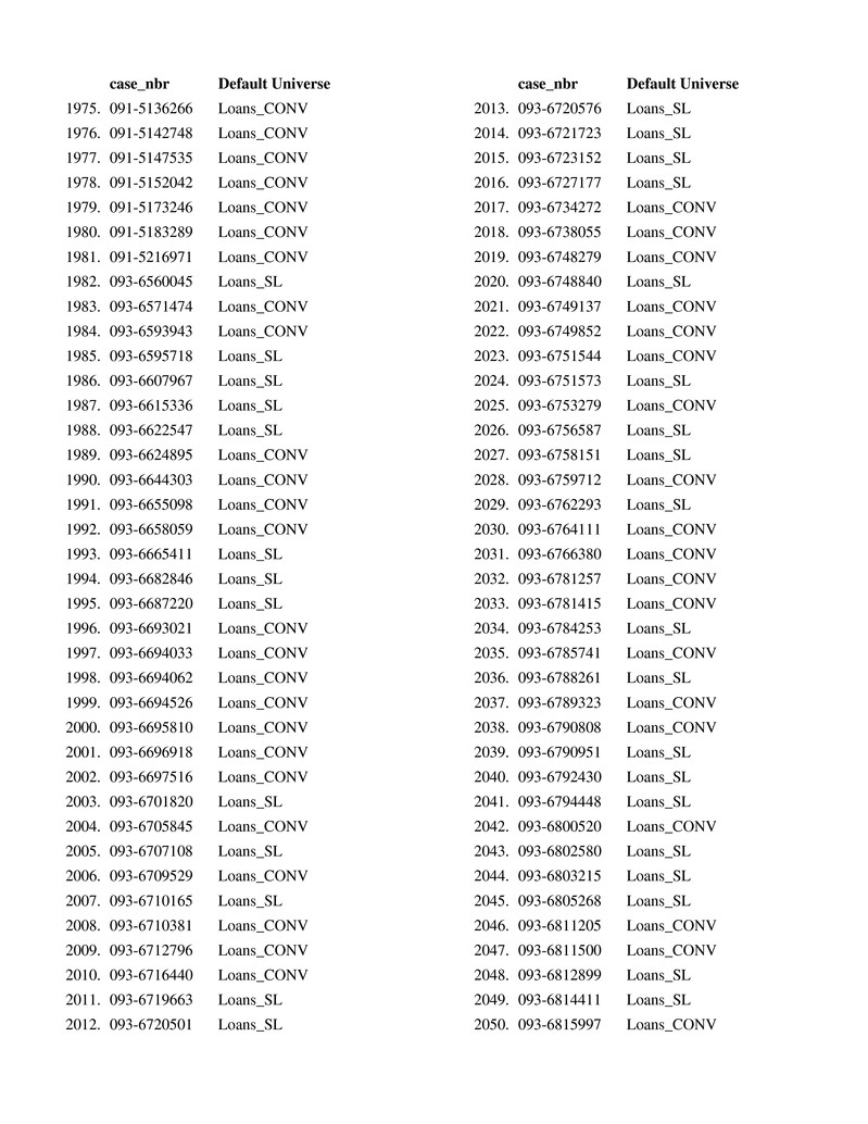 case_nbr Default Universe 1975. 091-5136266 Loans_CONV 1976. 091-5142748 Loans_CONV 1977. 091-5147535 Loans_CONV 1978. 091-5152042 Loans_CONV 1979. 091-5173246 Loans_CONV 1980. 091-5183289 Loans_CONV 1981. 091-5216971 Loans_CONV 1982. 093-6560045 Loans_SL 1983. 093-6571474 Loans_CONV 1984. 093-6593943 Loans_CONV 1985. 093-6595718 Loans_SL 1986. 093-6607967 Loans_SL 1987. 093-6615336 Loans_SL 1988. 093-6622547 Loans_SL 1989. 093-6624895 Loans_CONV 1990. 093-6644303 Loans_CONV 1991. 093-6655098 Loans_CONV 1992. 093-6658059 Loans_CONV 1993. 093-6665411 Loans_SL 1994. 093-6682846 Loans_SL 1995. 093-6687220 Loans_SL 1996. 093-6693021 Loans_CONV 1997. 093-6694033 Loans_CONV 1998. 093-6694062 Loans_CONV 1999. 093-6694526 Loans_CONV 2000. 093-6695810 Loans_CONV 2001. 093-6696918 Loans_CONV 2002. 093-6697516 Loans_CONV 2003. 093-6701820 Loans_SL 2004. 093-6705845 Loans_CONV 2005. 093-6707108 Loans_SL 2006. 093-6709529 Loans_CONV 2007. 093-6710165 Loans_SL 2008. 093-6710381 Loans_CONV 2009. 093-6712796 Loans_CONV 2010. 093-6716440 Loans_CONV 2011. 093-6719663 Loans_SL 2012. 093-6720501 Loans_SL case_nbr Default Universe 2013. 093-6720576 Loans_SL 2014. 093-6721723 Loans_SL 2015. 093-6723152 Loans_SL 2016. 093-6727177 Loans_SL 2017. 093-6734272 Loans_CONV 2018. 093-6738055 Loans_CONV 2019. 093-6748279 Loans_CONV 2020. 093-6748840 Loans_SL 2021. 093-6749137 Loans_CONV 2022. 093-6749852 Loans_CONV 2023. 093-6751544 Loans_CONV 2024. 093-6751573 Loans_SL 2025. 093-6753279 Loans_CONV 2026. 093-6756587 Loans_SL 2027. 093-6758151 Loans_SL 2028. 093-6759712 Loans_CONV 2029. 093-6762293 Loans_SL 2030. 093-6764111 Loans_CONV 2031. 093-6766380 Loans_CONV 2032. 093-6781257 Loans_CONV 2033. 093-6781415 Loans_CONV 2034. 093-6784253 Loans_SL 2035. 093-6785741 Loans_CONV 2036. 093-6788261 Loans_SL 2037. 093-6789323 Loans_CONV 2038. 093-6790808 Loans_CONV 2039. 093-6790951 Loans_SL 2040. 093-6792430 Loans_SL 2041. 093-6794448 Loans_SL 2042. 093-6800520 Loans_CONV 2043. 093-6802580 Loans_SL 2044. 093-6803215 Loans_SL 2045. 093-6805268 Loans_SL 2046. 093-6811205 Loans_CONV 2047. 093-6811500 Loans_CONV 2048. 093-6812899 Loans_SL 2049. 093-6814411 Loans_SL 2050. 093-6815997 Loans_CONV