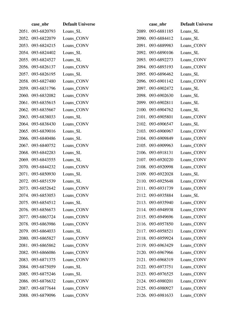 case_nbr Default Universe 2051. 093-6820793 Loans_SL 2052. 093-6822079 Loans_CONV 2053. 093-6824215 Loans_CONV 2054. 093-6824402 Loans_SL 2055. 093-6824527 Loans_SL 2056. 093-6826137 Loans_CONV 2057. 093-6826195 Loans_SL 2058. 093-6827480 Loans_CONV 2059. 093-6831796 Loans_CONV 2060. 093-6832082 Loans_CONV 2061. 093-6835615 Loans_CONV 2062. 093-6835667 Loans_CONV 2063. 093-6838033 Loans_SL 2064. 093-6838430 Loans_CONV 2065. 093-6839016 Loans_SL 2066. 093-6840486 Loans_SL 2067. 093-6840752 Loans_CONV 2068. 093-6842283 Loans_SL 2069. 093-6843555 Loans_SL 2070. 093-6844232 Loans_CONV 2071. 093-6850930 Loans_SL 2072. 093-6851539 Loans_SL 2073. 093-6852642 Loans_CONV 2074. 093-6853053 Loans_CONV 2075. 093-6854512 Loans_SL 2076. 093-6856673 Loans_CONV 2077. 093-6863724 Loans_CONV 2078. 093-6863986 Loans_CONV 2079. 093-6864033 Loans_SL 2080. 093-6865827 Loans_CONV 2081. 093-6865862 Loans_CONV 2082. 093-6866086 Loans_CONV 2083. 093-6871375 Loans_CONV 2084. 093-6875059 Loans_SL 2085. 093-6875246 Loans_SL 2086. 093-6876632 Loans_CONV 2087. 093-6877644 Loans_CONV 2088. 093-6879096 Loans_CONV case_nbr Default Universe 2089. 093-6881185 Loans_SL 2090. 093-6884412 Loans_SL 2091. 093-6889983 Loans_CONV 2092. 093-6890106 Loans_SL 2093. 093-6892273 Loans_CONV 2094. 093-6893193 Loans_CONV 2095. 093-6896462 Loans_SL 2096. 093-6901142 Loans_CONV 2097. 093-6902472 Loans_SL 2098. 093-6902630 Loans_SL 2099. 093-6902811 Loans_SL 2100. 093-6904762 Loans_SL 2101. 093-6905801 Loans_CONV 2102. 093-6906547 Loans_SL 2103. 093-6906967 Loans_CONV 2104. 093-6909849 Loans_CONV 2105. 093-6909963 Loans_CONV 2106. 093-6918131 Loans_CONV 2107. 093-6920220 Loans_CONV 2108. 093-6920998 Loans_CONV 2109. 093-6922028 Loans_SL 2110. 093-6925648 Loans_CONV 2111. 093-6931739 Loans_CONV 2112. 093-6935884 Loans_SL 2113. 093-6935940 Loans_CONV 2114. 093-6948938 Loans_CONV 2115. 093-6949696 Loans_CONV 2116. 093-6957850 Loans_CONV 2117. 093-6958521 Loans_CONV 2118. 093-6959924 Loans_CONV 2119. 093-6963429 Loans_CONV 2120. 093-6967966 Loans_CONV 2121. 093-6968319 Loans_CONV 2122. 093-6973751 Loans_CONV 2123. 093-6976525 Loans_CONV 2124. 093-6980201 Loans_CONV 2125. 093-6980927 Loans_CONV 2126. 093-6981633 Loans_CONV