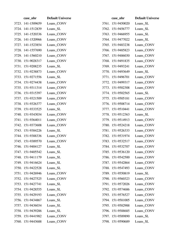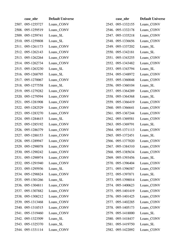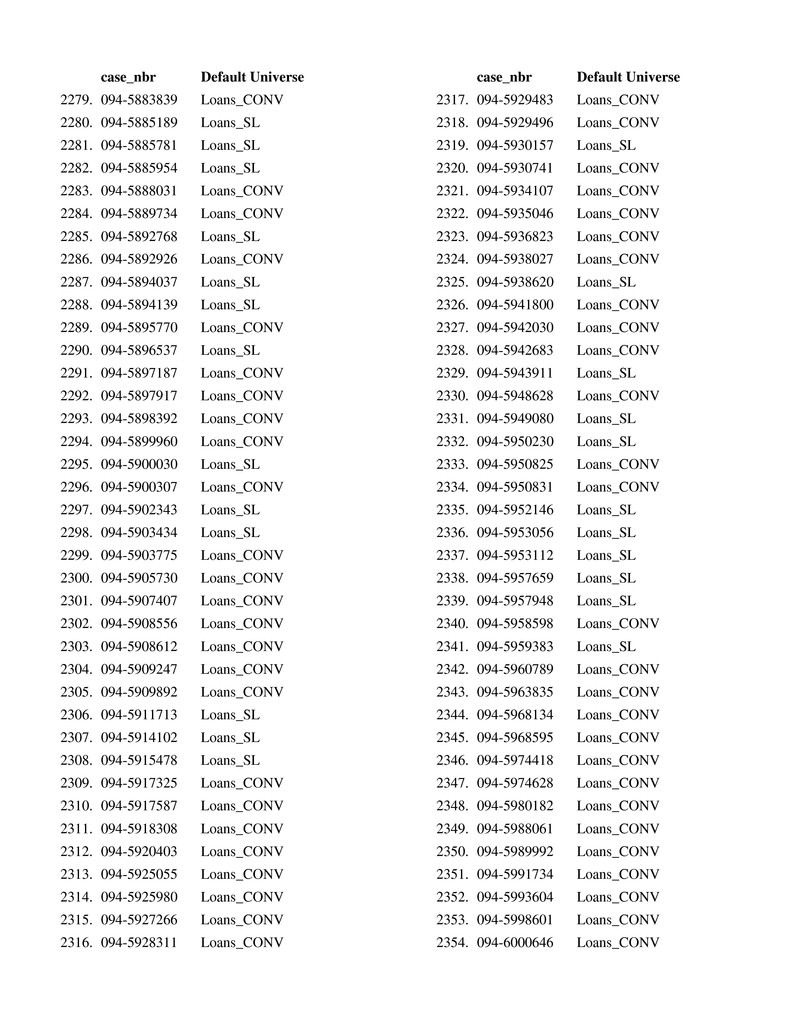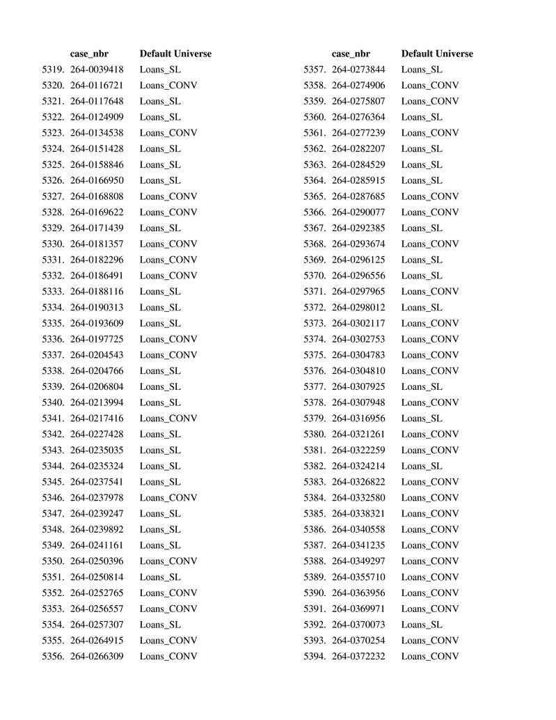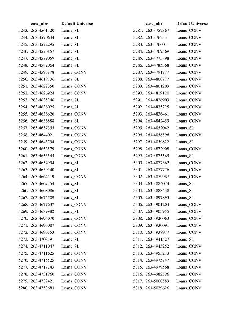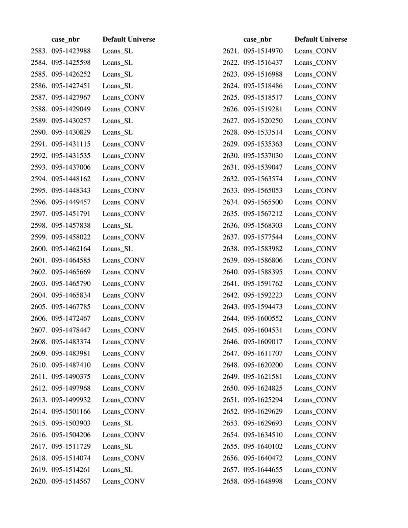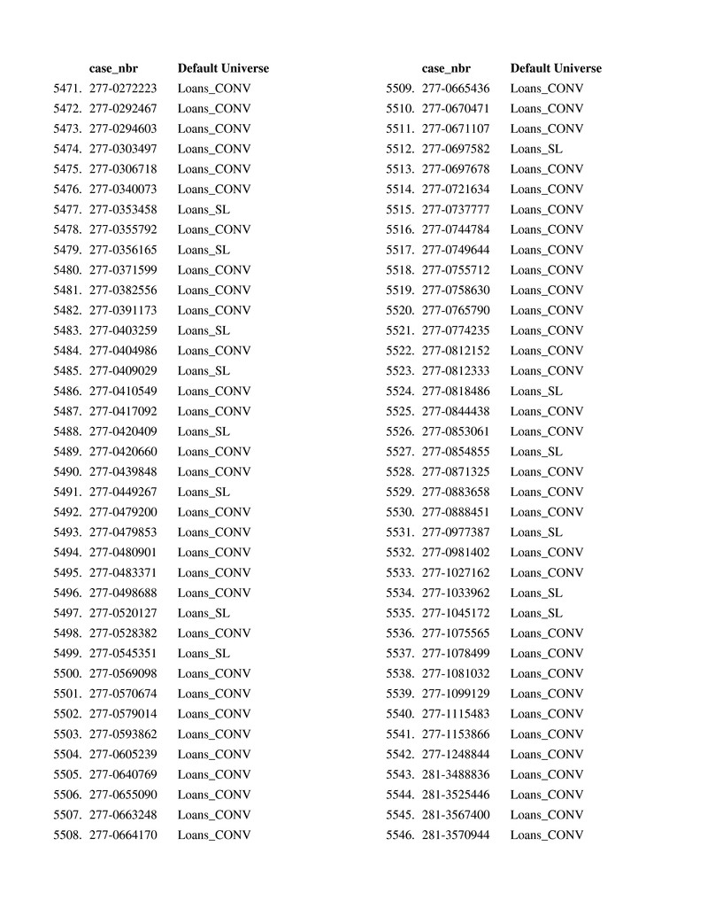 case_nbr Default Universe 227. 023-3491328 Loans_CONV 228. 023-3494680 Loans_SL 229. 023-3494738 Loans_SL 230. 023-3497759 Loans_CONV 231. 023-3498891 Loans_SL 232. 023-3501876 Loans_CONV 233. 023-3504793 Loans_CONV 234. 023-3510304 Loans_CONV 235. 023-3513460 Loans_CONV 236. 023-3523060 Loans_SL 237. 023-3528585 Loans_SL 238. 023-3531152 Loans_CONV 239. 023-3531554 Loans_SL 240. 023-3534751 Loans_SL 241. 023-3535102 Loans_SL 242. 023-3536399 Loans_SL 243. 023-3536721 Loans_SL 244. 023-3537030 Loans_SL 245. 023-3549176 Loans_CONV 246. 023-3555086 Loans_CONV 247. 023-3555510 Loans_CONV 248. 023-3557245 Loans_SL 249. 023-3558546 Loans_CONV 250. 023-3563957 Loans_SL 251. 023-3568992 Loans_CONV 252. 023-3570938 Loans_CONV 253. 023-3571174 Loans_CONV 254. 023-3573219 Loans_SL 255. 023-3576011 Loans_CONV 256. 023-3586019 Loans_CONV 257. 023-3586054 Loans_CONV 258. 023-3593481 Loans_CONV 259. 023-3601781 Loans_SL 260. 023-3610232 Loans_SL 261. 023-3612312 Loans_SL 262. 023-3613301 Loans_SL 263. 023-3615695 Loans_CONV 264. 023-3622405 Loans_CONV case_nbr Default Universe 265. 023-3624181 Loans_SL 266. 023-3628160 Loans_CONV 267. 023-3630923 Loans_CONV 268. 023-3636643 Loans_SL 269. 023-3640421 Loans_SL 270. 023-3643151 Loans_SL 271. 023-3645826 Loans_CONV 272. 023-3656099 Loans_CONV 273. 023-3657587 Loans_CONV 274. 023-3660274 Loans_SL 275. 023-3664014 Loans_CONV 276. 023-3664282 Loans_SL 277. 023-3665090 Loans_SL 278. 023-3668363 Loans_CONV 279. 023-3672867 Loans_CONV 280. 023-3674215 Loans_CONV 281. 023-3677602 Loans_CONV 282. 023-3685349 Loans_CONV 283. 023-3688850 Loans_CONV 284. 023-3689840 Loans_SL 285. 023-3690089 Loans_CONV 286. 023-3699666 Loans_CONV 287. 023-3699780 Loans_CONV 288. 023-3703022 Loans_CONV 289. 023-3704005 Loans_SL 290. 023-3707178 Loans_CONV 291. 023-3708926 Loans_CONV 292. 023-3710988 Loans_CONV 293. 023-3714986 Loans_SL 294. 023-3716128 Loans_CONV 295. 023-3722753 Loans_CONV 296. 023-3722928 Loans_CONV 297. 023-3729876 Loans_SL 298. 023-3730714 Loans_SL 299. 023-3731489 Loans_SL 300. 023-3732216 Loans_SL 301. 023-3732449 Loans_SL 302. 023-3732709 Loans_CONV