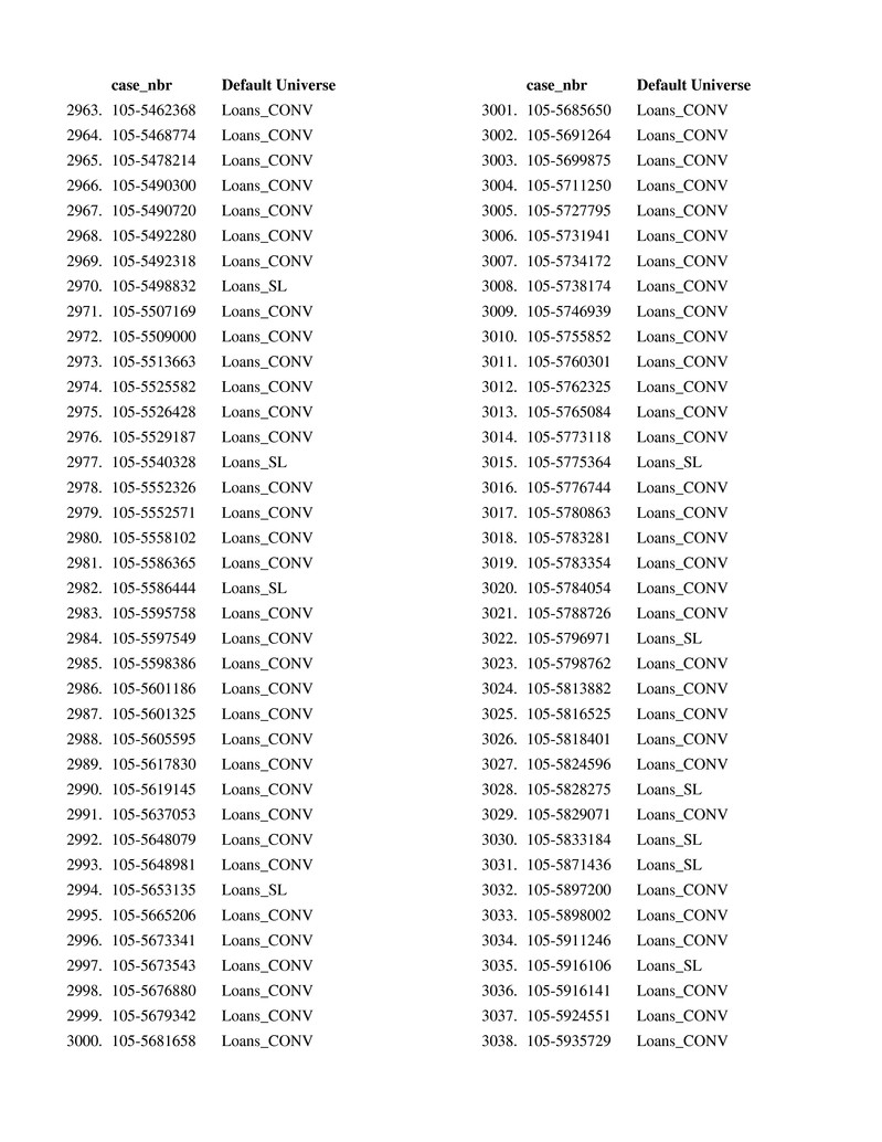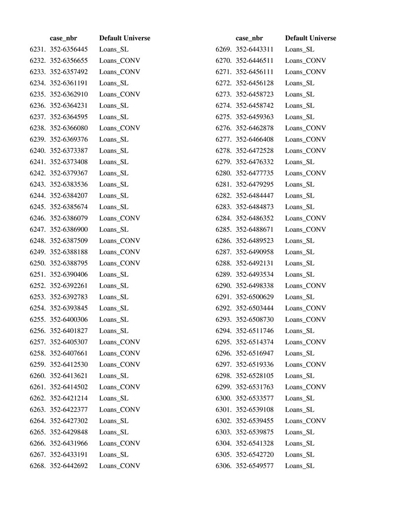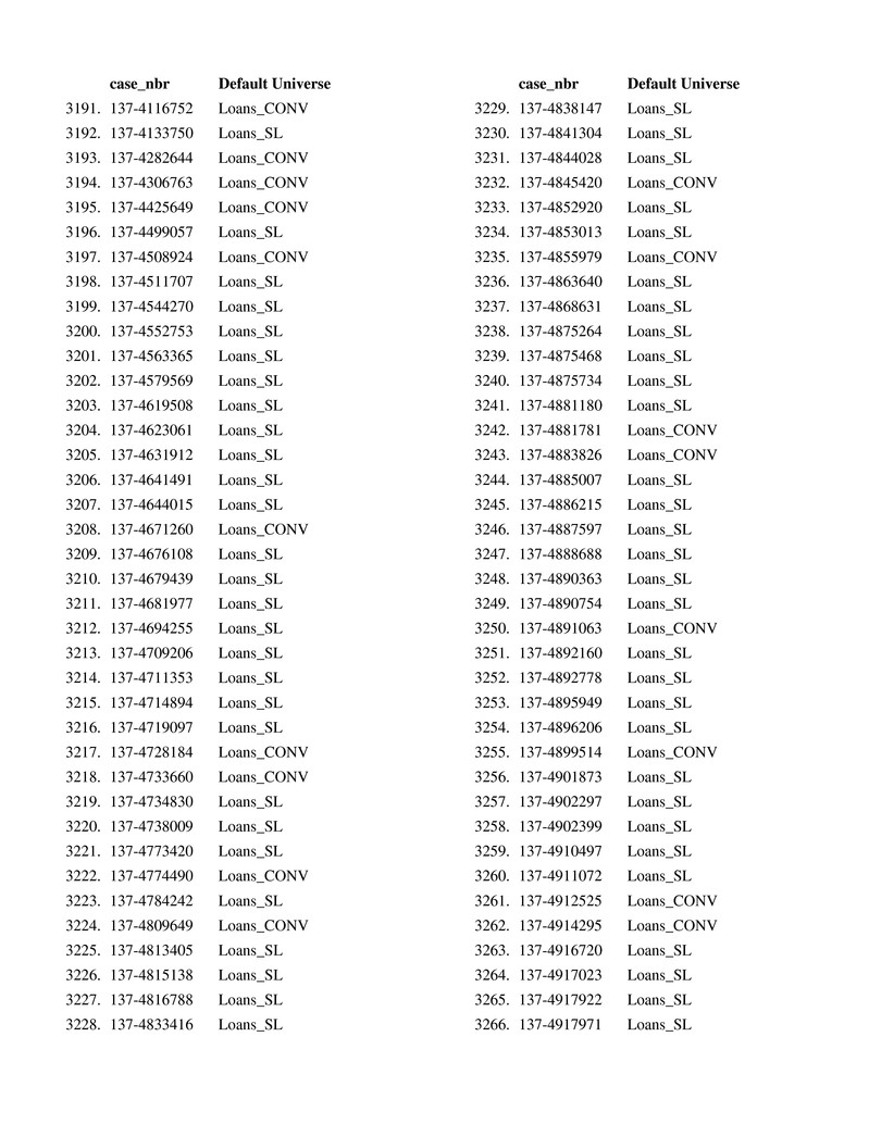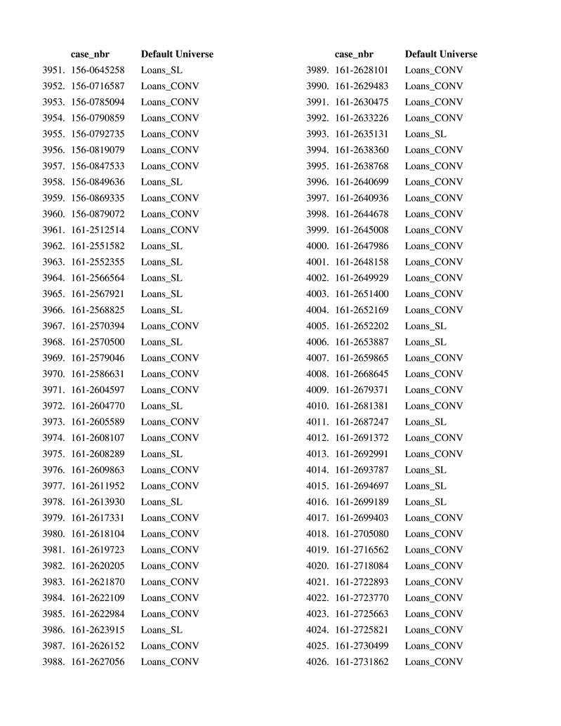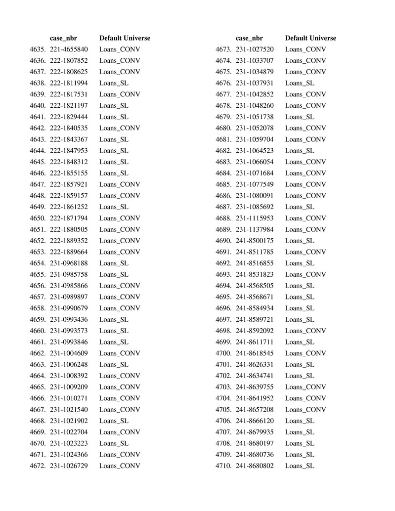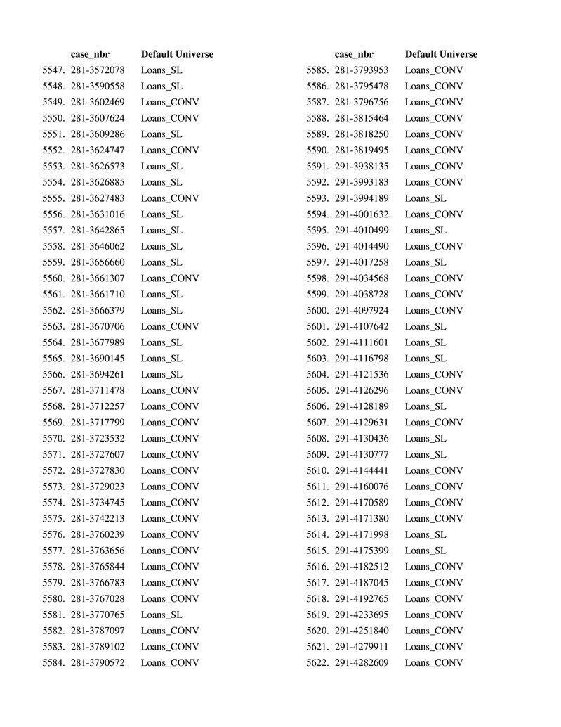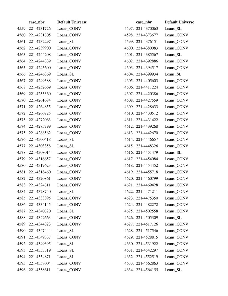 case_nbr Default Universe 227. 023-3491328 Loans_CONV 228. 023-3494680 Loans_SL 229. 023-3494738 Loans_SL 230. 023-3497759 Loans_CONV 231. 023-3498891 Loans_SL 232. 023-3501876 Loans_CONV 233. 023-3504793 Loans_CONV 234. 023-3510304 Loans_CONV 235. 023-3513460 Loans_CONV 236. 023-3523060 Loans_SL 237. 023-3528585 Loans_SL 238. 023-3531152 Loans_CONV 239. 023-3531554 Loans_SL 240. 023-3534751 Loans_SL 241. 023-3535102 Loans_SL 242. 023-3536399 Loans_SL 243. 023-3536721 Loans_SL 244. 023-3537030 Loans_SL 245. 023-3549176 Loans_CONV 246. 023-3555086 Loans_CONV 247. 023-3555510 Loans_CONV 248. 023-3557245 Loans_SL 249. 023-3558546 Loans_CONV 250. 023-3563957 Loans_SL 251. 023-3568992 Loans_CONV 252. 023-3570938 Loans_CONV 253. 023-3571174 Loans_CONV 254. 023-3573219 Loans_SL 255. 023-3576011 Loans_CONV 256. 023-3586019 Loans_CONV 257. 023-3586054 Loans_CONV 258. 023-3593481 Loans_CONV 259. 023-3601781 Loans_SL 260. 023-3610232 Loans_SL 261. 023-3612312 Loans_SL 262. 023-3613301 Loans_SL 263. 023-3615695 Loans_CONV 264. 023-3622405 Loans_CONV case_nbr Default Universe 265. 023-3624181 Loans_SL 266. 023-3628160 Loans_CONV 267. 023-3630923 Loans_CONV 268. 023-3636643 Loans_SL 269. 023-3640421 Loans_SL 270. 023-3643151 Loans_SL 271. 023-3645826 Loans_CONV 272. 023-3656099 Loans_CONV 273. 023-3657587 Loans_CONV 274. 023-3660274 Loans_SL 275. 023-3664014 Loans_CONV 276. 023-3664282 Loans_SL 277. 023-3665090 Loans_SL 278. 023-3668363 Loans_CONV 279. 023-3672867 Loans_CONV 280. 023-3674215 Loans_CONV 281. 023-3677602 Loans_CONV 282. 023-3685349 Loans_CONV 283. 023-3688850 Loans_CONV 284. 023-3689840 Loans_SL 285. 023-3690089 Loans_CONV 286. 023-3699666 Loans_CONV 287. 023-3699780 Loans_CONV 288. 023-3703022 Loans_CONV 289. 023-3704005 Loans_SL 290. 023-3707178 Loans_CONV 291. 023-3708926 Loans_CONV 292. 023-3710988 Loans_CONV 293. 023-3714986 Loans_SL 294. 023-3716128 Loans_CONV 295. 023-3722753 Loans_CONV 296. 023-3722928 Loans_CONV 297. 023-3729876 Loans_SL 298. 023-3730714 Loans_SL 299. 023-3731489 Loans_SL 300. 023-3732216 Loans_SL 301. 023-3732449 Loans_SL 302. 023-3732709 Loans_CONV