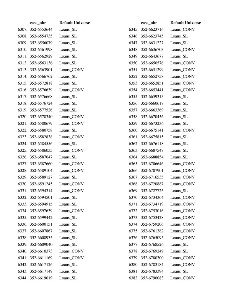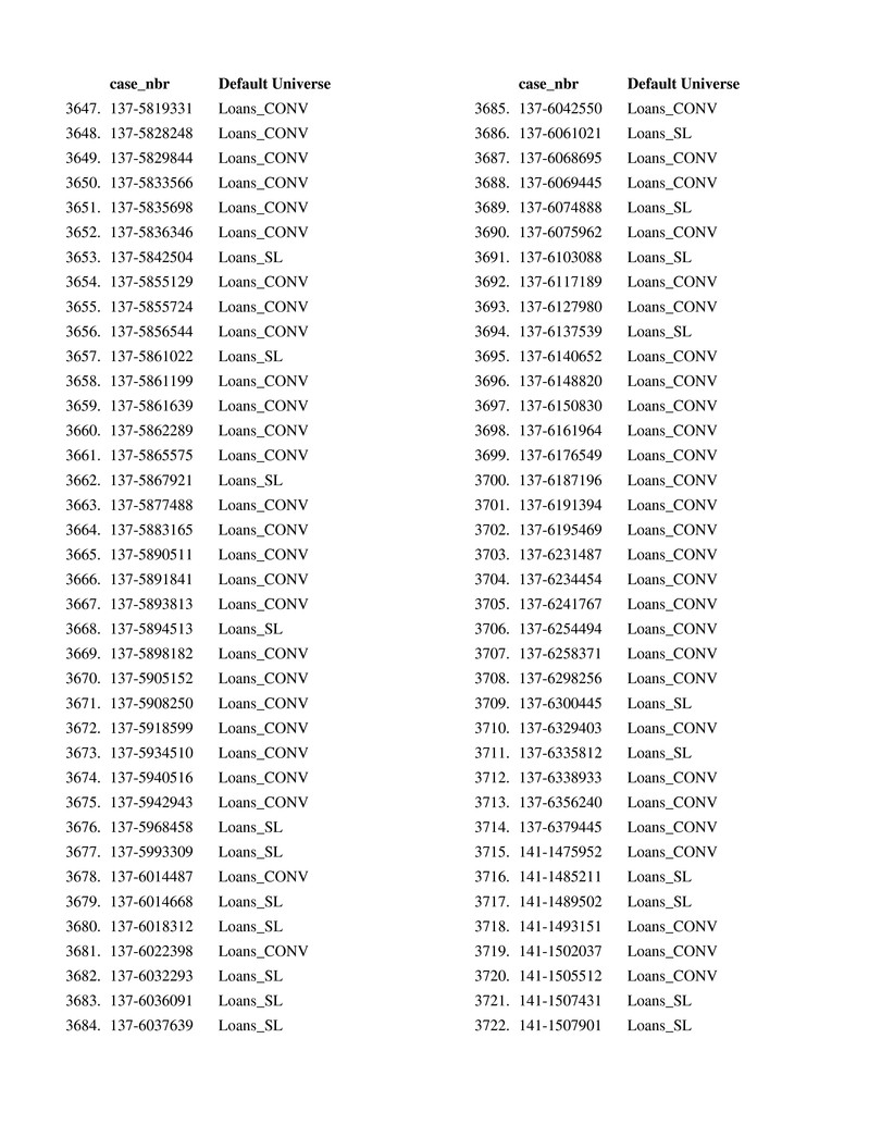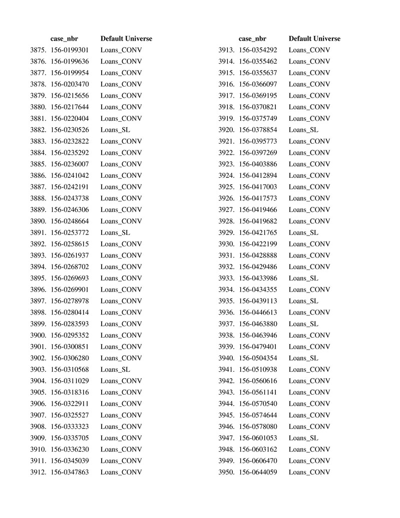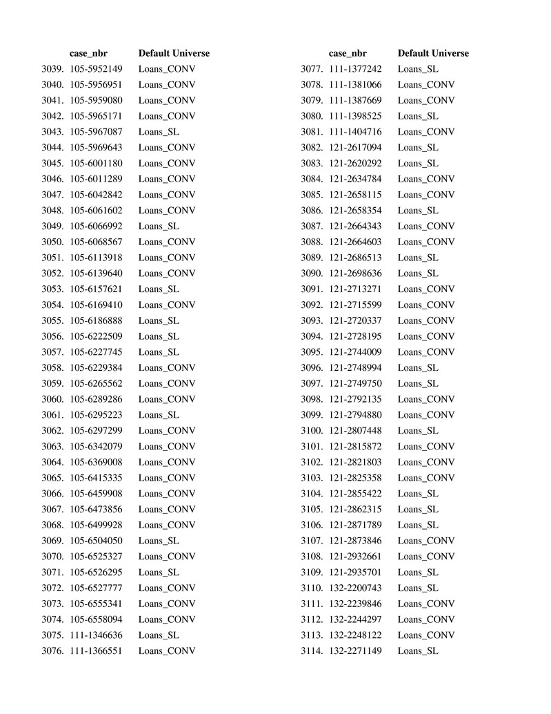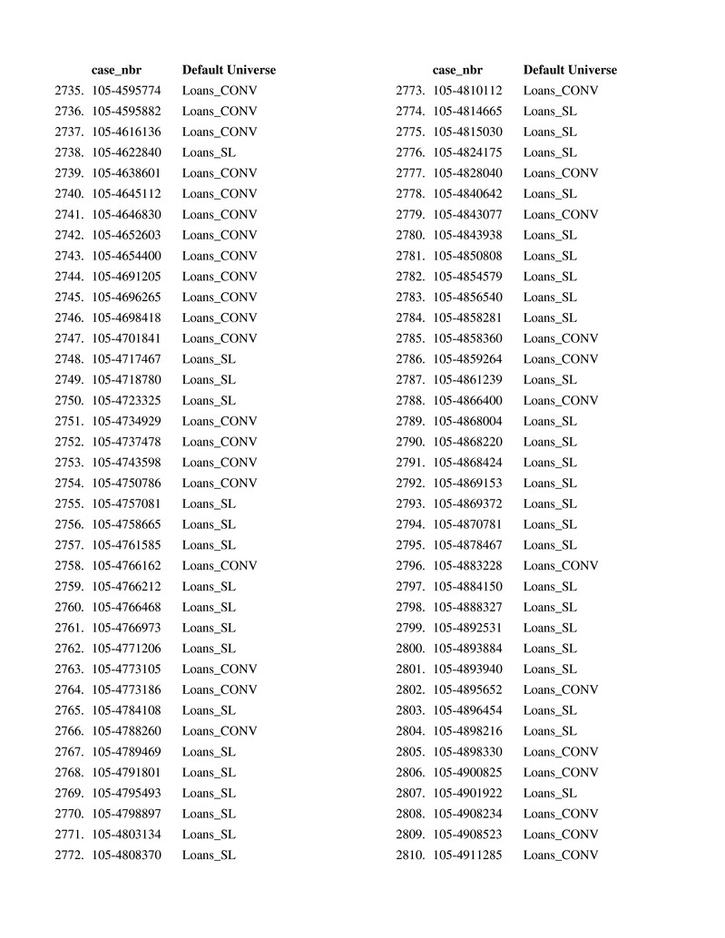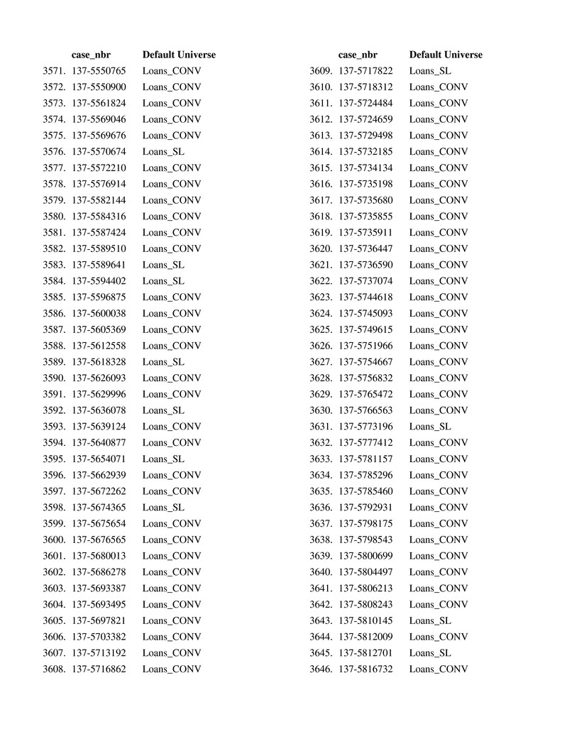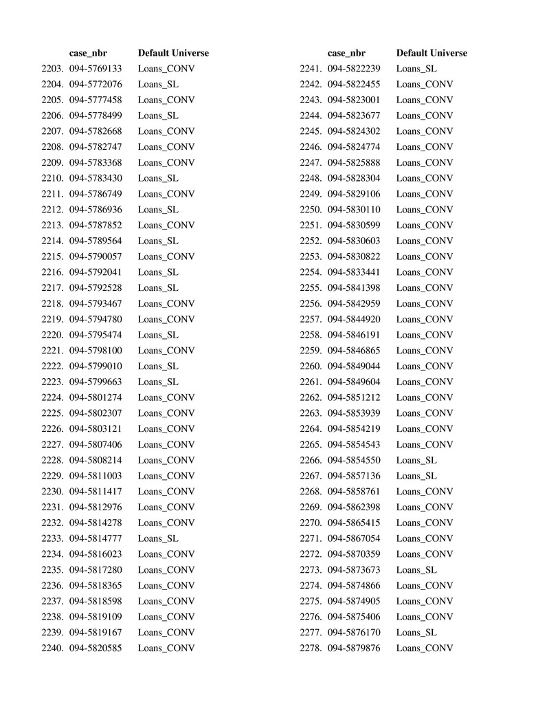 case_nbr Default Universe 227. 023-3491328 Loans_CONV 228. 023-3494680 Loans_SL 229. 023-3494738 Loans_SL 230. 023-3497759 Loans_CONV 231. 023-3498891 Loans_SL 232. 023-3501876 Loans_CONV 233. 023-3504793 Loans_CONV 234. 023-3510304 Loans_CONV 235. 023-3513460 Loans_CONV 236. 023-3523060 Loans_SL 237. 023-3528585 Loans_SL 238. 023-3531152 Loans_CONV 239. 023-3531554 Loans_SL 240. 023-3534751 Loans_SL 241. 023-3535102 Loans_SL 242. 023-3536399 Loans_SL 243. 023-3536721 Loans_SL 244. 023-3537030 Loans_SL 245. 023-3549176 Loans_CONV 246. 023-3555086 Loans_CONV 247. 023-3555510 Loans_CONV 248. 023-3557245 Loans_SL 249. 023-3558546 Loans_CONV 250. 023-3563957 Loans_SL 251. 023-3568992 Loans_CONV 252. 023-3570938 Loans_CONV 253. 023-3571174 Loans_CONV 254. 023-3573219 Loans_SL 255. 023-3576011 Loans_CONV 256. 023-3586019 Loans_CONV 257. 023-3586054 Loans_CONV 258. 023-3593481 Loans_CONV 259. 023-3601781 Loans_SL 260. 023-3610232 Loans_SL 261. 023-3612312 Loans_SL 262. 023-3613301 Loans_SL 263. 023-3615695 Loans_CONV 264. 023-3622405 Loans_CONV case_nbr Default Universe 265. 023-3624181 Loans_SL 266. 023-3628160 Loans_CONV 267. 023-3630923 Loans_CONV 268. 023-3636643 Loans_SL 269. 023-3640421 Loans_SL 270. 023-3643151 Loans_SL 271. 023-3645826 Loans_CONV 272. 023-3656099 Loans_CONV 273. 023-3657587 Loans_CONV 274. 023-3660274 Loans_SL 275. 023-3664014 Loans_CONV 276. 023-3664282 Loans_SL 277. 023-3665090 Loans_SL 278. 023-3668363 Loans_CONV 279. 023-3672867 Loans_CONV 280. 023-3674215 Loans_CONV 281. 023-3677602 Loans_CONV 282. 023-3685349 Loans_CONV 283. 023-3688850 Loans_CONV 284. 023-3689840 Loans_SL 285. 023-3690089 Loans_CONV 286. 023-3699666 Loans_CONV 287. 023-3699780 Loans_CONV 288. 023-3703022 Loans_CONV 289. 023-3704005 Loans_SL 290. 023-3707178 Loans_CONV 291. 023-3708926 Loans_CONV 292. 023-3710988 Loans_CONV 293. 023-3714986 Loans_SL 294. 023-3716128 Loans_CONV 295. 023-3722753 Loans_CONV 296. 023-3722928 Loans_CONV 297. 023-3729876 Loans_SL 298. 023-3730714 Loans_SL 299. 023-3731489 Loans_SL 300. 023-3732216 Loans_SL 301. 023-3732449 Loans_SL 302. 023-3732709 Loans_CONV