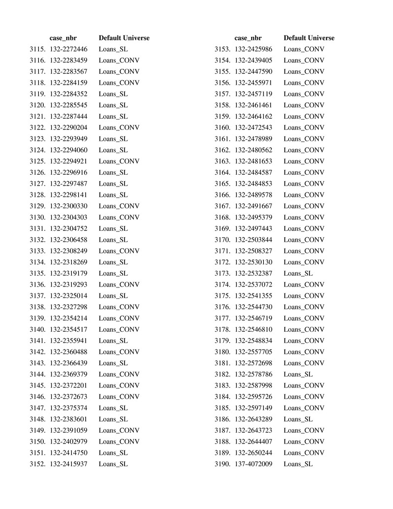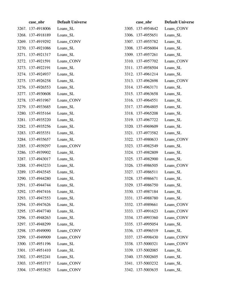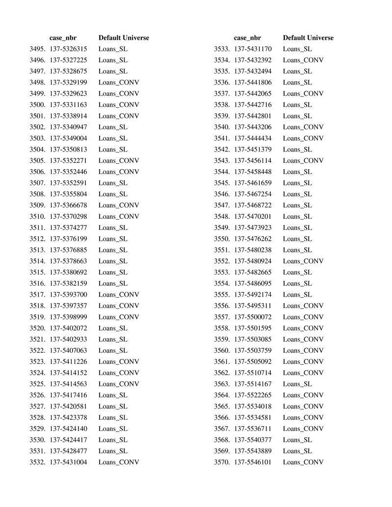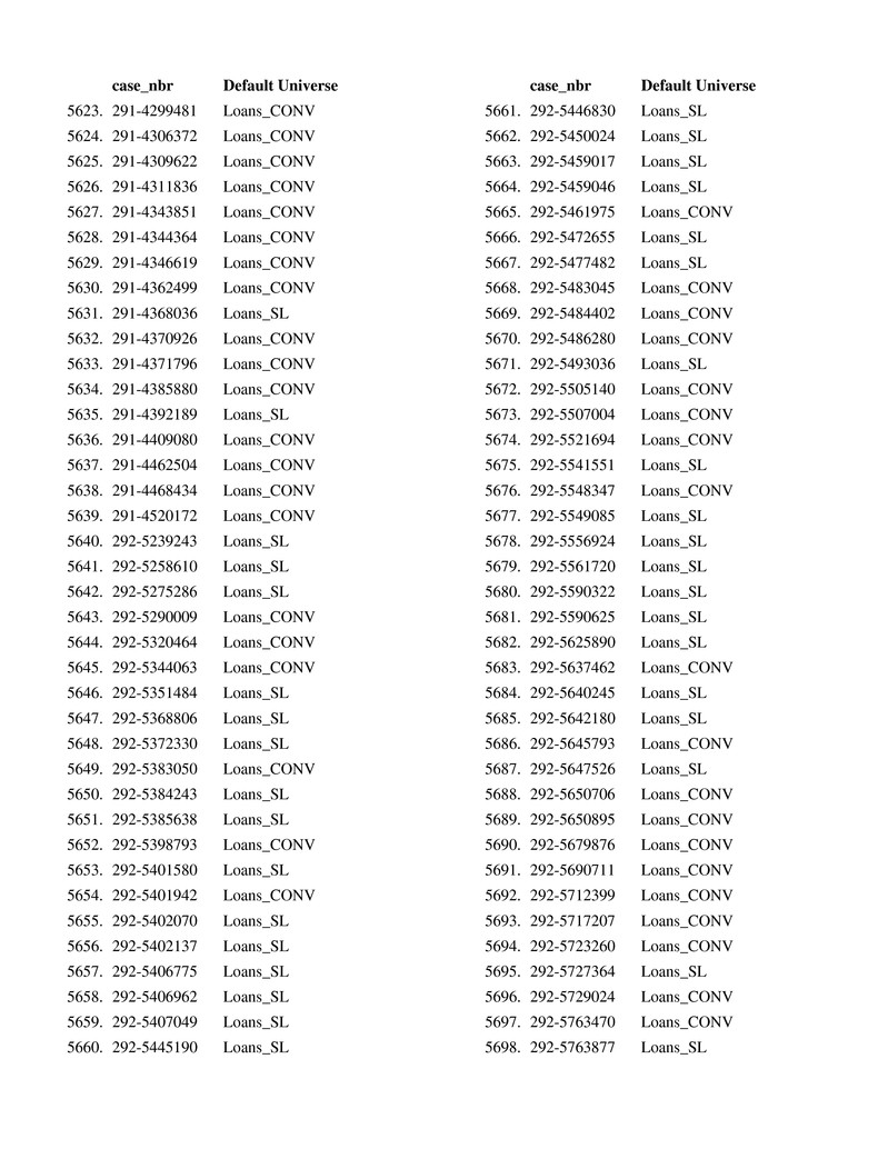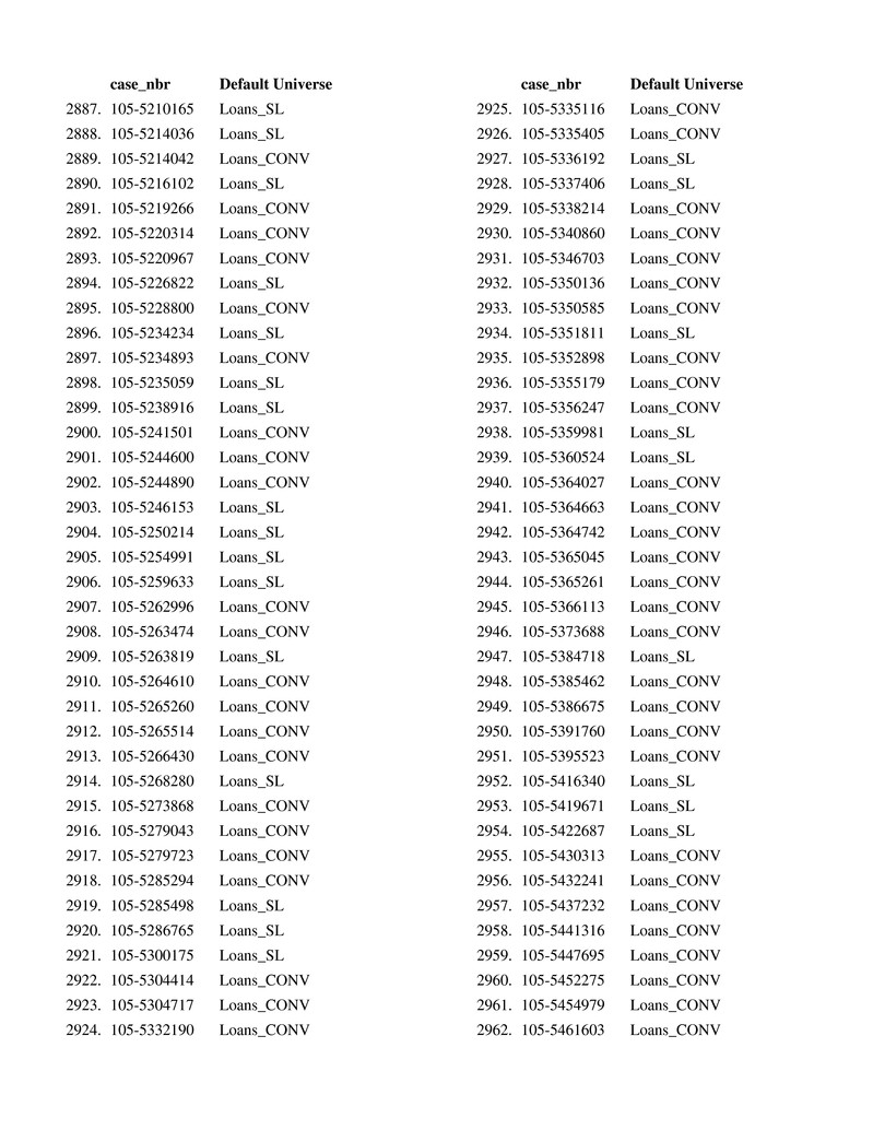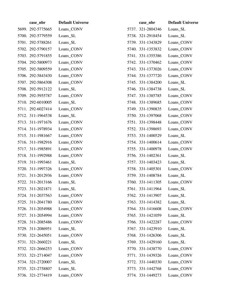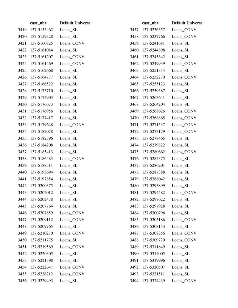 case_nbr Default Universe 227. 023-3491328 Loans_CONV 228. 023-3494680 Loans_SL 229. 023-3494738 Loans_SL 230. 023-3497759 Loans_CONV 231. 023-3498891 Loans_SL 232. 023-3501876 Loans_CONV 233. 023-3504793 Loans_CONV 234. 023-3510304 Loans_CONV 235. 023-3513460 Loans_CONV 236. 023-3523060 Loans_SL 237. 023-3528585 Loans_SL 238. 023-3531152 Loans_CONV 239. 023-3531554 Loans_SL 240. 023-3534751 Loans_SL 241. 023-3535102 Loans_SL 242. 023-3536399 Loans_SL 243. 023-3536721 Loans_SL 244. 023-3537030 Loans_SL 245. 023-3549176 Loans_CONV 246. 023-3555086 Loans_CONV 247. 023-3555510 Loans_CONV 248. 023-3557245 Loans_SL 249. 023-3558546 Loans_CONV 250. 023-3563957 Loans_SL 251. 023-3568992 Loans_CONV 252. 023-3570938 Loans_CONV 253. 023-3571174 Loans_CONV 254. 023-3573219 Loans_SL 255. 023-3576011 Loans_CONV 256. 023-3586019 Loans_CONV 257. 023-3586054 Loans_CONV 258. 023-3593481 Loans_CONV 259. 023-3601781 Loans_SL 260. 023-3610232 Loans_SL 261. 023-3612312 Loans_SL 262. 023-3613301 Loans_SL 263. 023-3615695 Loans_CONV 264. 023-3622405 Loans_CONV case_nbr Default Universe 265. 023-3624181 Loans_SL 266. 023-3628160 Loans_CONV 267. 023-3630923 Loans_CONV 268. 023-3636643 Loans_SL 269. 023-3640421 Loans_SL 270. 023-3643151 Loans_SL 271. 023-3645826 Loans_CONV 272. 023-3656099 Loans_CONV 273. 023-3657587 Loans_CONV 274. 023-3660274 Loans_SL 275. 023-3664014 Loans_CONV 276. 023-3664282 Loans_SL 277. 023-3665090 Loans_SL 278. 023-3668363 Loans_CONV 279. 023-3672867 Loans_CONV 280. 023-3674215 Loans_CONV 281. 023-3677602 Loans_CONV 282. 023-3685349 Loans_CONV 283. 023-3688850 Loans_CONV 284. 023-3689840 Loans_SL 285. 023-3690089 Loans_CONV 286. 023-3699666 Loans_CONV 287. 023-3699780 Loans_CONV 288. 023-3703022 Loans_CONV 289. 023-3704005 Loans_SL 290. 023-3707178 Loans_CONV 291. 023-3708926 Loans_CONV 292. 023-3710988 Loans_CONV 293. 023-3714986 Loans_SL 294. 023-3716128 Loans_CONV 295. 023-3722753 Loans_CONV 296. 023-3722928 Loans_CONV 297. 023-3729876 Loans_SL 298. 023-3730714 Loans_SL 299. 023-3731489 Loans_SL 300. 023-3732216 Loans_SL 301. 023-3732449 Loans_SL 302. 023-3732709 Loans_CONV