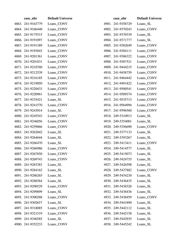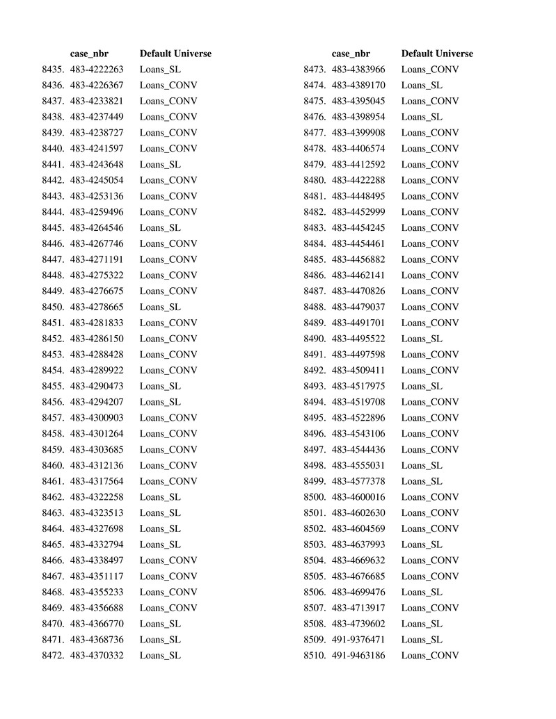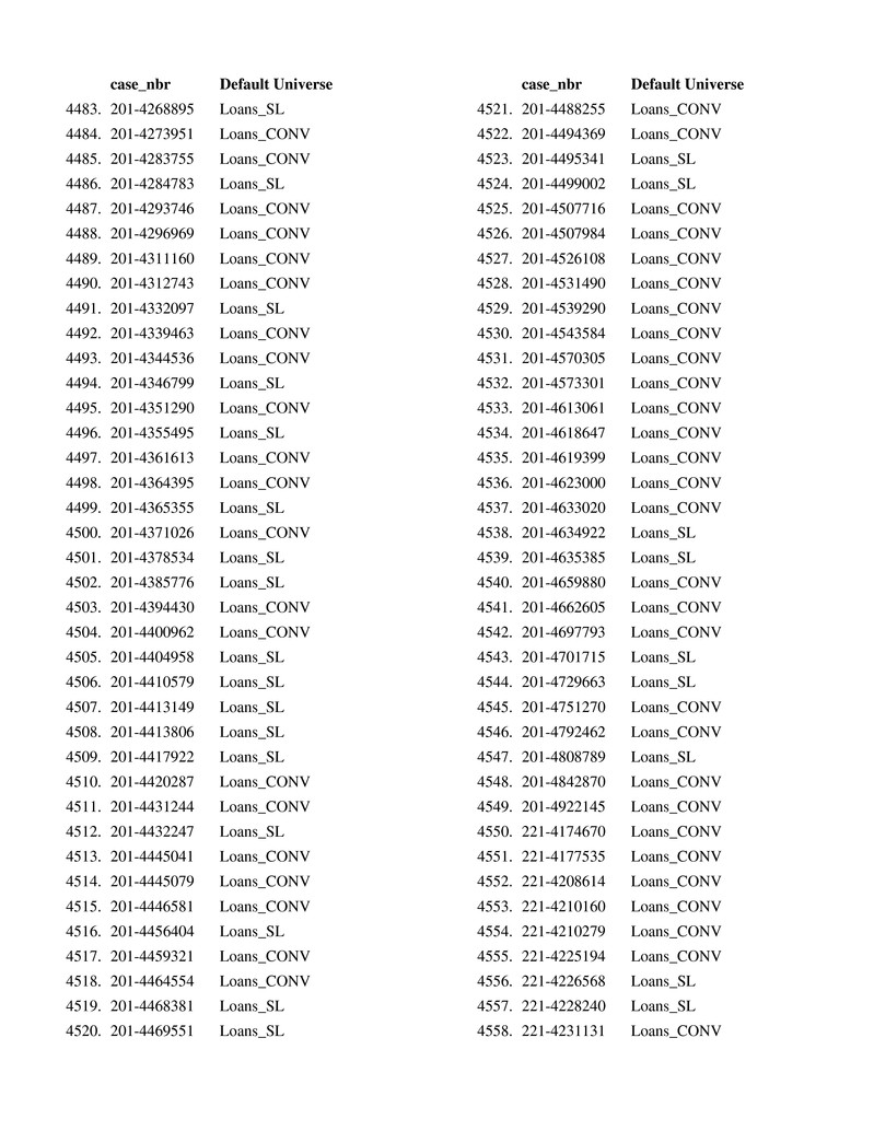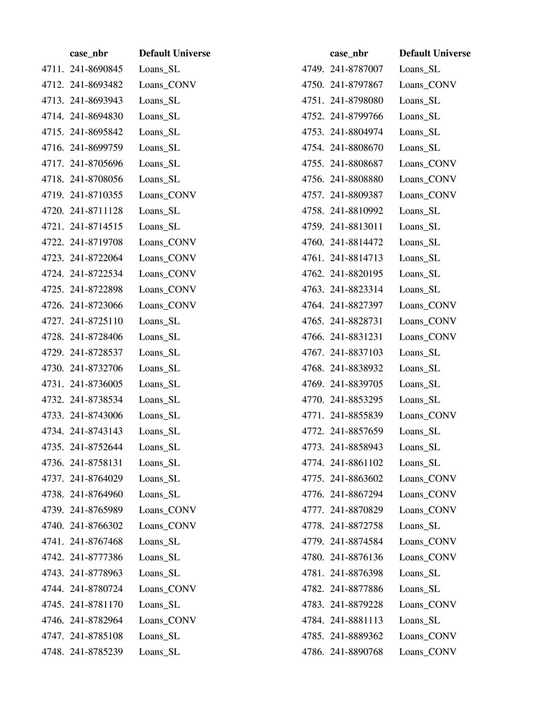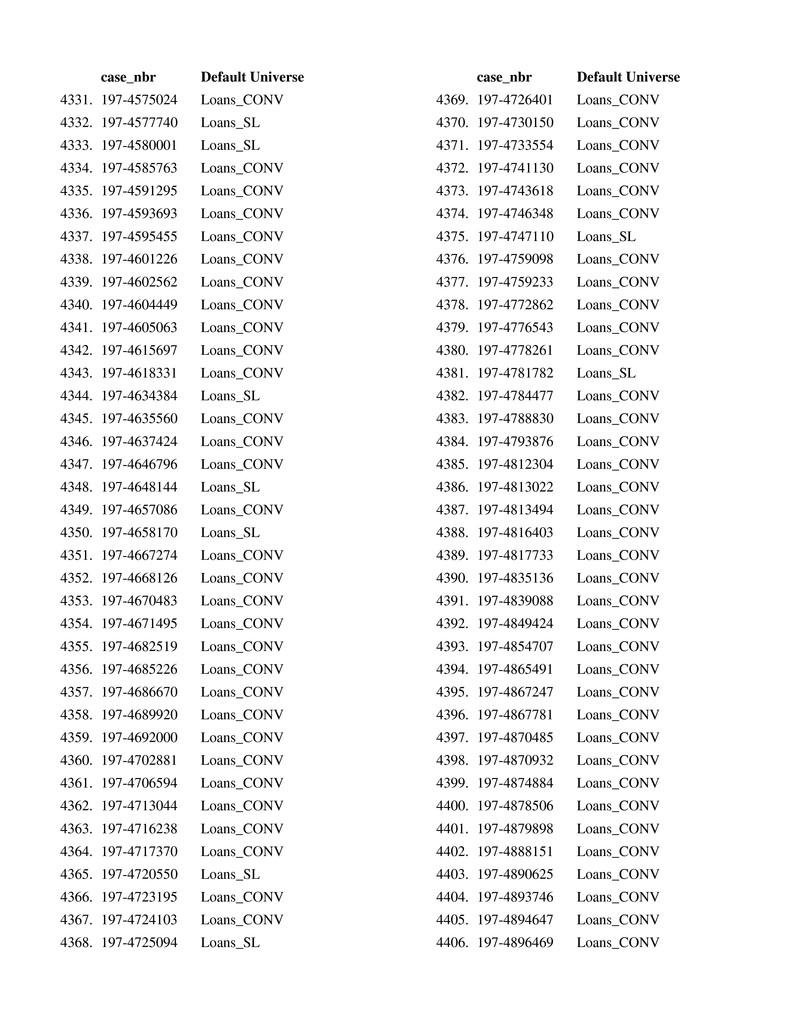 case_nbr Default Universe 8359. 481-3187310 Loans_CONV 8360. 481-3199071 Loans_CONV 8361. 481-3200481 Loans_SL 8362. 481-3213200 Loans_CONV 8363. 481-3219596 Loans_CONV 8364. 481-3235632 Loans_CONV 8365. 481-3325991 Loans_SL 8366. 481-3330796 Loans_CONV 8367. 482-3978445 Loans_CONV 8368. 482-4056533 Loans_SL 8369. 482-4061976 Loans_CONV 8370. 482-4062778 Loans_SL 8371. 482-4066497 Loans_SL 8372. 482-4069009 Loans_SL 8373. 482-4074435 Loans_CONV 8374. 482-4074861 Loans_SL 8375. 482-4078936 Loans_CONV 8376. 482-4090394 Loans_CONV 8377. 482-4093326 Loans_SL 8378. 482-4099732 Loans_SL 8379. 482-4103084 Loans_CONV 8380. 482-4111856 Loans_CONV 8381. 482-4117497 Loans_CONV 8382. 482-4121217 Loans_SL 8383. 482-4121535 Loans_SL 8384. 482-4121990 Loans_CONV 8385. 482-4123014 Loans_CONV 8386. 482-4123276 Loans_SL 8387. 482-4126503 Loans_SL 8388. 482-4139276 Loans_SL 8389. 482-4145610 Loans_CONV 8390. 482-4153702 Loans_CONV 8391. 482-4153856 Loans_CONV 8392. 482-4160988 Loans_CONV 8393. 482-4164987 Loans_CONV 8394. 482-4170486 Loans_SL 8395. 482-4171084 Loans_CONV 8396. 482-4179275 Loans_CONV case_nbr Default Universe 8397. 482-4179529 Loans_SL 8398. 482-4195891 Loans_CONV 8399. 482-4200673 Loans_SL 8400. 482-4202826 Loans_SL 8401. 482-4204885 Loans_CONV 8402. 482-4217315 Loans_CONV 8403. 482-4220842 Loans_CONV 8404. 482-4231556 Loans_CONV 8405. 482-4306047 Loans_CONV 8406. 483-4011094 Loans_CONV 8407. 483-4067931 Loans_SL 8408. 483-4071913 Loans_SL 8409. 483-4112344 Loans_SL 8410. 483-4127904 Loans_SL 8411. 483-4151919 Loans_CONV 8412. 483-4152293 Loans_SL 8413. 483-4154554 Loans_CONV 8414. 483-4155254 Loans_CONV 8415. 483-4155553 Loans_CONV 8416. 483-4160096 Loans_CONV 8417. 483-4163737 Loans_CONV 8418. 483-4164098 Loans_SL 8419. 483-4169440 Loans_SL 8420. 483-4172024 Loans_SL 8421. 483-4172383 Loans_SL 8422. 483-4175758 Loans_CONV 8423. 483-4179339 Loans_CONV 8424. 483-4179795 Loans_SL 8425. 483-4180026 Loans_SL 8426. 483-4180814 Loans_CONV 8427. 483-4185959 Loans_SL 8428. 483-4190017 Loans_CONV 8429. 483-4197639 Loans_CONV 8430. 483-4198401 Loans_SL 8431. 483-4202751 Loans_SL 8432. 483-4207141 Loans_SL 8433. 483-4215834 Loans_CONV 8434. 483-4222205 Loans_CONV