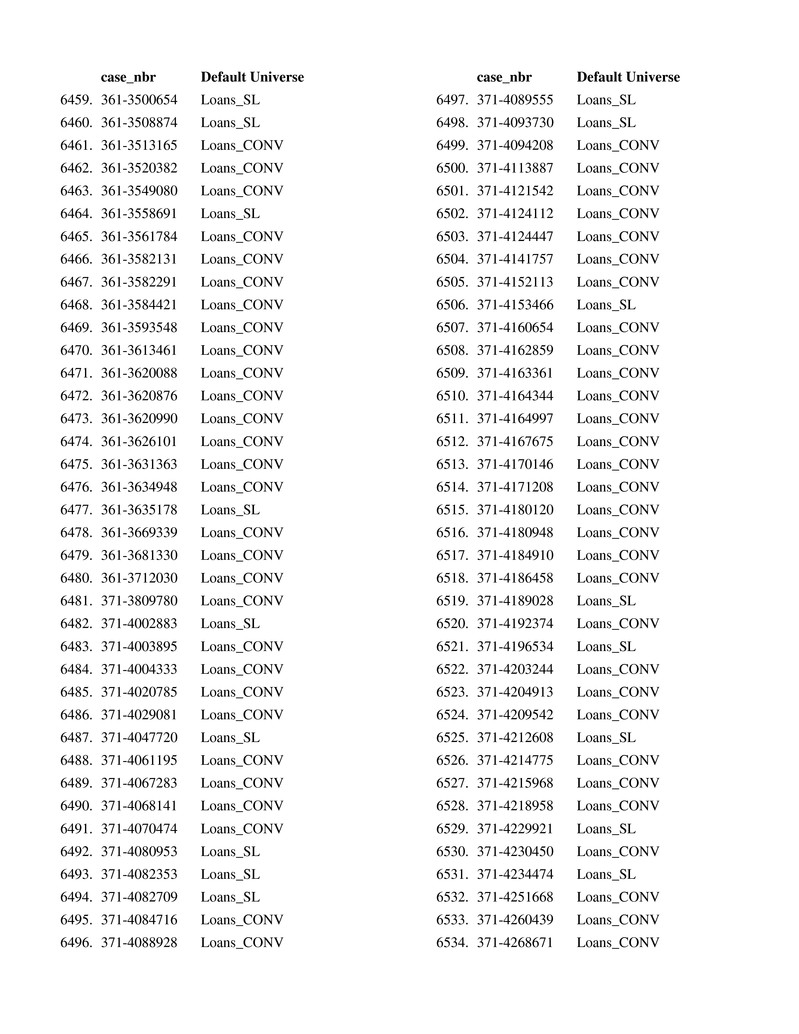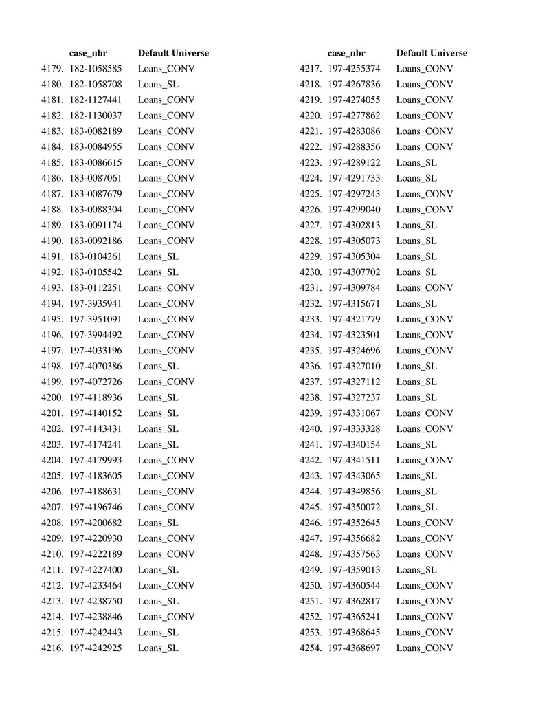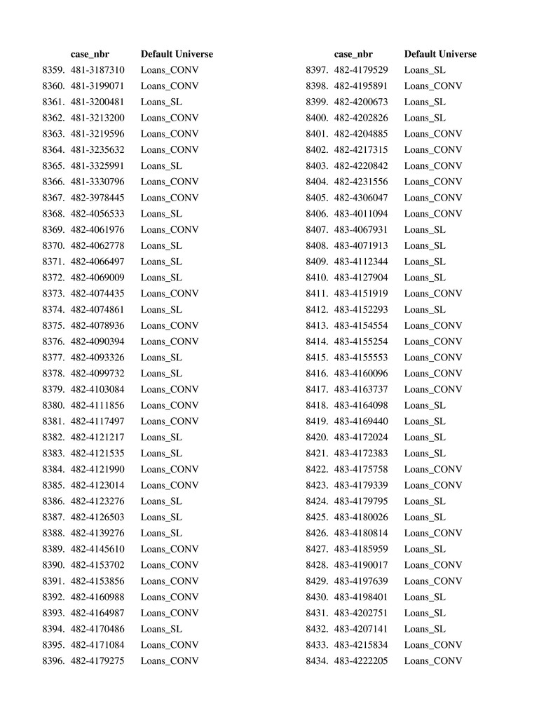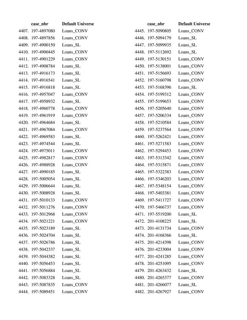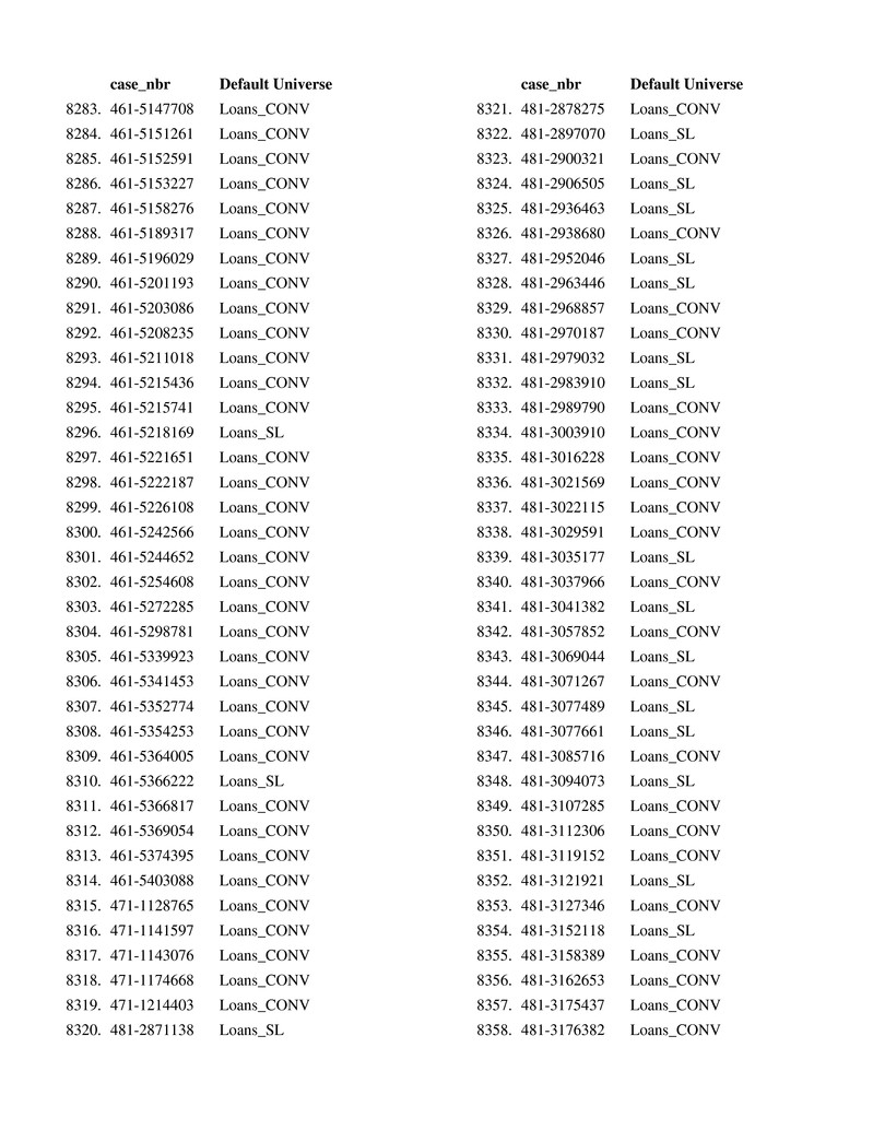 case_nbr Default Universe 8359. 481-3187310 Loans_CONV 8360. 481-3199071 Loans_CONV 8361. 481-3200481 Loans_SL 8362. 481-3213200 Loans_CONV 8363. 481-3219596 Loans_CONV 8364. 481-3235632 Loans_CONV 8365. 481-3325991 Loans_SL 8366. 481-3330796 Loans_CONV 8367. 482-3978445 Loans_CONV 8368. 482-4056533 Loans_SL 8369. 482-4061976 Loans_CONV 8370. 482-4062778 Loans_SL 8371. 482-4066497 Loans_SL 8372. 482-4069009 Loans_SL 8373. 482-4074435 Loans_CONV 8374. 482-4074861 Loans_SL 8375. 482-4078936 Loans_CONV 8376. 482-4090394 Loans_CONV 8377. 482-4093326 Loans_SL 8378. 482-4099732 Loans_SL 8379. 482-4103084 Loans_CONV 8380. 482-4111856 Loans_CONV 8381. 482-4117497 Loans_CONV 8382. 482-4121217 Loans_SL 8383. 482-4121535 Loans_SL 8384. 482-4121990 Loans_CONV 8385. 482-4123014 Loans_CONV 8386. 482-4123276 Loans_SL 8387. 482-4126503 Loans_SL 8388. 482-4139276 Loans_SL 8389. 482-4145610 Loans_CONV 8390. 482-4153702 Loans_CONV 8391. 482-4153856 Loans_CONV 8392. 482-4160988 Loans_CONV 8393. 482-4164987 Loans_CONV 8394. 482-4170486 Loans_SL 8395. 482-4171084 Loans_CONV 8396. 482-4179275 Loans_CONV case_nbr Default Universe 8397. 482-4179529 Loans_SL 8398. 482-4195891 Loans_CONV 8399. 482-4200673 Loans_SL 8400. 482-4202826 Loans_SL 8401. 482-4204885 Loans_CONV 8402. 482-4217315 Loans_CONV 8403. 482-4220842 Loans_CONV 8404. 482-4231556 Loans_CONV 8405. 482-4306047 Loans_CONV 8406. 483-4011094 Loans_CONV 8407. 483-4067931 Loans_SL 8408. 483-4071913 Loans_SL 8409. 483-4112344 Loans_SL 8410. 483-4127904 Loans_SL 8411. 483-4151919 Loans_CONV 8412. 483-4152293 Loans_SL 8413. 483-4154554 Loans_CONV 8414. 483-4155254 Loans_CONV 8415. 483-4155553 Loans_CONV 8416. 483-4160096 Loans_CONV 8417. 483-4163737 Loans_CONV 8418. 483-4164098 Loans_SL 8419. 483-4169440 Loans_SL 8420. 483-4172024 Loans_SL 8421. 483-4172383 Loans_SL 8422. 483-4175758 Loans_CONV 8423. 483-4179339 Loans_CONV 8424. 483-4179795 Loans_SL 8425. 483-4180026 Loans_SL 8426. 483-4180814 Loans_CONV 8427. 483-4185959 Loans_SL 8428. 483-4190017 Loans_CONV 8429. 483-4197639 Loans_CONV 8430. 483-4198401 Loans_SL 8431. 483-4202751 Loans_SL 8432. 483-4207141 Loans_SL 8433. 483-4215834 Loans_CONV 8434. 483-4222205 Loans_CONV