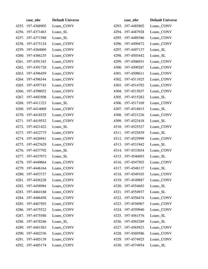 case_nbr Default Universe 7219. 387-0620896 Loans_CONV 7220. 387-0625190 Loans_CONV 7221. 387-0627395 Loans_CONV 7222. 387-0645783 Loans_CONV 7223. 387-0650505 Loans_CONV 7224. 387-0655163 Loans_CONV 7225. 387-0725110 Loans_CONV 7226. 387-0766427 Loans_CONV 7227. 387-0767270 Loans_CONV 7228. 387-0775310 Loans_CONV 7229. 387-0794860 Loans_CONV 7230. 387-0822716 Loans_CONV 7231. 387-0833885 Loans_CONV 7232. 387-0843961 Loans_CONV 7233. 387-0875124 Loans_CONV 7234. 387-0883330 Loans_CONV 7235. 387-0919067 Loans_CONV 7236. 387-0928154 Loans_SL 7237. 387-0955403 Loans_CONV 7238. 387-1021719 Loans_CONV 7239. 411-4297311 Loans_CONV 7240. 411-4390456 Loans_SL 7241. 411-4416251 Loans_SL 7242. 411-4419206 Loans_CONV 7243. 411-4423071 Loans_CONV 7244. 411-4424258 Loans_SL 7245. 411-4432543 Loans_CONV 7246. 411-4434045 Loans_SL 7247. 411-4441892 Loans_SL 7248. 411-4442274 Loans_SL 7249. 411-4449048 Loans_SL 7250. 411-4450909 Loans_CONV 7251. 411-4451615 Loans_CONV 7252. 411-4451802 Loans_SL 7253. 411-4453435 Loans_CONV 7254. 411-4457358 Loans_CONV 7255. 411-4458251 Loans_SL 7256. 411-4458280 Loans_SL case_nbr Default Universe 7257. 411-4468481 Loans_SL 7258. 411-4469680 Loans_CONV 7259. 411-4474277 Loans_CONV 7260. 411-4477839 Loans_CONV 7261. 411-4479767 Loans_CONV 7262. 411-4482629 Loans_SL 7263. 411-4486410 Loans_CONV 7264. 411-4488781 Loans_CONV 7265. 411-4488860 Loans_CONV 7266. 411-4489642 Loans_SL 7267. 411-4496062 Loans_SL 7268. 411-4496771 Loans_CONV 7269. 411-4497617 Loans_CONV 7270. 411-4497652 Loans_CONV 7271. 411-4498317 Loans_CONV 7272. 411-4499069 Loans_CONV 7273. 411-4509058 Loans_CONV 7274. 411-4513892 Loans_CONV 7275. 411-4515552 Loans_CONV 7276. 411-4520569 Loans_CONV 7277. 411-4524367 Loans_CONV 7278. 411-4528425 Loans_SL 7279. 411-4532255 Loans_SL 7280. 411-4533670 Loans_SL 7281. 411-4541307 Loans_CONV 7282. 411-4543859 Loans_SL 7283. 411-4544440 Loans_CONV 7284. 411-4544877 Loans_CONV 7285. 411-4550820 Loans_SL 7286. 411-4554953 Loans_SL 7287. 411-4555597 Loans_SL 7288. 411-4558722 Loans_SL 7289. 411-4561245 Loans_SL 7290. 411-4562394 Loans_SL 7291. 411-4562473 Loans_CONV 7292. 411-4566922 Loans_CONV 7293. 411-4572493 Loans_CONV 7294. 411-4573447 Loans_SL