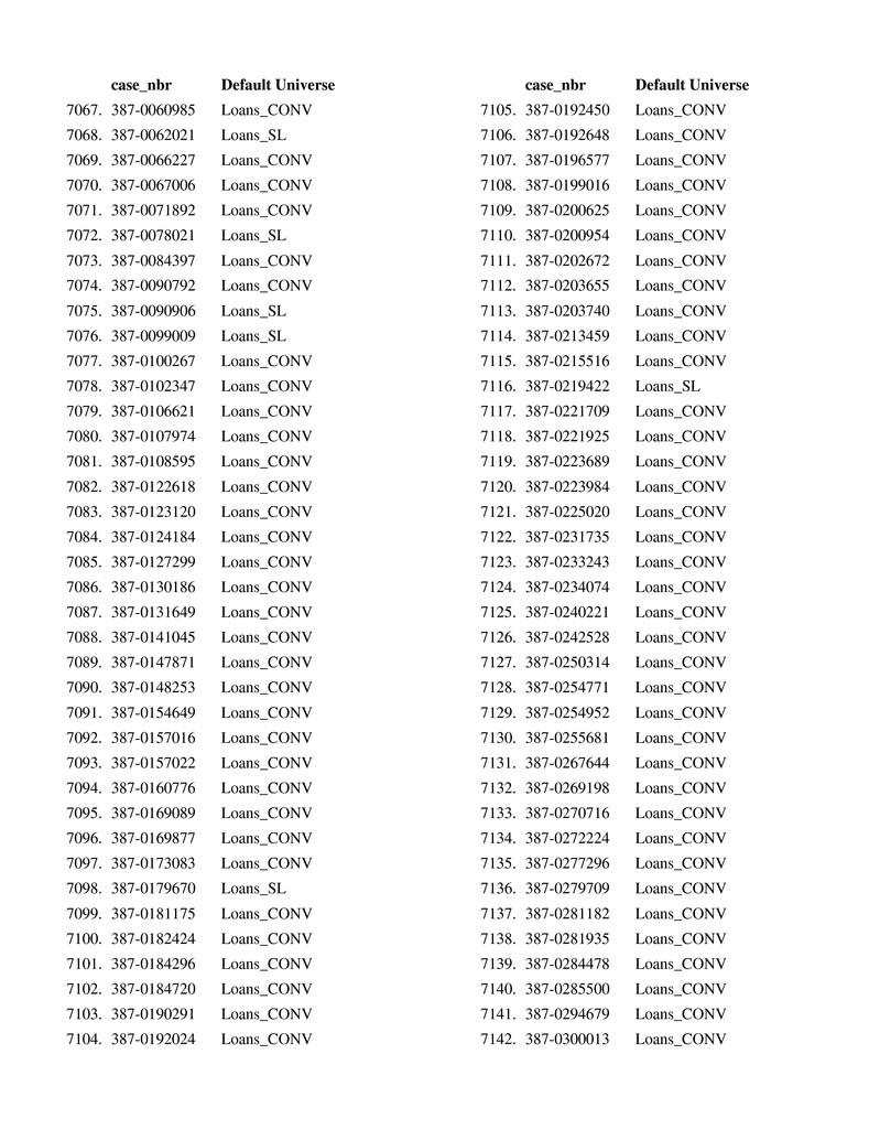 case_nbr Default Universe 7067. 387-0060985 Loans_CONV 7068. 387-0062021 Loans_SL 7069. 387-0066227 Loans_CONV 7070. 387-0067006 Loans_CONV 7071. 387-0071892 Loans_CONV 7072. 387-0078021 Loans_SL 7073. 387-0084397 Loans_CONV 7074. 387-0090792 Loans_CONV 7075. 387-0090906 Loans_SL 7076. 387-0099009 Loans_SL 7077. 387-0100267 Loans_CONV 7078. 387-0102347 Loans_CONV 7079. 387-0106621 Loans_CONV 7080. 387-0107974 Loans_CONV 7081. 387-0108595 Loans_CONV 7082. 387-0122618 Loans_CONV 7083. 387-0123120 Loans_CONV 7084. 387-0124184 Loans_CONV 7085. 387-0127299 Loans_CONV 7086. 387-0130186 Loans_CONV 7087. 387-0131649 Loans_CONV 7088. 387-0141045 Loans_CONV 7089. 387-0147871 Loans_CONV 7090. 387-0148253 Loans_CONV 7091. 387-0154649 Loans_CONV 7092. 387-0157016 Loans_CONV 7093. 387-0157022 Loans_CONV 7094. 387-0160776 Loans_CONV 7095. 387-0169089 Loans_CONV 7096. 387-0169877 Loans_CONV 7097. 387-0173083 Loans_CONV 7098. 387-0179670 Loans_SL 7099. 387-0181175 Loans_CONV 7100. 387-0182424 Loans_CONV 7101. 387-0184296 Loans_CONV 7102. 387-0184720 Loans_CONV 7103. 387-0190291 Loans_CONV 7104. 387-0192024 Loans_CONV case_nbr Default Universe 7105. 387-0192450 Loans_CONV 7106. 387-0192648 Loans_CONV 7107. 387-0196577 Loans_CONV 7108. 387-0199016 Loans_CONV 7109. 387-0200625 Loans_CONV 7110. 387-0200954 Loans_CONV 7111. 387-0202672 Loans_CONV 7112. 387-0203655 Loans_CONV 7113. 387-0203740 Loans_CONV 7114. 387-0213459 Loans_CONV 7115. 387-0215516 Loans_CONV 7116. 387-0219422 Loans_SL 7117. 387-0221709 Loans_CONV 7118. 387-0221925 Loans_CONV 7119. 387-0223689 Loans_CONV 7120. 387-0223984 Loans_CONV 7121. 387-0225020 Loans_CONV 7122. 387-0231735 Loans_CONV 7123. 387-0233243 Loans_CONV 7124. 387-0234074 Loans_CONV 7125. 387-0240221 Loans_CONV 7126. 387-0242528 Loans_CONV 7127. 387-0250314 Loans_CONV 7128. 387-0254771 Loans_CONV 7129. 387-0254952 Loans_CONV 7130. 387-0255681 Loans_CONV 7131. 387-0267644 Loans_CONV 7132. 387-0269198 Loans_CONV 7133. 387-0270716 Loans_CONV 7134. 387-0272224 Loans_CONV 7135. 387-0277296 Loans_CONV 7136. 387-0279709 Loans_CONV 7137. 387-0281182 Loans_CONV 7138. 387-0281935 Loans_CONV 7139. 387-0284478 Loans_CONV 7140. 387-0285500 Loans_CONV 7141. 387-0294679 Loans_CONV 7142. 387-0300013 Loans_CONV