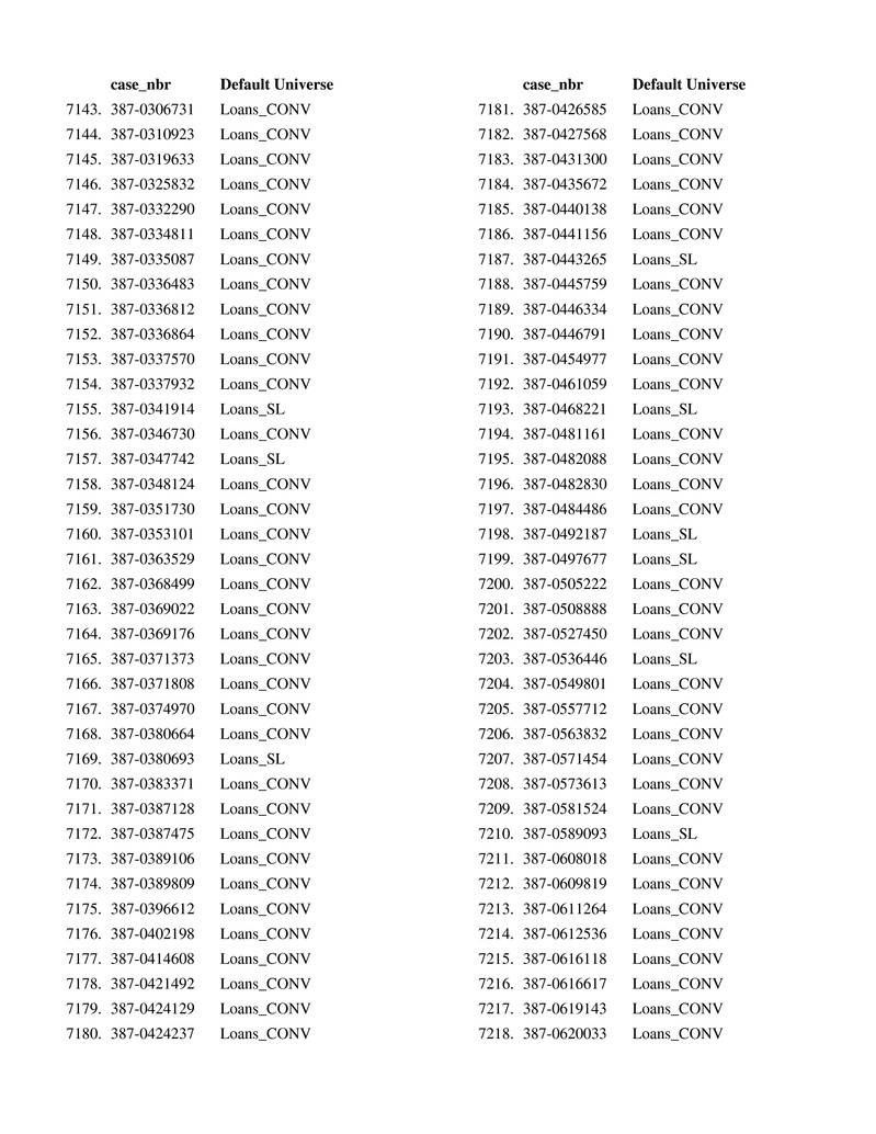 case_nbr Default Universe 7143. 387-0306731 Loans_CONV 7144. 387-0310923 Loans_CONV 7145. 387-0319633 Loans_CONV 7146. 387-0325832 Loans_CONV 7147. 387-0332290 Loans_CONV 7148. 387-0334811 Loans_CONV 7149. 387-0335087 Loans_CONV 7150. 387-0336483 Loans_CONV 7151. 387-0336812 Loans_CONV 7152. 387-0336864 Loans_CONV 7153. 387-0337570 Loans_CONV 7154. 387-0337932 Loans_CONV 7155. 387-0341914 Loans_SL 7156. 387-0346730 Loans_CONV 7157. 387-0347742 Loans_SL 7158. 387-0348124 Loans_CONV 7159. 387-0351730 Loans_CONV 7160. 387-0353101 Loans_CONV 7161. 387-0363529 Loans_CONV 7162. 387-0368499 Loans_CONV 7163. 387-0369022 Loans_CONV 7164. 387-0369176 Loans_CONV 7165. 387-0371373 Loans_CONV 7166. 387-0371808 Loans_CONV 7167. 387-0374970 Loans_CONV 7168. 387-0380664 Loans_CONV 7169. 387-0380693 Loans_SL 7170. 387-0383371 Loans_CONV 7171. 387-0387128 Loans_CONV 7172. 387-0387475 Loans_CONV 7173. 387-0389106 Loans_CONV 7174. 387-0389809 Loans_CONV 7175. 387-0396612 Loans_CONV 7176. 387-0402198 Loans_CONV 7177. 387-0414608 Loans_CONV 7178. 387-0421492 Loans_CONV 7179. 387-0424129 Loans_CONV 7180. 387-0424237 Loans_CONV case_nbr Default Universe 7181. 387-0426585 Loans_CONV 7182. 387-0427568 Loans_CONV 7183. 387-0431300 Loans_CONV 7184. 387-0435672 Loans_CONV 7185. 387-0440138 Loans_CONV 7186. 387-0441156 Loans_CONV 7187. 387-0443265 Loans_SL 7188. 387-0445759 Loans_CONV 7189. 387-0446334 Loans_CONV 7190. 387-0446791 Loans_CONV 7191. 387-0454977 Loans_CONV 7192. 387-0461059 Loans_CONV 7193. 387-0468221 Loans_SL 7194. 387-0481161 Loans_CONV 7195. 387-0482088 Loans_CONV 7196. 387-0482830 Loans_CONV 7197. 387-0484486 Loans_CONV 7198. 387-0492187 Loans_SL 7199. 387-0497677 Loans_SL 7200. 387-0505222 Loans_CONV 7201. 387-0508888 Loans_CONV 7202. 387-0527450 Loans_CONV 7203. 387-0536446 Loans_SL 7204. 387-0549801 Loans_CONV 7205. 387-0557712 Loans_CONV 7206. 387-0563832 Loans_CONV 7207. 387-0571454 Loans_CONV 7208. 387-0573613 Loans_CONV 7209. 387-0581524 Loans_CONV 7210. 387-0589093 Loans_SL 7211. 387-0608018 Loans_CONV 7212. 387-0609819 Loans_CONV 7213. 387-0611264 Loans_CONV 7214. 387-0612536 Loans_CONV 7215. 387-0616118 Loans_CONV 7216. 387-0616617 Loans_CONV 7217. 387-0619143 Loans_CONV 7218. 387-0620033 Loans_CONV