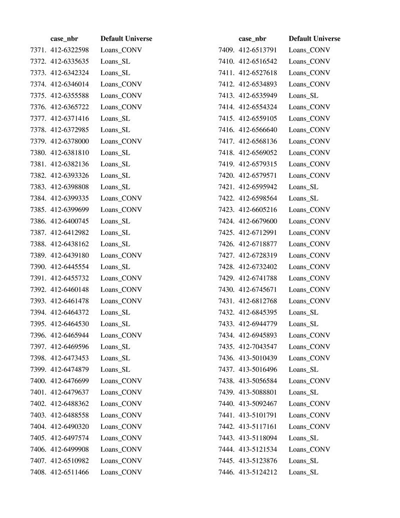 case_nbr Default Universe 7371. 412-6322598 Loans_CONV 7372. 412-6335635 Loans_SL 7373. 412-6342324 Loans_SL 7374. 412-6346014 Loans_CONV 7375. 412-6355588 Loans_CONV 7376. 412-6365722 Loans_CONV 7377. 412-6371416 Loans_SL 7378. 412-6372985 Loans_SL 7379. 412-6378000 Loans_CONV 7380. 412-6381810 Loans_SL 7381. 412-6382136 Loans_SL 7382. 412-6393326 Loans_SL 7383. 412-6398808 Loans_SL 7384. 412-6399335 Loans_CONV 7385. 412-6399699 Loans_CONV 7386. 412-6400745 Loans_SL 7387. 412-6412982 Loans_SL 7388. 412-6438162 Loans_SL 7389. 412-6439180 Loans_CONV 7390. 412-6445554 Loans_SL 7391. 412-6455732 Loans_CONV 7392. 412-6460148 Loans_CONV 7393. 412-6461478 Loans_CONV 7394. 412-6464372 Loans_SL 7395. 412-6464530 Loans_SL 7396. 412-6465944 Loans_CONV 7397. 412-6469596 Loans_SL 7398. 412-6473453 Loans_SL 7399. 412-6474879 Loans_SL 7400. 412-6476699 Loans_CONV 7401. 412-6479637 Loans_CONV 7402. 412-6488362 Loans_CONV 7403. 412-6488558 Loans_CONV 7404. 412-6490320 Loans_CONV 7405. 412-6497574 Loans_CONV 7406. 412-6499908 Loans_CONV 7407. 412-6510982 Loans_CONV 7408. 412-6511466 Loans_CONV case_nbr Default Universe 7409. 412-6513791 Loans_CONV 7410. 412-6516542 Loans_CONV 7411. 412-6527618 Loans_CONV 7412. 412-6534893 Loans_CONV 7413. 412-6535949 Loans_SL 7414. 412-6554324 Loans_CONV 7415. 412-6559105 Loans_CONV 7416. 412-6566640 Loans_CONV 7417. 412-6568136 Loans_CONV 7418. 412-6569052 Loans_CONV 7419. 412-6579315 Loans_CONV 7420. 412-6579571 Loans_CONV 7421. 412-6595942 Loans_SL 7422. 412-6598564 Loans_SL 7423. 412-6605216 Loans_CONV 7424. 412-6679600 Loans_CONV 7425. 412-6712991 Loans_CONV 7426. 412-6718877 Loans_CONV 7427. 412-6728319 Loans_CONV 7428. 412-6732402 Loans_CONV 7429. 412-6741788 Loans_CONV 7430. 412-6745671 Loans_CONV 7431. 412-6812768 Loans_CONV 7432. 412-6845395 Loans_SL 7433. 412-6944779 Loans_SL 7434. 412-6945893 Loans_CONV 7435. 412-7043547 Loans_CONV 7436. 413-5010439 Loans_CONV 7437. 413-5016496 Loans_SL 7438. 413-5056584 Loans_CONV 7439. 413-5088801 Loans_SL 7440. 413-5092467 Loans_CONV 7441. 413-5101791 Loans_CONV 7442. 413-5117161 Loans_CONV 7443. 413-5118094 Loans_SL 7444. 413-5121534 Loans_CONV 7445. 413-5123876 Loans_SL 7446. 413-5124212 Loans_SL
