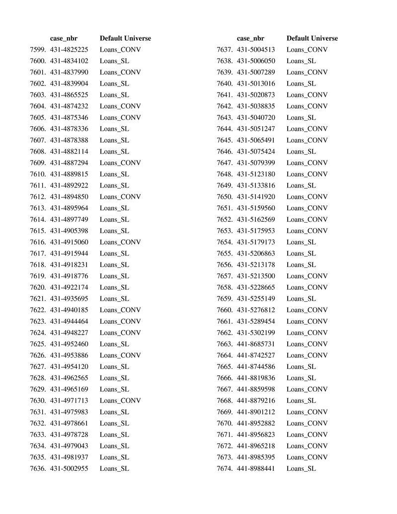 case_nbr Default Universe 7599. 431-4825225 Loans_CONV 7600. 431-4834102 Loans_SL 7601. 431-4837990 Loans_CONV 7602. 431-4839904 Loans_SL 7603. 431-4865525 Loans_SL 7604. 431-4874232 Loans_CONV 7605. 431-4875346 Loans_CONV 7606. 431-4878336 Loans_SL 7607. 431-4878388 Loans_SL 7608. 431-4882114 Loans_SL 7609. 431-4887294 Loans_CONV 7610. 431-4889815 Loans_SL 7611. 431-4892922 Loans_SL 7612. 431-4894850 Loans_CONV 7613. 431-4895964 Loans_SL 7614. 431-4897749 Loans_SL 7615. 431-4905398 Loans_SL 7616. 431-4915060 Loans_CONV 7617. 431-4915944 Loans_SL 7618. 431-4918231 Loans_SL 7619. 431-4918776 Loans_SL 7620. 431-4922174 Loans_SL 7621. 431-4935695 Loans_SL 7622. 431-4940185 Loans_CONV 7623. 431-4944464 Loans_CONV 7624. 431-4948227 Loans_CONV 7625. 431-4952460 Loans_SL 7626. 431-4953886 Loans_CONV 7627. 431-4954120 Loans_SL 7628. 431-4962565 Loans_SL 7629. 431-4965169 Loans_SL 7630. 431-4971713 Loans_CONV 7631. 431-4975983 Loans_SL 7632. 431-4978661 Loans_SL 7633. 431-4978728 Loans_SL 7634. 431-4979043 Loans_SL 7635. 431-4981937 Loans_SL 7636. 431-5002955 Loans_SL case_nbr Default Universe 7637. 431-5004513 Loans_CONV 7638. 431-5006050 Loans_SL 7639. 431-5007289 Loans_CONV 7640. 431-5013016 Loans_SL 7641. 431-5020873 Loans_CONV 7642. 431-5038835 Loans_CONV 7643. 431-5040720 Loans_SL 7644. 431-5051247 Loans_CONV 7645. 431-5065491 Loans_CONV 7646. 431-5075424 Loans_SL 7647. 431-5079399 Loans_CONV 7648. 431-5123180 Loans_CONV 7649. 431-5133816 Loans_SL 7650. 431-5141920 Loans_CONV 7651. 431-5159560 Loans_CONV 7652. 431-5162569 Loans_CONV 7653. 431-5175953 Loans_CONV 7654. 431-5179173 Loans_SL 7655. 431-5206863 Loans_SL 7656. 431-5213178 Loans_SL 7657. 431-5213500 Loans_CONV 7658. 431-5228665 Loans_CONV 7659. 431-5255149 Loans_SL 7660. 431-5276812 Loans_CONV 7661. 431-5289454 Loans_CONV 7662. 431-5302199 Loans_CONV 7663. 441-8685731 Loans_CONV 7664. 441-8742527 Loans_CONV 7665. 441-8744586 Loans_SL 7666. 441-8819836 Loans_SL 7667. 441-8859598 Loans_CONV 7668. 441-8879216 Loans_SL 7669. 441-8901212 Loans_CONV 7670. 441-8952882 Loans_CONV 7671. 441-8956823 Loans_CONV 7672. 441-8965218 Loans_CONV 7673. 441-8985395 Loans_CONV 7674. 441-8988441 Loans_SL
