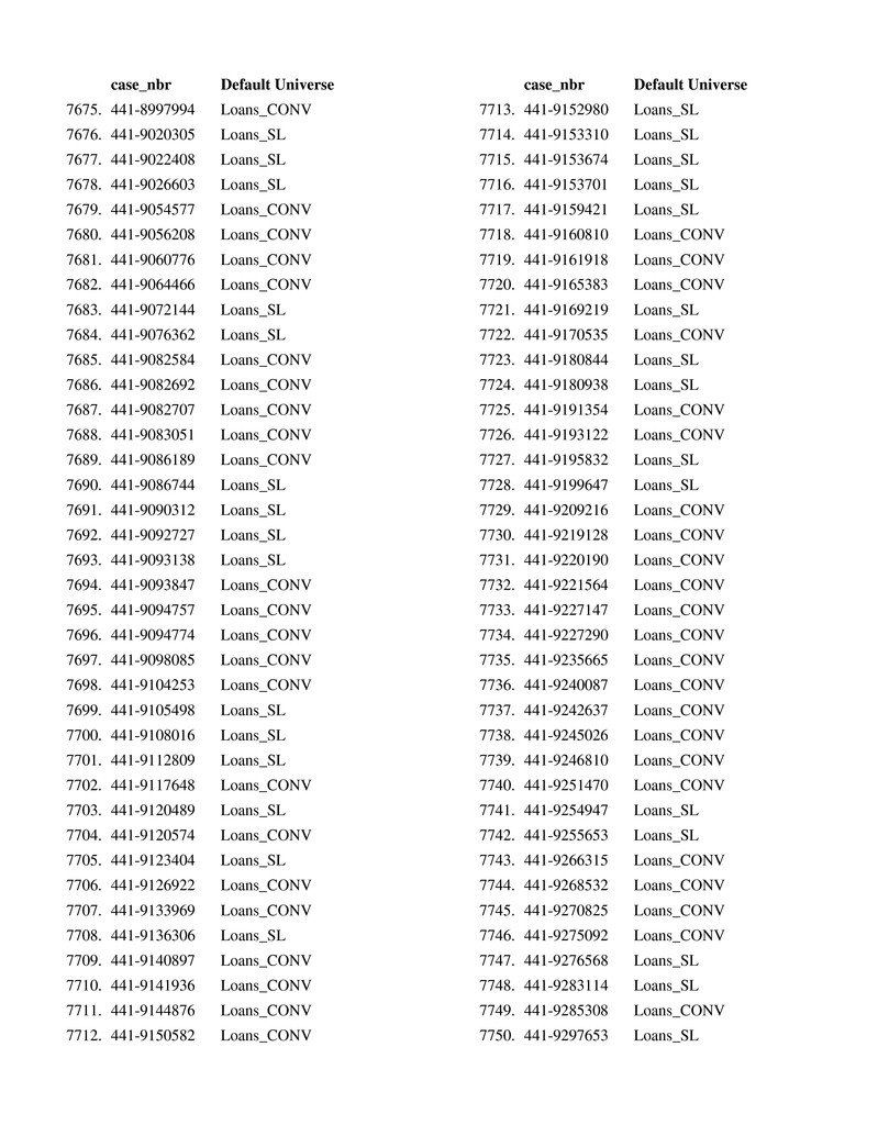 case_nbr Default Universe 7675. 441-8997994 Loans_CONV 7676. 441-9020305 Loans_SL 7677. 441-9022408 Loans_SL 7678. 441-9026603 Loans_SL 7679. 441-9054577 Loans_CONV 7680. 441-9056208 Loans_CONV 7681. 441-9060776 Loans_CONV 7682. 441-9064466 Loans_CONV 7683. 441-9072144 Loans_SL 7684. 441-9076362 Loans_SL 7685. 441-9082584 Loans_CONV 7686. 441-9082692 Loans_CONV 7687. 441-9082707 Loans_CONV 7688. 441-9083051 Loans_CONV 7689. 441-9086189 Loans_CONV 7690. 441-9086744 Loans_SL 7691. 441-9090312 Loans_SL 7692. 441-9092727 Loans_SL 7693. 441-9093138 Loans_SL 7694. 441-9093847 Loans_CONV 7695. 441-9094757 Loans_CONV 7696. 441-9094774 Loans_CONV 7697. 441-9098085 Loans_CONV 7698. 441-9104253 Loans_CONV 7699. 441-9105498 Loans_SL 7700. 441-9108016 Loans_SL 7701. 441-9112809 Loans_SL 7702. 441-9117648 Loans_CONV 7703. 441-9120489 Loans_SL 7704. 441-9120574 Loans_CONV 7705. 441-9123404 Loans_SL 7706. 441-9126922 Loans_CONV 7707. 441-9133969 Loans_CONV 7708. 441-9136306 Loans_SL 7709. 441-9140897 Loans_CONV 7710. 441-9141936 Loans_CONV 7711. 441-9144876 Loans_CONV 7712. 441-9150582 Loans_CONV case_nbr Default Universe 7713. 441-9152980 Loans_SL 7714. 441-9153310 Loans_SL 7715. 441-9153674 Loans_SL 7716. 441-9153701 Loans_SL 7717. 441-9159421 Loans_SL 7718. 441-9160810 Loans_CONV 7719. 441-9161918 Loans_CONV 7720. 441-9165383 Loans_CONV 7721. 441-9169219 Loans_SL 7722. 441-9170535 Loans_CONV 7723. 441-9180844 Loans_SL 7724. 441-9180938 Loans_SL 7725. 441-9191354 Loans_CONV 7726. 441-9193122 Loans_CONV 7727. 441-9195832 Loans_SL 7728. 441-9199647 Loans_SL 7729. 441-9209216 Loans_CONV 7730. 441-9219128 Loans_CONV 7731. 441-9220190 Loans_CONV 7732. 441-9221564 Loans_CONV 7733. 441-9227147 Loans_CONV 7734. 441-9227290 Loans_CONV 7735. 441-9235665 Loans_CONV 7736. 441-9240087 Loans_CONV 7737. 441-9242637 Loans_CONV 7738. 441-9245026 Loans_CONV 7739. 441-9246810 Loans_CONV 7740. 441-9251470 Loans_CONV 7741. 441-9254947 Loans_SL 7742. 441-9255653 Loans_SL 7743. 441-9266315 Loans_CONV 7744. 441-9268532 Loans_CONV 7745. 441-9270825 Loans_CONV 7746. 441-9275092 Loans_CONV 7747. 441-9276568 Loans_SL 7748. 441-9283114 Loans_SL 7749. 441-9285308 Loans_CONV 7750. 441-9297653 Loans_SL