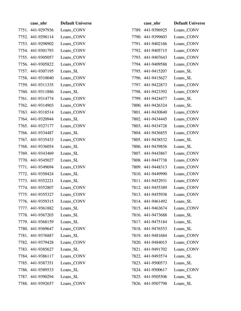 case_nbr Default Universe 7751. 441-9297936 Loans_CONV 7752. 441-9298114 Loans_CONV 7753. 441-9298902 Loans_CONV 7754. 441-9301793 Loans_CONV 7755. 441-9305057 Loans_CONV 7756. 441-9305822 Loans_CONV 7757. 441-9307195 Loans_SL 7758. 441-9310040 Loans_CONV 7759. 441-9311335 Loans_CONV 7760. 441-9311886 Loans_SL 7761. 441-9314774 Loans_CONV 7762. 441-9314903 Loans_CONV 7763. 441-9318514 Loans_CONV 7764. 441-9320944 Loans_SL 7765. 441-9327177 Loans_CONV 7766. 441-9334487 Loans_SL 7767. 441-9335433 Loans_CONV 7768. 441-9336054 Loans_SL 7769. 441-9343469 Loans_SL 7770. 441-9345027 Loans_SL 7771. 441-9349694 Loans_CONV 7772. 441-9350424 Loans_SL 7773. 441-9352221 Loans_SL 7774. 441-9352807 Loans_CONV 7775. 441-9355327 Loans_CONV 7776. 441-9359315 Loans_CONV 7777. 441-9361882 Loans_SL 7778. 441-9367203 Loans_SL 7779. 441-9368159 Loans_SL 7780. 441-9369647 Loans_CONV 7781. 441-9376887 Loans_SL 7782. 441-9379428 Loans_CONV 7783. 441-9385627 Loans_SL 7784. 441-9386117 Loans_CONV 7785. 441-9387351 Loans_CONV 7786. 441-9389533 Loans_SL 7787. 441-9390294 Loans_SL 7788. 441-9392657 Loans_CONV case_nbr Default Universe 7789. 441-9396925 Loans_CONV 7790. 441-9399603 Loans_CONV 7791. 441-9402166 Loans_CONV 7792. 441-9405715 Loans_CONV 7793. 441-9407643 Loans_CONV 7794. 441-9409588 Loans_CONV 7795. 441-9415207 Loans_SL 7796. 441-9415627 Loans_SL 7797. 441-9422873 Loans_CONV 7798. 441-9423392 Loans_CONV 7799. 441-9424477 Loans_SL 7800. 441-9426324 Loans_SL 7801. 441-9430840 Loans_CONV 7802. 441-9434445 Loans_CONV 7803. 441-9434728 Loans_CONV 7804. 441-9436855 Loans_CONV 7805. 441-9438532 Loans_SL 7806. 441-9439856 Loans_SL 7807. 441-9443867 Loans_CONV 7808. 441-9447738 Loans_CONV 7809. 441-9448313 Loans_CONV 7810. 441-9449990 Loans_CONV 7811. 441-9452931 Loans_CONV 7812. 441-9455389 Loans_CONV 7813. 441-9455938 Loans_CONV 7814. 441-9461492 Loans_SL 7815. 441-9463674 Loans_CONV 7816. 441-9473688 Loans_SL 7817. 441-9475184 Loans_SL 7818. 441-9476553 Loans_SL 7819. 441-9481684 Loans_CONV 7820. 441-9484015 Loans_CONV 7821. 441-9491702 Loans_CONV 7822. 441-9493574 Loans_SL 7823. 441-9500573 Loans_SL 7824. 441-9500617 Loans_CONV 7825. 441-9505506 Loans_SL 7826. 441-9507798 Loans_SL