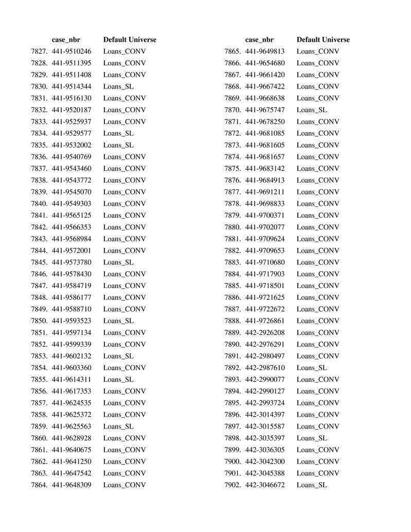 case_nbr Default Universe 7827. 441-9510246 Loans_CONV 7828. 441-9511395 Loans_CONV 7829. 441-9511408 Loans_CONV 7830. 441-9514344 Loans_SL 7831. 441-9516130 Loans_CONV 7832. 441-9520187 Loans_CONV 7833. 441-9525937 Loans_CONV 7834. 441-9529577 Loans_SL 7835. 441-9532002 Loans_SL 7836. 441-9540769 Loans_CONV 7837. 441-9543460 Loans_CONV 7838. 441-9543772 Loans_CONV 7839. 441-9545070 Loans_CONV 7840. 441-9549303 Loans_CONV 7841. 441-9565125 Loans_CONV 7842. 441-9566353 Loans_CONV 7843. 441-9568984 Loans_CONV 7844. 441-9572001 Loans_CONV 7845. 441-9573780 Loans_SL 7846. 441-9578430 Loans_CONV 7847. 441-9584719 Loans_CONV 7848. 441-9586177 Loans_CONV 7849. 441-9588710 Loans_CONV 7850. 441-9593523 Loans_SL 7851. 441-9597134 Loans_CONV 7852. 441-9599339 Loans_CONV 7853. 441-9602132 Loans_SL 7854. 441-9603360 Loans_CONV 7855. 441-9614311 Loans_SL 7856. 441-9617353 Loans_CONV 7857. 441-9624535 Loans_CONV 7858. 441-9625372 Loans_CONV 7859. 441-9625563 Loans_SL 7860. 441-9628928 Loans_CONV 7861. 441-9640675 Loans_CONV 7862. 441-9641250 Loans_CONV 7863. 441-9647542 Loans_CONV 7864. 441-9648309 Loans_CONV case_nbr Default Universe 7865. 441-9649813 Loans_CONV 7866. 441-9654680 Loans_CONV 7867. 441-9661420 Loans_CONV 7868. 441-9667422 Loans_CONV 7869. 441-9668638 Loans_CONV 7870. 441-9675747 Loans_SL 7871. 441-9678250 Loans_CONV 7872. 441-9681085 Loans_CONV 7873. 441-9681605 Loans_CONV 7874. 441-9681657 Loans_CONV 7875. 441-9683142 Loans_CONV 7876. 441-9684913 Loans_CONV 7877. 441-9691211 Loans_CONV 7878. 441-9698833 Loans_CONV 7879. 441-9700371 Loans_CONV 7880. 441-9702077 Loans_CONV 7881. 441-9709624 Loans_CONV 7882. 441-9709653 Loans_CONV 7883. 441-9710680 Loans_CONV 7884. 441-9717903 Loans_CONV 7885. 441-9718501 Loans_CONV 7886. 441-9721625 Loans_CONV 7887. 441-9722672 Loans_CONV 7888. 441-9726861 Loans_CONV 7889. 442-2926208 Loans_CONV 7890. 442-2976291 Loans_CONV 7891. 442-2980497 Loans_CONV 7892. 442-2987610 Loans_SL 7893. 442-2990077 Loans_CONV 7894. 442-2990127 Loans_CONV 7895. 442-2993724 Loans_CONV 7896. 442-3014397 Loans_CONV 7897. 442-3015587 Loans_CONV 7898. 442-3035397 Loans_SL 7899. 442-3036305 Loans_CONV 7900. 442-3042300 Loans_CONV 7901. 442-3045388 Loans_CONV 7902. 442-3046672 Loans_SL