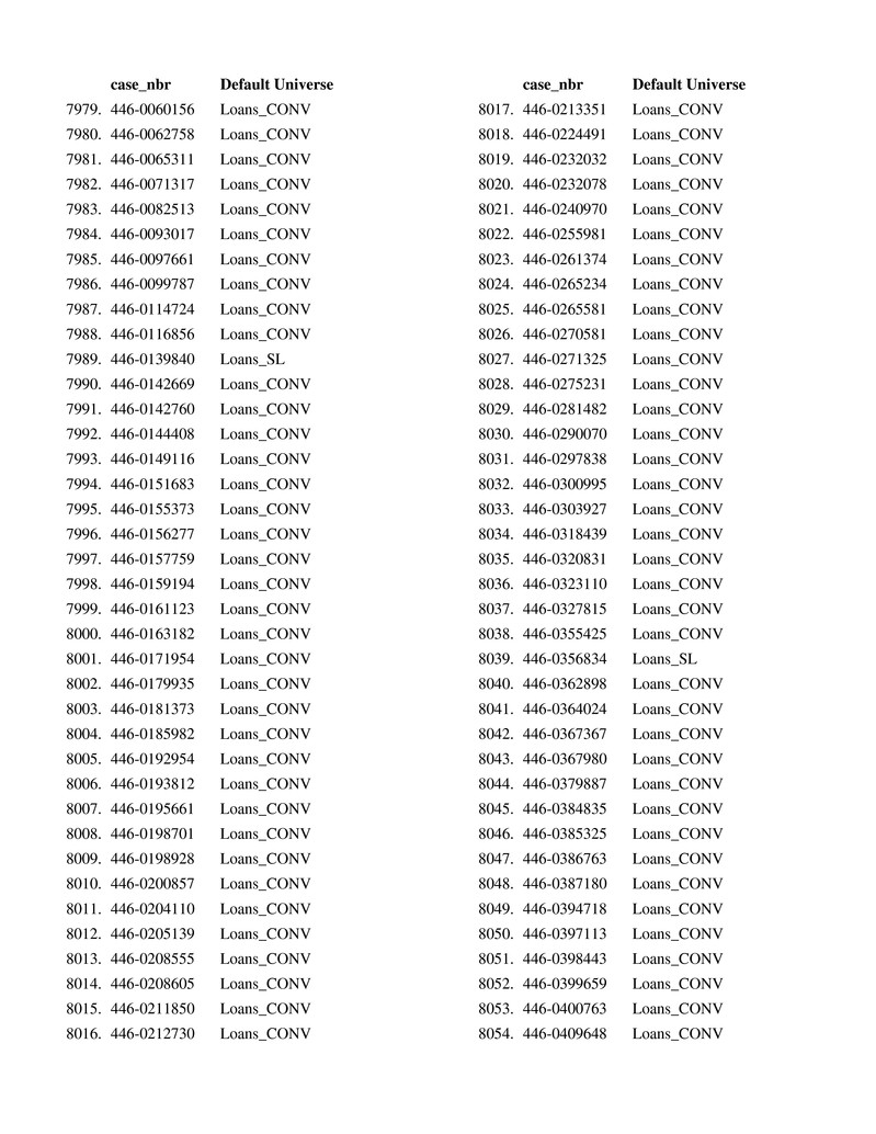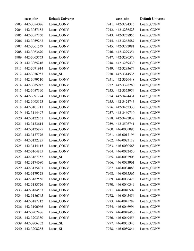 case_nbr Default Universe 7979. 446-0060156 Loans_CONV 7980. 446-0062758 Loans_CONV 7981. 446-0065311 Loans_CONV 7982. 446-0071317 Loans_CONV 7983. 446-0082513 Loans_CONV 7984. 446-0093017 Loans_CONV 7985. 446-0097661 Loans_CONV 7986. 446-0099787 Loans_CONV 7987. 446-0114724 Loans_CONV 7988. 446-0116856 Loans_CONV 7989. 446-0139840 Loans_SL 7990. 446-0142669 Loans_CONV 7991. 446-0142760 Loans_CONV 7992. 446-0144408 Loans_CONV 7993. 446-0149116 Loans_CONV 7994. 446-0151683 Loans_CONV 7995. 446-0155373 Loans_CONV 7996. 446-0156277 Loans_CONV 7997. 446-0157759 Loans_CONV 7998. 446-0159194 Loans_CONV 7999. 446-0161123 Loans_CONV 8000. 446-0163182 Loans_CONV 8001. 446-0171954 Loans_CONV 8002. 446-0179935 Loans_CONV 8003. 446-0181373 Loans_CONV 8004. 446-0185982 Loans_CONV 8005. 446-0192954 Loans_CONV 8006. 446-0193812 Loans_CONV 8007. 446-0195661 Loans_CONV 8008. 446-0198701 Loans_CONV 8009. 446-0198928 Loans_CONV 8010. 446-0200857 Loans_CONV 8011. 446-0204110 Loans_CONV 8012. 446-0205139 Loans_CONV 8013. 446-0208555 Loans_CONV 8014. 446-0208605 Loans_CONV 8015. 446-0211850 Loans_CONV 8016. 446-0212730 Loans_CONV case_nbr Default Universe 8017. 446-0213351 Loans_CONV 8018. 446-0224491 Loans_CONV 8019. 446-0232032 Loans_CONV 8020. 446-0232078 Loans_CONV 8021. 446-0240970 Loans_CONV 8022. 446-0255981 Loans_CONV 8023. 446-0261374 Loans_CONV 8024. 446-0265234 Loans_CONV 8025. 446-0265581 Loans_CONV 8026. 446-0270581 Loans_CONV 8027. 446-0271325 Loans_CONV 8028. 446-0275231 Loans_CONV 8029. 446-0281482 Loans_CONV 8030. 446-0290070 Loans_CONV 8031. 446-0297838 Loans_CONV 8032. 446-0300995 Loans_CONV 8033. 446-0303927 Loans_CONV 8034. 446-0318439 Loans_CONV 8035. 446-0320831 Loans_CONV 8036. 446-0323110 Loans_CONV 8037. 446-0327815 Loans_CONV 8038. 446-0355425 Loans_CONV 8039. 446-0356834 Loans_SL 8040. 446-0362898 Loans_CONV 8041. 446-0364024 Loans_CONV 8042. 446-0367367 Loans_CONV 8043. 446-0367980 Loans_CONV 8044. 446-0379887 Loans_CONV 8045. 446-0384835 Loans_CONV 8046. 446-0385325 Loans_CONV 8047. 446-0386763 Loans_CONV 8048. 446-0387180 Loans_CONV 8049. 446-0394718 Loans_CONV 8050. 446-0397113 Loans_CONV 8051. 446-0398443 Loans_CONV 8052. 446-0399659 Loans_CONV 8053. 446-0400763 Loans_CONV 8054. 446-0409648 Loans_CONV