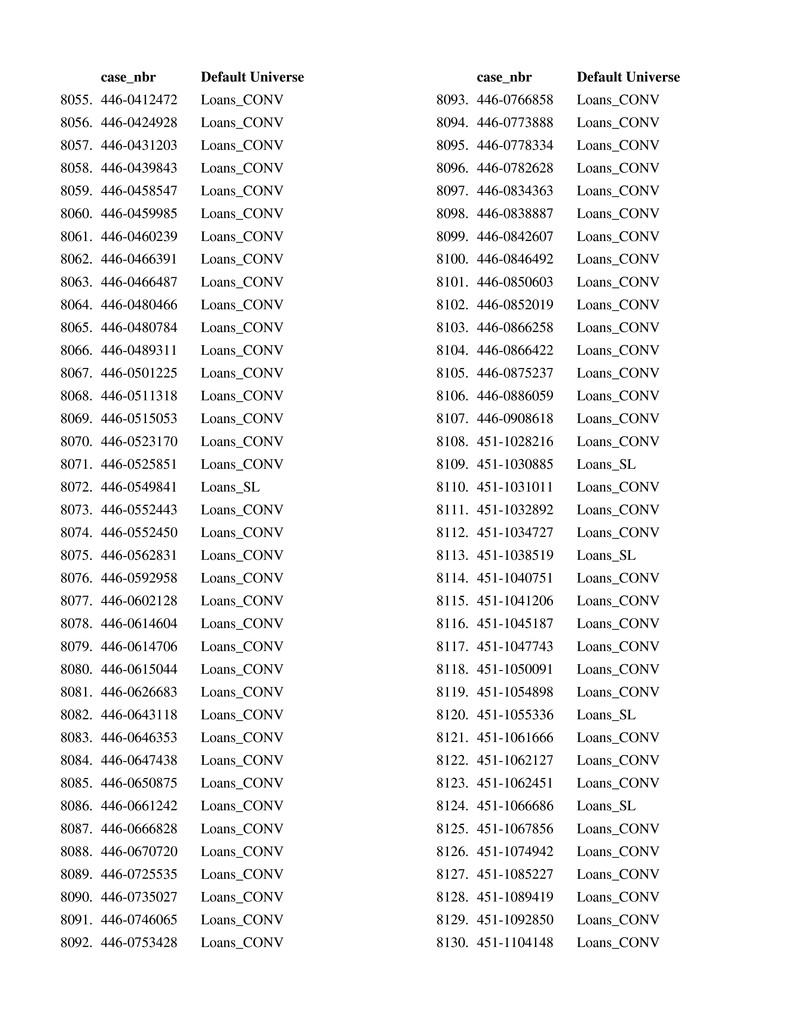 case_nbr Default Universe 8055. 446-0412472 Loans_CONV 8056. 446-0424928 Loans_CONV 8057. 446-0431203 Loans_CONV 8058. 446-0439843 Loans_CONV 8059. 446-0458547 Loans_CONV 8060. 446-0459985 Loans_CONV 8061. 446-0460239 Loans_CONV 8062. 446-0466391 Loans_CONV 8063. 446-0466487 Loans_CONV 8064. 446-0480466 Loans_CONV 8065. 446-0480784 Loans_CONV 8066. 446-0489311 Loans_CONV 8067. 446-0501225 Loans_CONV 8068. 446-0511318 Loans_CONV 8069. 446-0515053 Loans_CONV 8070. 446-0523170 Loans_CONV 8071. 446-0525851 Loans_CONV 8072. 446-0549841 Loans_SL 8073. 446-0552443 Loans_CONV 8074. 446-0552450 Loans_CONV 8075. 446-0562831 Loans_CONV 8076. 446-0592958 Loans_CONV 8077. 446-0602128 Loans_CONV 8078. 446-0614604 Loans_CONV 8079. 446-0614706 Loans_CONV 8080. 446-0615044 Loans_CONV 8081. 446-0626683 Loans_CONV 8082. 446-0643118 Loans_CONV 8083. 446-0646353 Loans_CONV 8084. 446-0647438 Loans_CONV 8085. 446-0650875 Loans_CONV 8086. 446-0661242 Loans_CONV 8087. 446-0666828 Loans_CONV 8088. 446-0670720 Loans_CONV 8089. 446-0725535 Loans_CONV 8090. 446-0735027 Loans_CONV 8091. 446-0746065 Loans_CONV 8092. 446-0753428 Loans_CONV case_nbr Default Universe 8093. 446-0766858 Loans_CONV 8094. 446-0773888 Loans_CONV 8095. 446-0778334 Loans_CONV 8096. 446-0782628 Loans_CONV 8097. 446-0834363 Loans_CONV 8098. 446-0838887 Loans_CONV 8099. 446-0842607 Loans_CONV 8100. 446-0846492 Loans_CONV 8101. 446-0850603 Loans_CONV 8102. 446-0852019 Loans_CONV 8103. 446-0866258 Loans_CONV 8104. 446-0866422 Loans_CONV 8105. 446-0875237 Loans_CONV 8106. 446-0886059 Loans_CONV 8107. 446-0908618 Loans_CONV 8108. 451-1028216 Loans_CONV 8109. 451-1030885 Loans_SL 8110. 451-1031011 Loans_CONV 8111. 451-1032892 Loans_CONV 8112. 451-1034727 Loans_CONV 8113. 451-1038519 Loans_SL 8114. 451-1040751 Loans_CONV 8115. 451-1041206 Loans_CONV 8116. 451-1045187 Loans_CONV 8117. 451-1047743 Loans_CONV 8118. 451-1050091 Loans_CONV 8119. 451-1054898 Loans_CONV 8120. 451-1055336 Loans_SL 8121. 451-1061666 Loans_CONV 8122. 451-1062127 Loans_CONV 8123. 451-1062451 Loans_CONV 8124. 451-1066686 Loans_SL 8125. 451-1067856 Loans_CONV 8126. 451-1074942 Loans_CONV 8127. 451-1085227 Loans_CONV 8128. 451-1089419 Loans_CONV 8129. 451-1092850 Loans_CONV 8130. 451-1104148 Loans_CONV