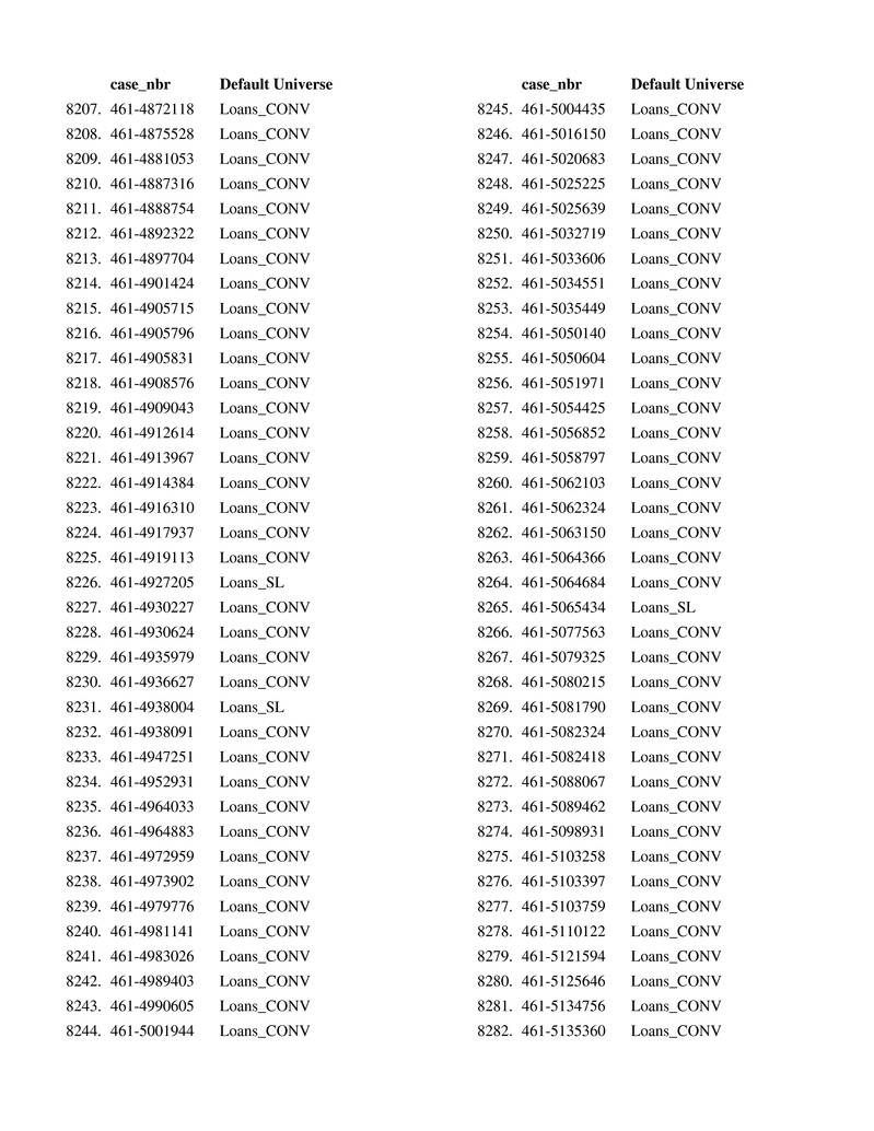 case_nbr Default Universe 8207. 461-4872118 Loans_CONV 8208. 461-4875528 Loans_CONV 8209. 461-4881053 Loans_CONV 8210. 461-4887316 Loans_CONV 8211. 461-4888754 Loans_CONV 8212. 461-4892322 Loans_CONV 8213. 461-4897704 Loans_CONV 8214. 461-4901424 Loans_CONV 8215. 461-4905715 Loans_CONV 8216. 461-4905796 Loans_CONV 8217. 461-4905831 Loans_CONV 8218. 461-4908576 Loans_CONV 8219. 461-4909043 Loans_CONV 8220. 461-4912614 Loans_CONV 8221. 461-4913967 Loans_CONV 8222. 461-4914384 Loans_CONV 8223. 461-4916310 Loans_CONV 8224. 461-4917937 Loans_CONV 8225. 461-4919113 Loans_CONV 8226. 461-4927205 Loans_SL 8227. 461-4930227 Loans_CONV 8228. 461-4930624 Loans_CONV 8229. 461-4935979 Loans_CONV 8230. 461-4936627 Loans_CONV 8231. 461-4938004 Loans_SL 8232. 461-4938091 Loans_CONV 8233. 461-4947251 Loans_CONV 8234. 461-4952931 Loans_CONV 8235. 461-4964033 Loans_CONV 8236. 461-4964883 Loans_CONV 8237. 461-4972959 Loans_CONV 8238. 461-4973902 Loans_CONV 8239. 461-4979776 Loans_CONV 8240. 461-4981141 Loans_CONV 8241. 461-4983026 Loans_CONV 8242. 461-4989403 Loans_CONV 8243. 461-4990605 Loans_CONV 8244. 461-5001944 Loans_CONV case_nbr Default Universe 8245. 461-5004435 Loans_CONV 8246. 461-5016150 Loans_CONV 8247. 461-5020683 Loans_CONV 8248. 461-5025225 Loans_CONV 8249. 461-5025639 Loans_CONV 8250. 461-5032719 Loans_CONV 8251. 461-5033606 Loans_CONV 8252. 461-5034551 Loans_CONV 8253. 461-5035449 Loans_CONV 8254. 461-5050140 Loans_CONV 8255. 461-5050604 Loans_CONV 8256. 461-5051971 Loans_CONV 8257. 461-5054425 Loans_CONV 8258. 461-5056852 Loans_CONV 8259. 461-5058797 Loans_CONV 8260. 461-5062103 Loans_CONV 8261. 461-5062324 Loans_CONV 8262. 461-5063150 Loans_CONV 8263. 461-5064366 Loans_CONV 8264. 461-5064684 Loans_CONV 8265. 461-5065434 Loans_SL 8266. 461-5077563 Loans_CONV 8267. 461-5079325 Loans_CONV 8268. 461-5080215 Loans_CONV 8269. 461-5081790 Loans_CONV 8270. 461-5082324 Loans_CONV 8271. 461-5082418 Loans_CONV 8272. 461-5088067 Loans_CONV 8273. 461-5089462 Loans_CONV 8274. 461-5098931 Loans_CONV 8275. 461-5103258 Loans_CONV 8276. 461-5103397 Loans_CONV 8277. 461-5103759 Loans_CONV 8278. 461-5110122 Loans_CONV 8279. 461-5121594 Loans_CONV 8280. 461-5125646 Loans_CONV 8281. 461-5134756 Loans_CONV 8282. 461-5135360 Loans_CONV
