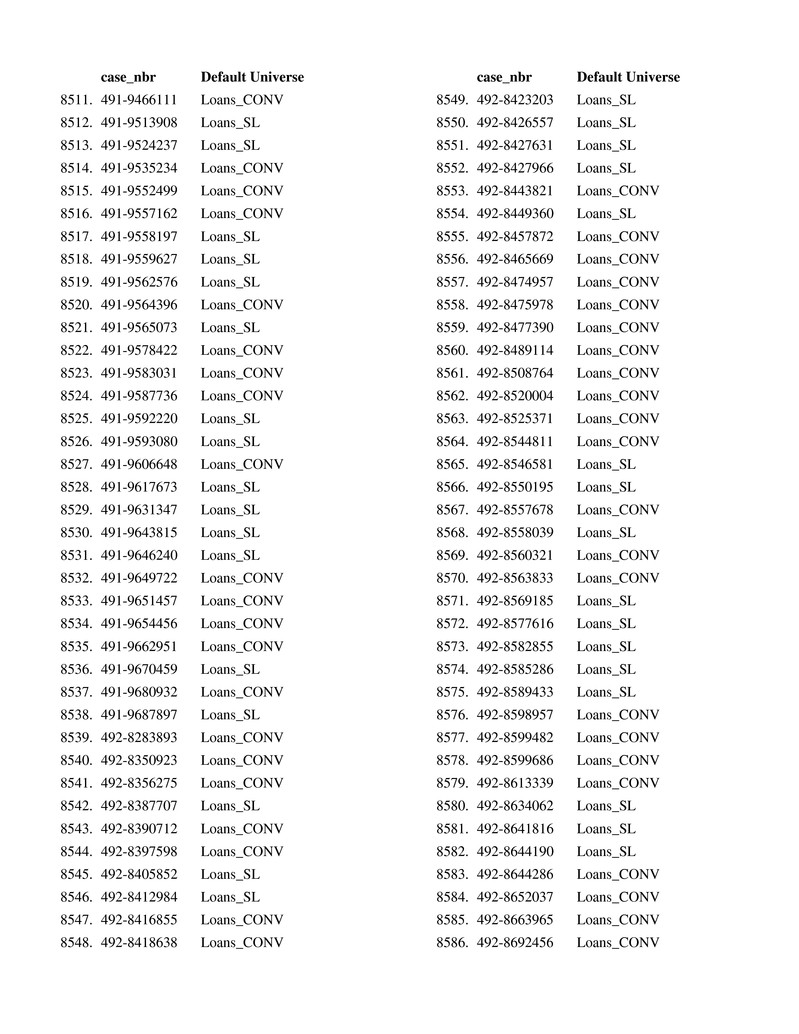 case_nbr Default Universe 8511. 491-9466111 Loans_CONV 8512. 491-9513908 Loans_SL 8513. 491-9524237 Loans_SL 8514. 491-9535234 Loans_CONV 8515. 491-9552499 Loans_CONV 8516. 491-9557162 Loans_CONV 8517. 491-9558197 Loans_SL 8518. 491-9559627 Loans_SL 8519. 491-9562576 Loans_SL 8520. 491-9564396 Loans_CONV 8521. 491-9565073 Loans_SL 8522. 491-9578422 Loans_CONV 8523. 491-9583031 Loans_CONV 8524. 491-9587736 Loans_CONV 8525. 491-9592220 Loans_SL 8526. 491-9593080 Loans_SL 8527. 491-9606648 Loans_CONV 8528. 491-9617673 Loans_SL 8529. 491-9631347 Loans_SL 8530. 491-9643815 Loans_SL 8531. 491-9646240 Loans_SL 8532. 491-9649722 Loans_CONV 8533. 491-9651457 Loans_CONV 8534. 491-9654456 Loans_CONV 8535. 491-9662951 Loans_CONV 8536. 491-9670459 Loans_SL 8537. 491-9680932 Loans_CONV 8538. 491-9687897 Loans_SL 8539. 492-8283893 Loans_CONV 8540. 492-8350923 Loans_CONV 8541. 492-8356275 Loans_CONV 8542. 492-8387707 Loans_SL 8543. 492-8390712 Loans_CONV 8544. 492-8397598 Loans_CONV 8545. 492-8405852 Loans_SL 8546. 492-8412984 Loans_SL 8547. 492-8416855 Loans_CONV 8548. 492-8418638 Loans_CONV case_nbr Default Universe 8549. 492-8423203 Loans_SL 8550. 492-8426557 Loans_SL 8551. 492-8427631 Loans_SL 8552. 492-8427966 Loans_SL 8553. 492-8443821 Loans_CONV 8554. 492-8449360 Loans_SL 8555. 492-8457872 Loans_CONV 8556. 492-8465669 Loans_CONV 8557. 492-8474957 Loans_CONV 8558. 492-8475978 Loans_CONV 8559. 492-8477390 Loans_CONV 8560. 492-8489114 Loans_CONV 8561. 492-8508764 Loans_CONV 8562. 492-8520004 Loans_CONV 8563. 492-8525371 Loans_CONV 8564. 492-8544811 Loans_CONV 8565. 492-8546581 Loans_SL 8566. 492-8550195 Loans_SL 8567. 492-8557678 Loans_CONV 8568. 492-8558039 Loans_SL 8569. 492-8560321 Loans_CONV 8570. 492-8563833 Loans_CONV 8571. 492-8569185 Loans_SL 8572. 492-8577616 Loans_SL 8573. 492-8582855 Loans_SL 8574. 492-8585286 Loans_SL 8575. 492-8589433 Loans_SL 8576. 492-8598957 Loans_CONV 8577. 492-8599482 Loans_CONV 8578. 492-8599686 Loans_CONV 8579. 492-8613339 Loans_CONV 8580. 492-8634062 Loans_SL 8581. 492-8641816 Loans_SL 8582. 492-8644190 Loans_SL 8583. 492-8644286 Loans_CONV 8584. 492-8652037 Loans_CONV 8585. 492-8663965 Loans_CONV 8586. 492-8692456 Loans_CONV